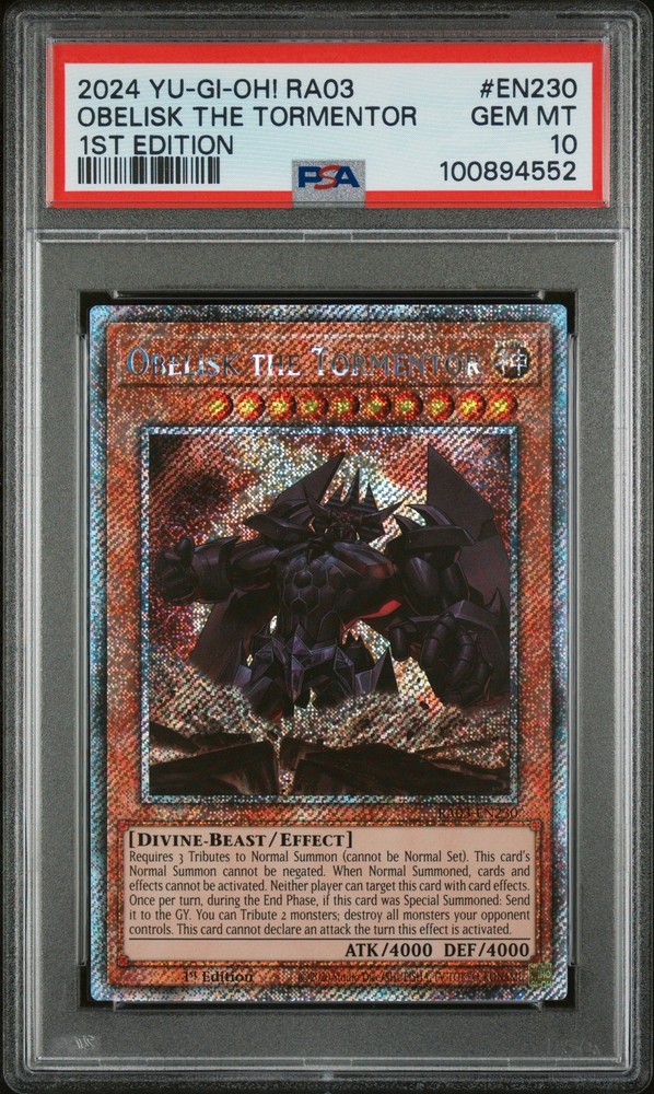2024 YU-GI-OH! RA03-QUARTER CENTURY BONANZA 1ST EDITION #EN230 OBELISK THE TORMENTOR PSA 10 2024 YU-GI-OH! RA03-QUARTER CENTURY BONANZA 1ST EDITION #EN230 OBELISK THE TORMENTOR PSA 10 Purchase Info Thank you for your interest in this item consigned with PSA! By purchasing or making an offer on this item, you acknowledge and agree to the following terms: All sales are final. Returns not accepted. Payment must be made upon purchase of the item. All items are sold "as is" and without warranty of Collectors Universe, Inc. (d/b/a PSA), and ANY AND ALL IMPLIED WARRANTIES ARE DISCLAIMED AND EXCLUDED. Sales tax may apply depending on shipping address. PSA does not guarantee that another third-party grading company's authentication or certification of an item as genuine is correct or accurate. Neither a difference of opinion between third-party grading companies about authenticity, nor a company's subsequent reversal of its earlier authentication or certification of an item, will be a basis for rescinding a sale. Any dispute with another third-party grading company relating to the authenticity of an item must be resolved directly with that other company. Collectors' maximum liability in the event of loss or damage to an item during shipping will be the lesser of (a) the price paid for the item and (b) the change in fair market value of the item. You release Collectors from all other liability including for any claims of punitive damages, emotional distress, consequential damages, lost profits, or lost interest, except as prohibited by law. Shipping Purchased Items will be shipped directly from PSA Vault. You stay hands-free. PSA Vault When you purchase this item, you can save on sales tax and selling fees by keeping it in the PSA Vault, official Vault of eBay. Items already in PSA Vault and will be sent to PSA Vault will have no shipping charge Storage of any items with the PSA Vault will be subject to the PSA Vault Terms of Service. Consignment PSA has competitive rates on the world's largest collectibles marketplace with the option to list from the PSA Vault or immediately after PSA authentication and grading. Sale Price Under $100 $100 - $499 $500 - $999 $1,000 - $2,499 $2,500 - $4,999 $5,000+ Seller Fee 16% 14% 13% 10% 9% 7% Sellers pay a single fee as reflected above; no additional eBay fees are incurred. There is a $5 minimum fee on sold items.