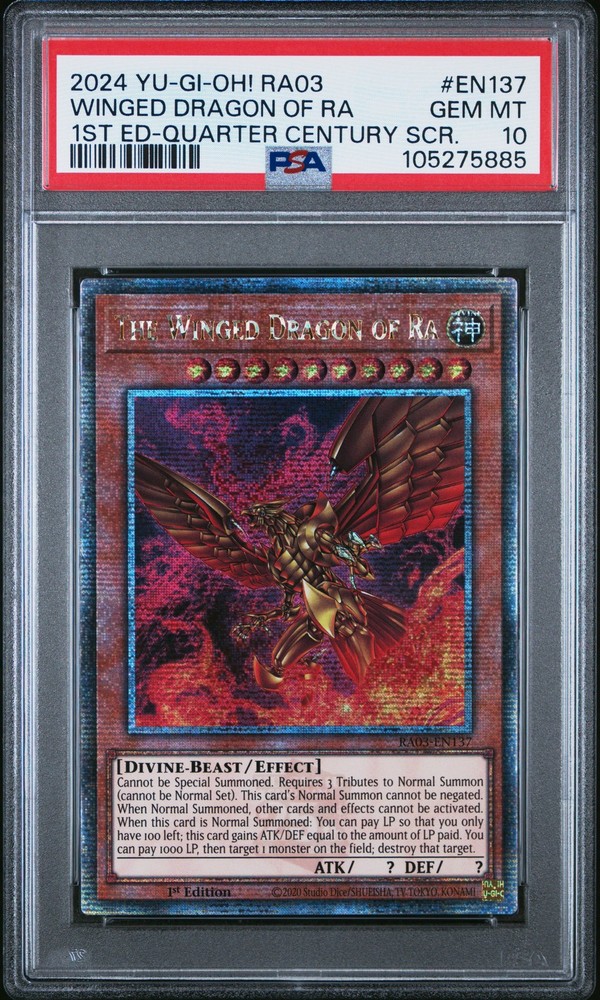 2024 YU-GI-OH! RA03-QUARTER CENTURY BONANZA 1ST EDITION-QUARTER CENTURY SECRET RARE #EN137 THE WINGED DRAGON OF RA PSA 10 2024 YU-GI-OH! RA03-QUARTER CENTURY BONANZA 1ST EDITION-QUARTER CENTURY SECRET RARE #EN137 THE WINGED DRAGON OF RA PSA 10 Purchase Info Thank you for your interest in this item consigned with PSA! By purchasing or making an offer on this item, you acknowledge and agree to the following terms: All sales are final. Returns not accepted. Payment must be made upon purchase of the item. All items are sold "as is" and without warranty of Collectors Universe, Inc. (d/b/a PSA), and ANY AND ALL IMPLIED WARRANTIES ARE DISCLAIMED AND EXCLUDED. Sales tax may apply depending on shipping address. PSA does not guarantee that another third-party grading company's authentication or certification of an item as genuine is correct or accurate. Neither a difference of opinion between third-party grading companies about authenticity, nor a company's subsequent reversal of its earlier authentication or certification of an item, will be a basis for rescinding a sale. Any dispute with another third-party grading company relating to the authenticity of an item must be resolved directly with that other company. Collectors' maximum liability in the event of loss or damage to an item during shipping will be the lesser of (a) the price paid for the item and (b) the change in fair market value of the item. You release Collectors from all other liability including for any claims of punitive damages, emotional distress, consequential damages, lost profits, or lost interest, except as prohibited by law. Shipping Purchased Items will be shipped directly from PSA Vault. You stay hands-free. PSA Vault When you purchase this item, you can save on sales tax and selling fees by keeping it in the PSA Vault, official Vault of eBay. Items already in PSA Vault and will be sent to PSA Vault will have no shipping charge Storage of any items with the PSA Vault will be subject to the PSA Vault Terms of Service. Consignment PSA has competitive rates on the world's largest collectibles marketplace with the option to list from the PSA Vault or immediately after PSA authentication and grading. Sale Price Under $100 $100 - $499 $500 - $999 $1,000 - $2,499 $2,500 - $4,999 $5,000+ Seller Fee 16% 14% 13% 10% 9% 7% Sellers pay a single fee as reflected above; no additional eBay fees are incurred. There is a $5 minimum fee on sold items.