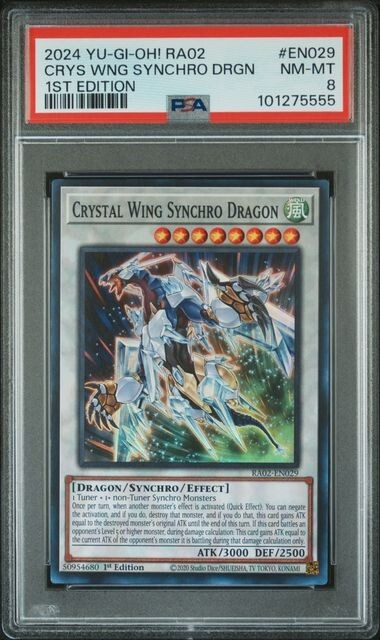 2024 YuGiOh! RA02 Crystal Wing Synchro Dragon 1st Ed. #EN029 PSA 8 NM-MT! Card ships quickly, safely and securely to protect your investment. Please check out and follow my store, CollectorsUniverseLLC, for more PSA slabs and new inventory. Find us on YouTube at: https://www.youtube.com/channel/UC3fbICk1DqNeyenKfx57pYA Find us on WhatNot at: https://whatnot.com/invite/patalac206