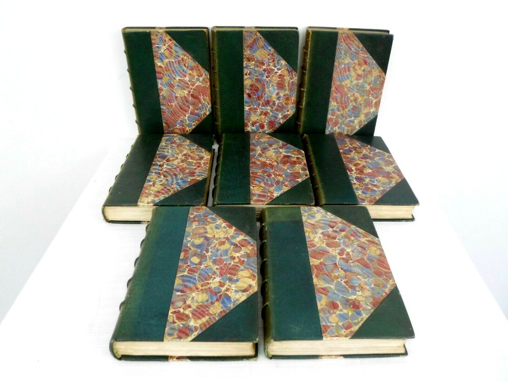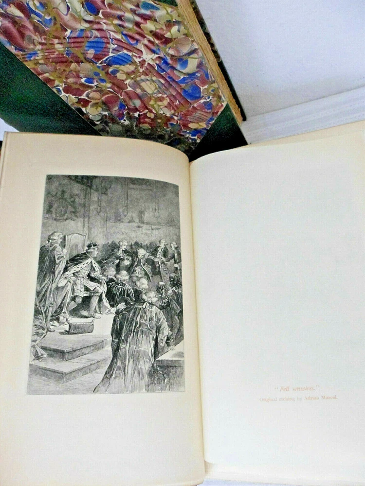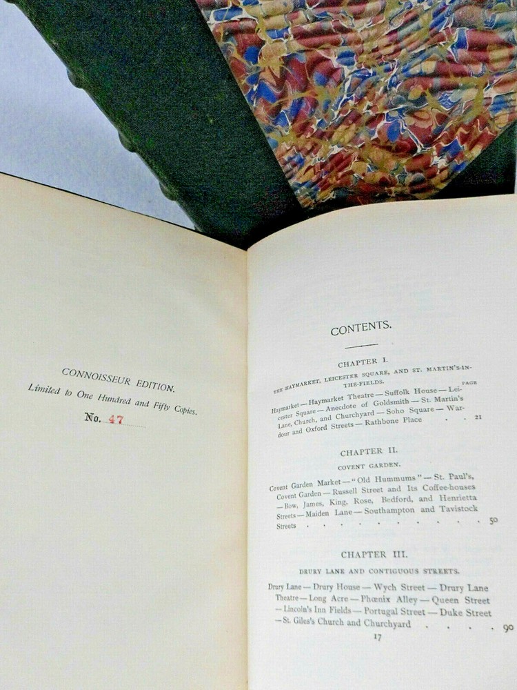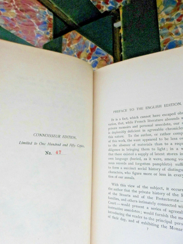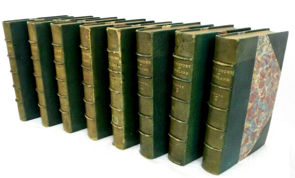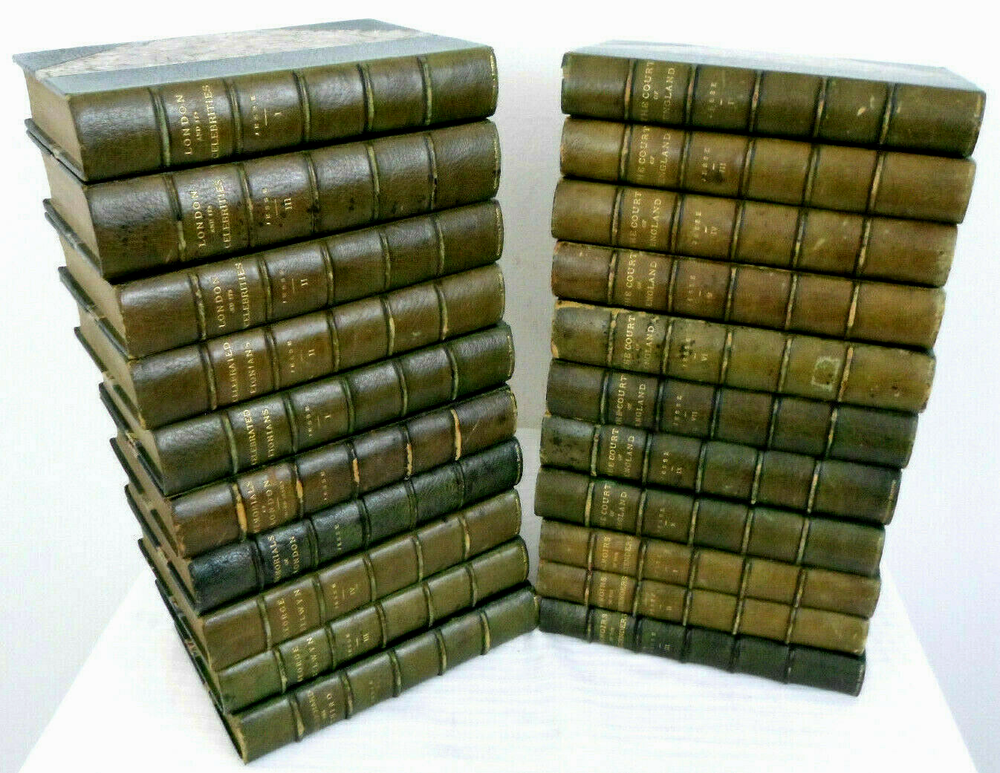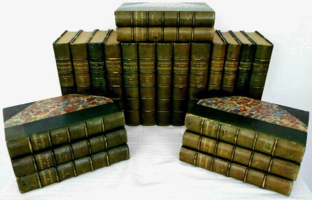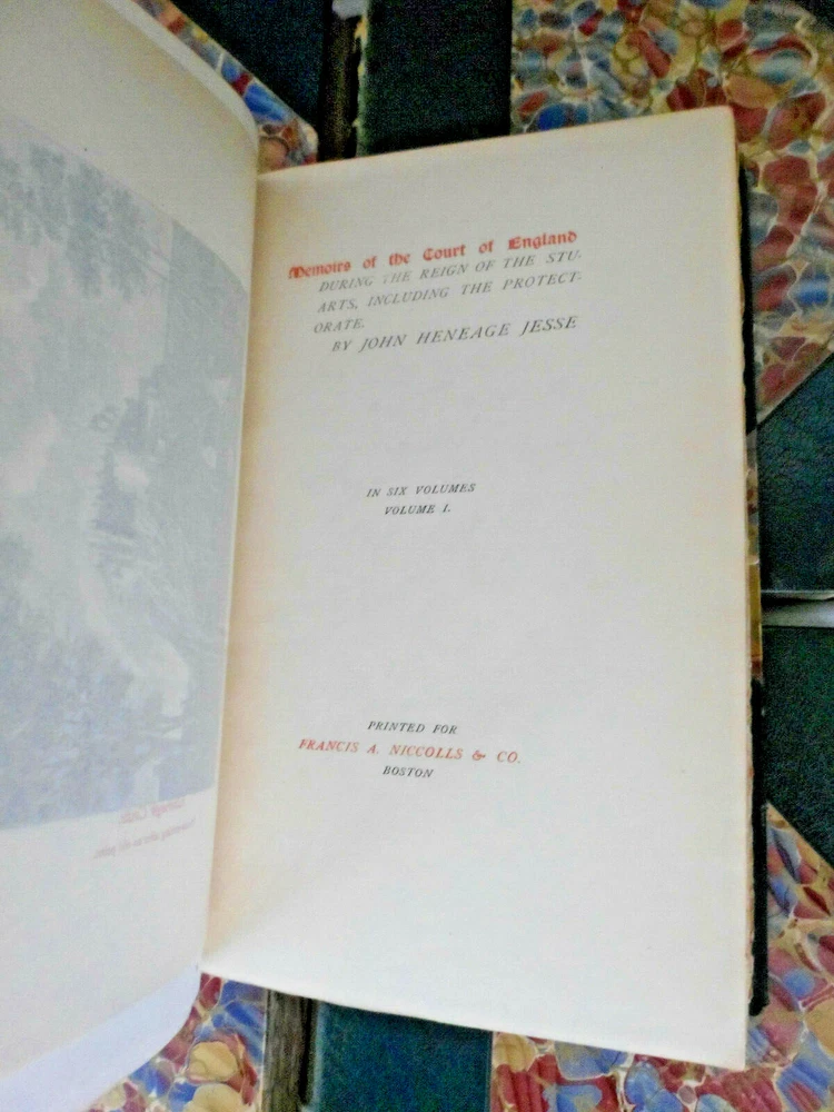 21 VOLUMES - JOHN HENEAGE JESSE: The Court of England (8 vols.), London and It's Celebrities (3 vols.), Memorials of London (2 vols.), Celebrated Etonians (2 vols.), Memoirs of the Pretenders (3 vols.), George Selwyn (2 vols.), and King Richard the Third (1 vol.). Limited Connoisseur Edition. The set is Number 47 out of 150 copies. 3/4 leather-bound with marbled end papers and paste downs. Each book measures 9" x 6". Published by Francis A. Niccolls & Co., Boston, 1901. The 21 Limited Edition leather bound books are all in very good condition. Very clean with no markings and tightly bound. Thank you for viewing and please have a look at the other items for sale in my store at ScottyJoesBooks.