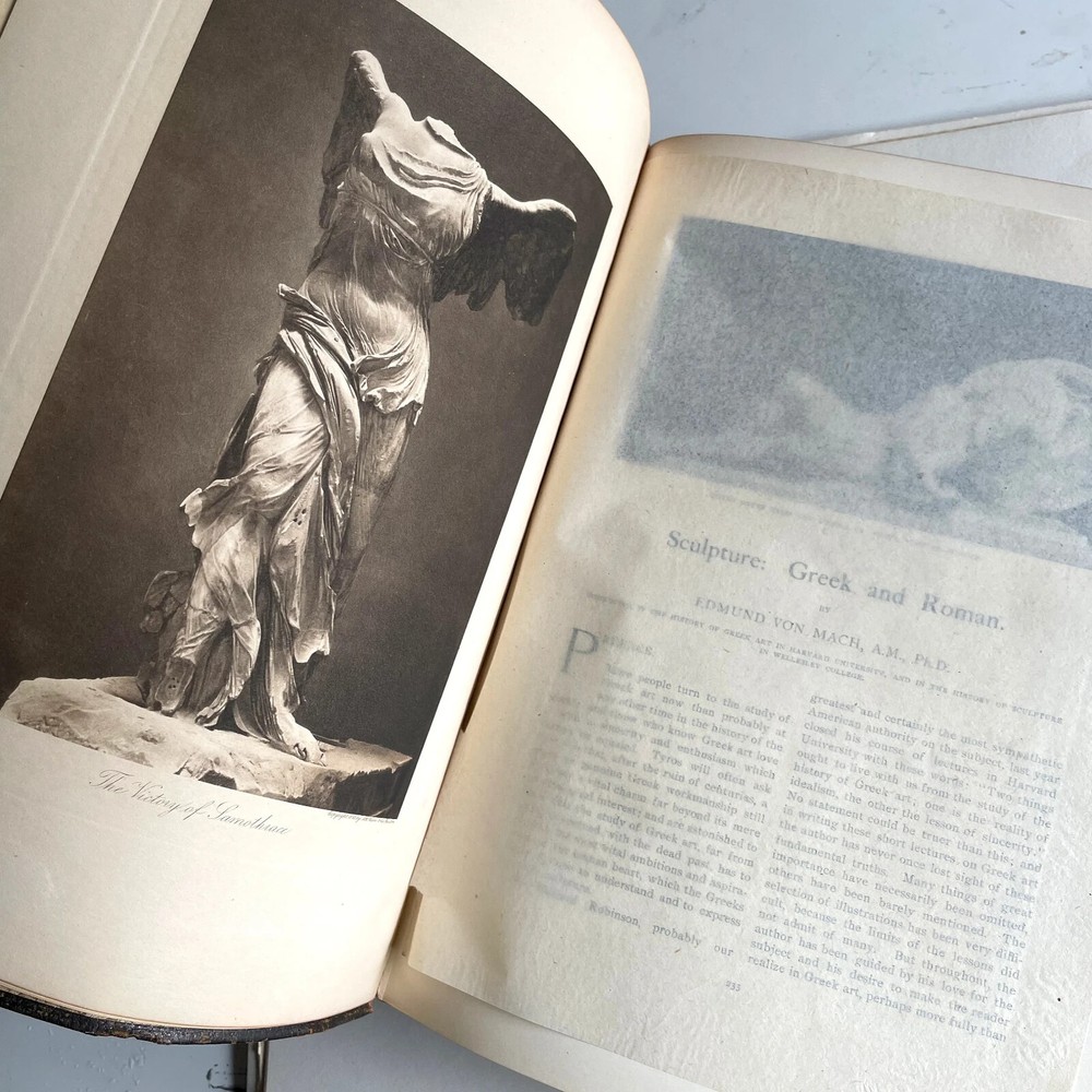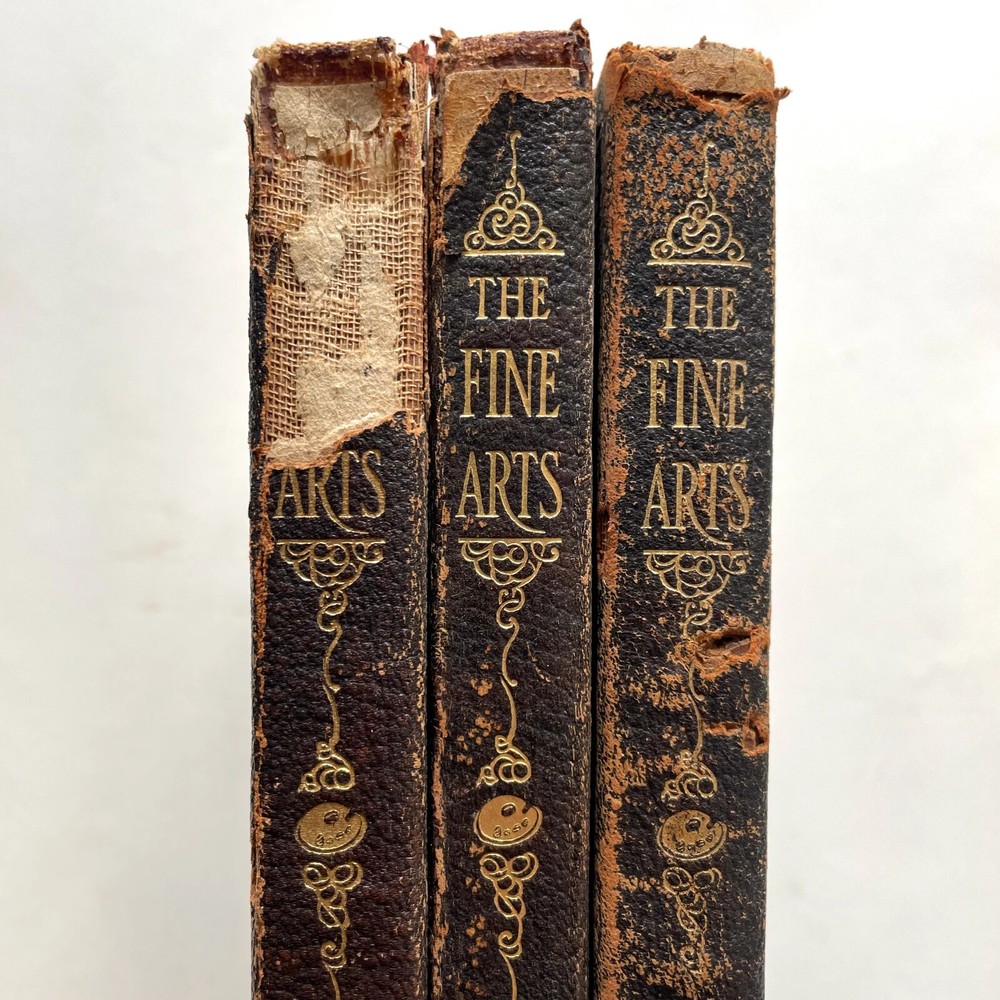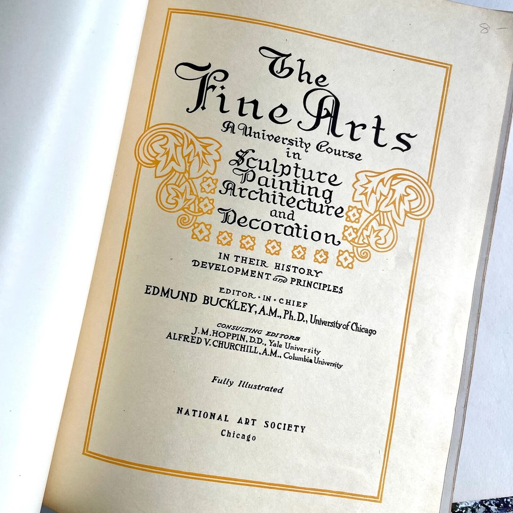 The Fine Arts: a University Course in Sculpture, Painting, Architecture and Decoration in their History, Development and Principles [ Volumes I, II & III ] edited by Edmund Buckley published by National Art Society 3 leather-bound antique volumes in good used condition, fully illustrated "The Fine Arts: A University Course in Sculpture, Painting, Architecture and Decoration in Their History, Development and Principles (Volumes I, II & III), edited by Edmund Buckley, is a comprehensive educational series published by the National Art Society. These volumes offer an extensive study of the history and evolution of major art forms, including sculpture, painting, and architecture. The books cover both technical principles and the artistic developments in these fields across different historical periods. The goal is to provide a broad academic foundation for understanding and appreciating fine arts."