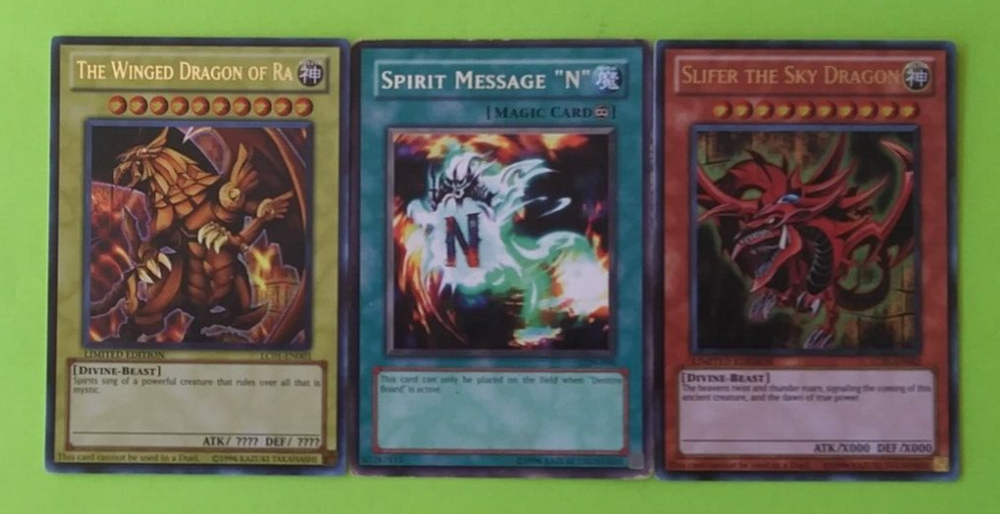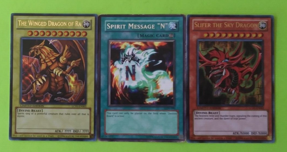 This auction is for a 3-card lot of vintage 1996 Konami Yu-Gi-Oh collector/playing cards in Very Good/EX++ condition. [LC01-EN002 Limited Edition Slifer the Dragon] [LC01-EN003 Limited Edition the Winged Dragon of RA] [LON-090 First Edition Spirit Message "N"] The cards shown in the pictures are the cards you will receive. This is a buy it now at $20.00, and shipping is $5.00. Shipping will be adjusted for multiple auction winners. Please check my other auctions and good luck to everyone!