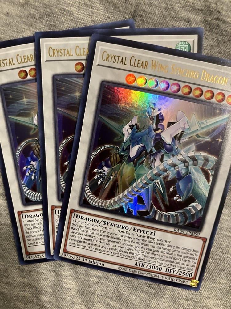 3x Crystal Clear Wing Synchro Dragon 1st Edition Ultra Rare RA04-EN059. Condition is Ungraded. Shipped with eBay Standard Envelope for eligible items up to $20....