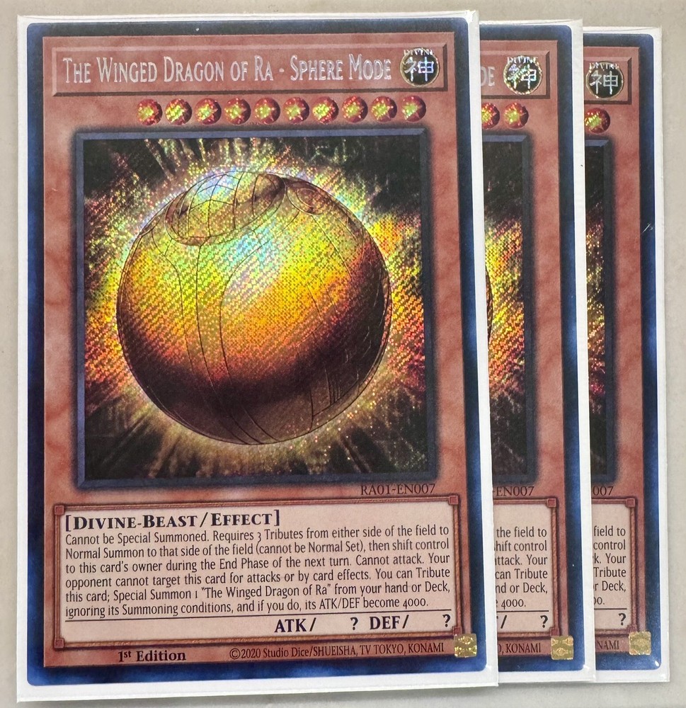 3x The Winged Dragon of Ra - Sphere Mode 1st Edition Secret Rare RA01-EN007. Condition is Ungraded. Shipped with USPS Ground Advantage....