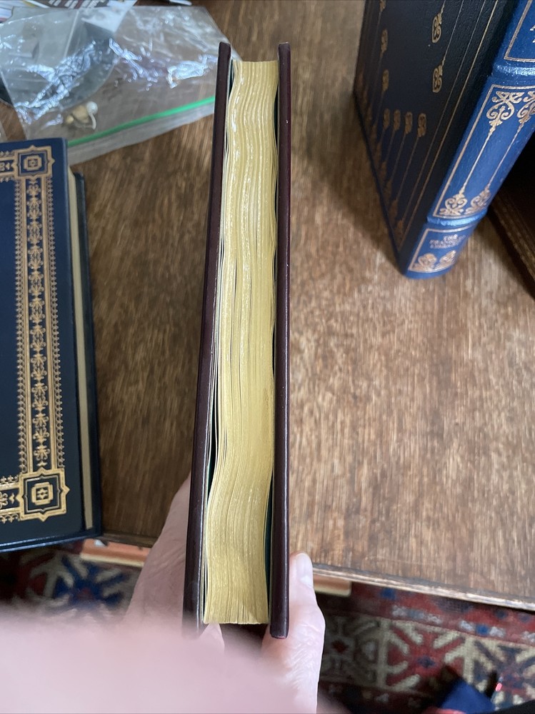 4 Lovely Vintage Franklin Library Books HUXLEY, WILDER, BIERCE, Henry Adams leather, gold leaf and Excellent condition. Exception: the bridge of San Luis by Wilder has some apparent warping in pages.