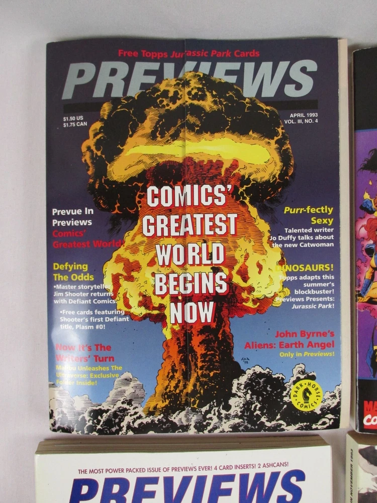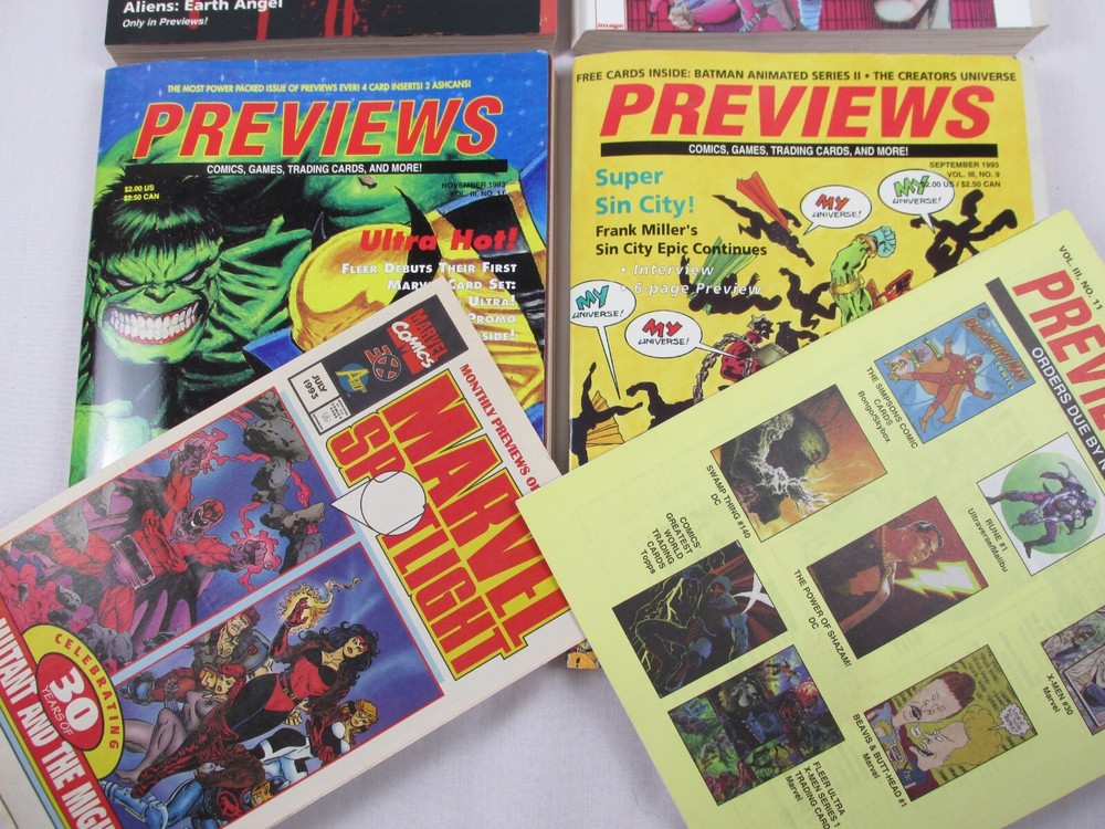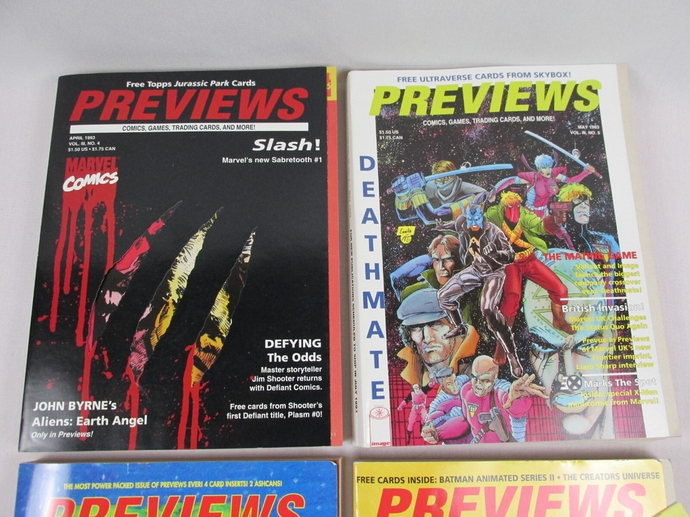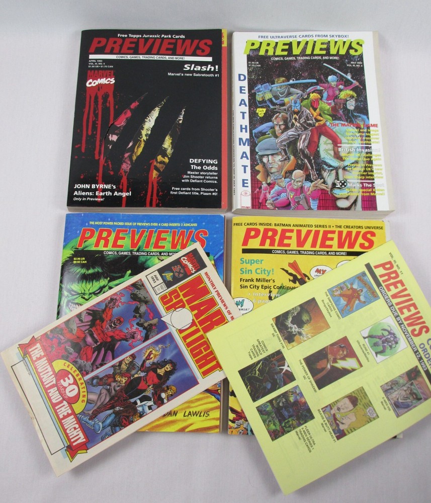 (4) PREVIEWS Comics 1993 / Volume 3 No. 4, 5, 9 & 11 Marvel DC + Consumer Order Form Preowned in very good condition. See all pictures for condition and details as they are an intricate part of the description! ~~~~~~~~~~ NO RETURNS. ~~~~~~~~~~ Be sure your shipping address is correct when making a purchase. Items are shipped via U.S.P.S, UPS or FedEx. Large/valuable items are generally shipped insured with signature delivery confirmation. Item ships within two business days after receiving payment. ~~~~~~~~~~ We do our best to describe items accurately. Where there are noticeable defects, we will attempt to describe it or picture it. Please read description and view all photos BEFORE purchasing. Pictures are a part of the description which can tell the condition better than words. We encourage your questions before you buy an item. ~~~~~~~~~~ Feedback is very important to our business. Please take the time to leave feedback and we will quickly and gladly do the same for you. Leaving feedback is a way of letting us know that you received your item and you are happy with your purchase. If you have an issue with an item, please contact us before leaving neutral or negative feedback.