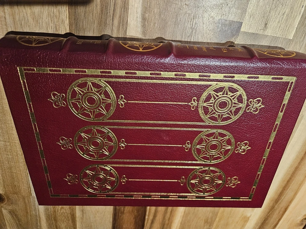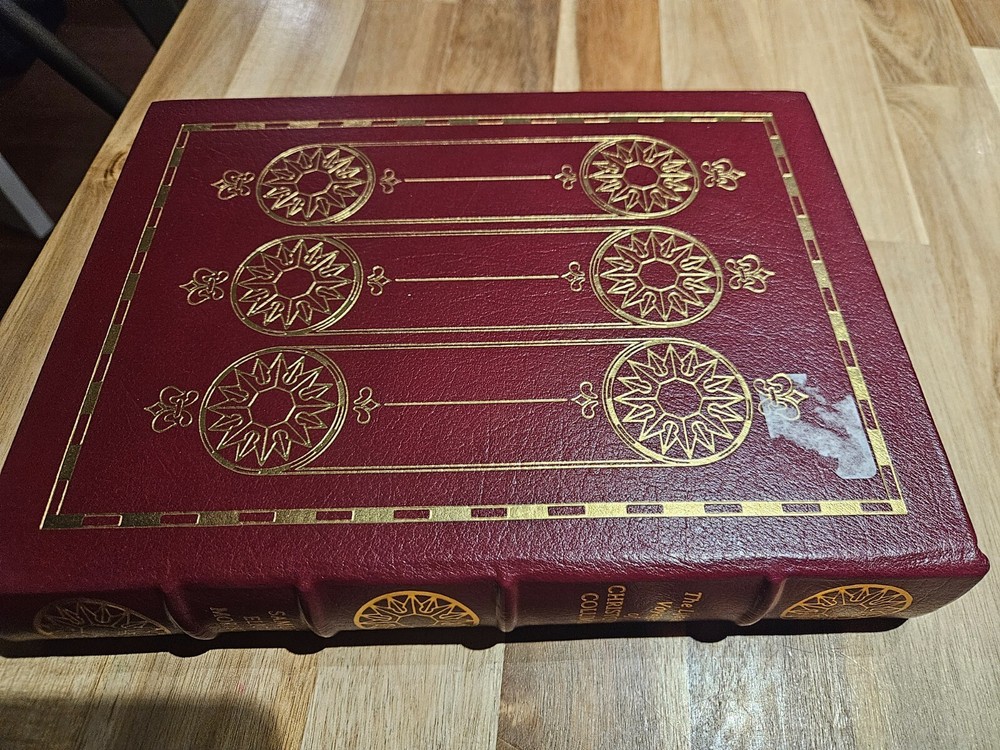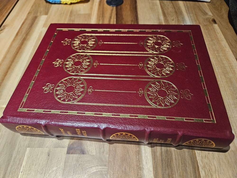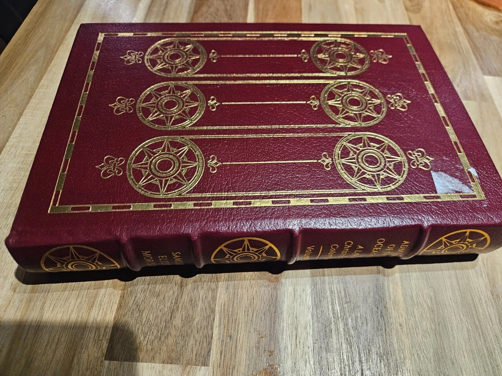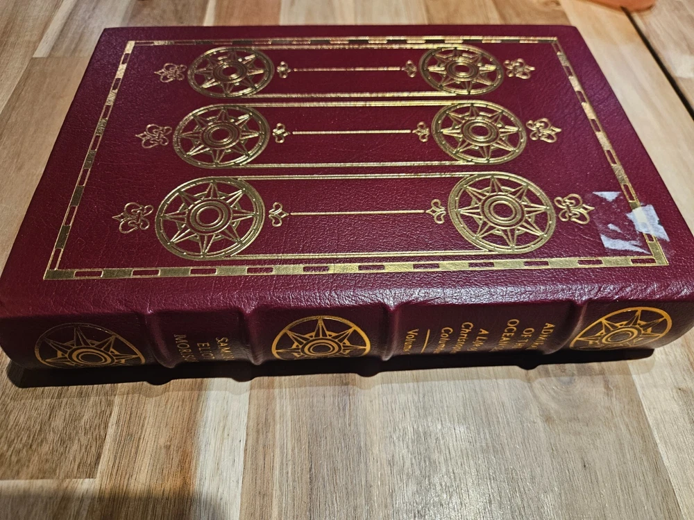 This 3-volume set commemorates the 500th anniversary of Christopher Columbus's voyage across the Atlantic Ocean. The books are bound in luxurious leather and printed by Easton Press in 1990. The set includes "The Life and Voyages of Christopher Columbus," and "Admiral of the Ocean Sea, A Life of Christopher Columbus," VOLUMES I and II. Books are in excellent condition. There appears to be one main flaw on the top front corner cover of one of the books(see picture). Some very minor wear to some of the gold edges of pages. All three books have remnants of a price tag. I am not a professional book handler so I did not want to attempt to finish peeling them off, but I believe they could come off with relative ease. Please see picture for additional information. Please also ask any questions before purchasing.