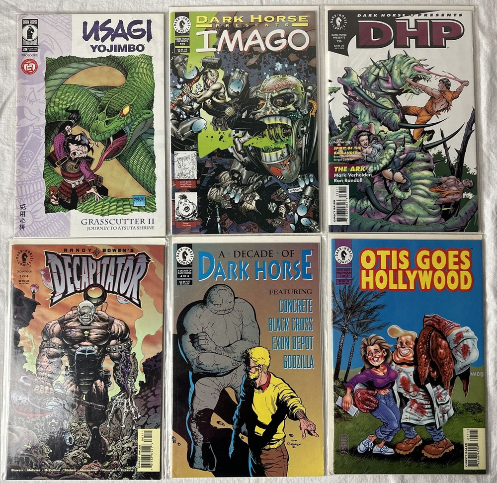 Hello and welcome to our auctions. Don't you love it when you find a GREAT DEAL? Up for grabs is this lot of 6 issues from Dark Horse Comics. These comics were purchased many years ago and read only once and then slid inside a sleeve. They are in very great condition and you'll be happy to add this to your already awesome collection. Here's what you get: Usagi Yojimbo - #39 Imago - #123 DHP - Dark Horse Presents - #136 Randy Bowen's Decapitator - #1 of 4 A Decade Of Dark Horse - featuring Concrete, Black Cross, Exon Depot, Godzilla - #4 of 4 Otis Goes Hollywood - #1 of 2 I have other comics up for sale so please check them out. You'll save on shipping. I have other GREAT stuff up for auction so please check them out. Domestic Winners pays ONLY $6.98 SHIPPING. All items are packaged safely and securely. Please email me with any questions you might have.