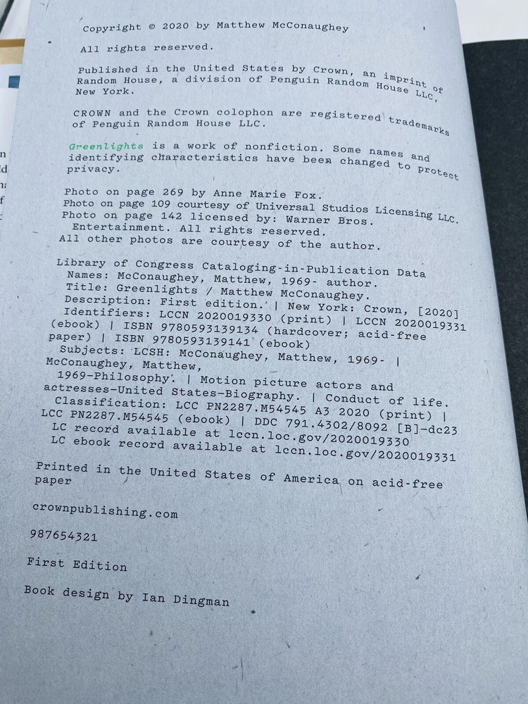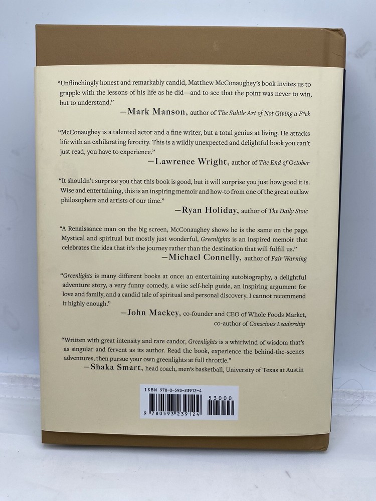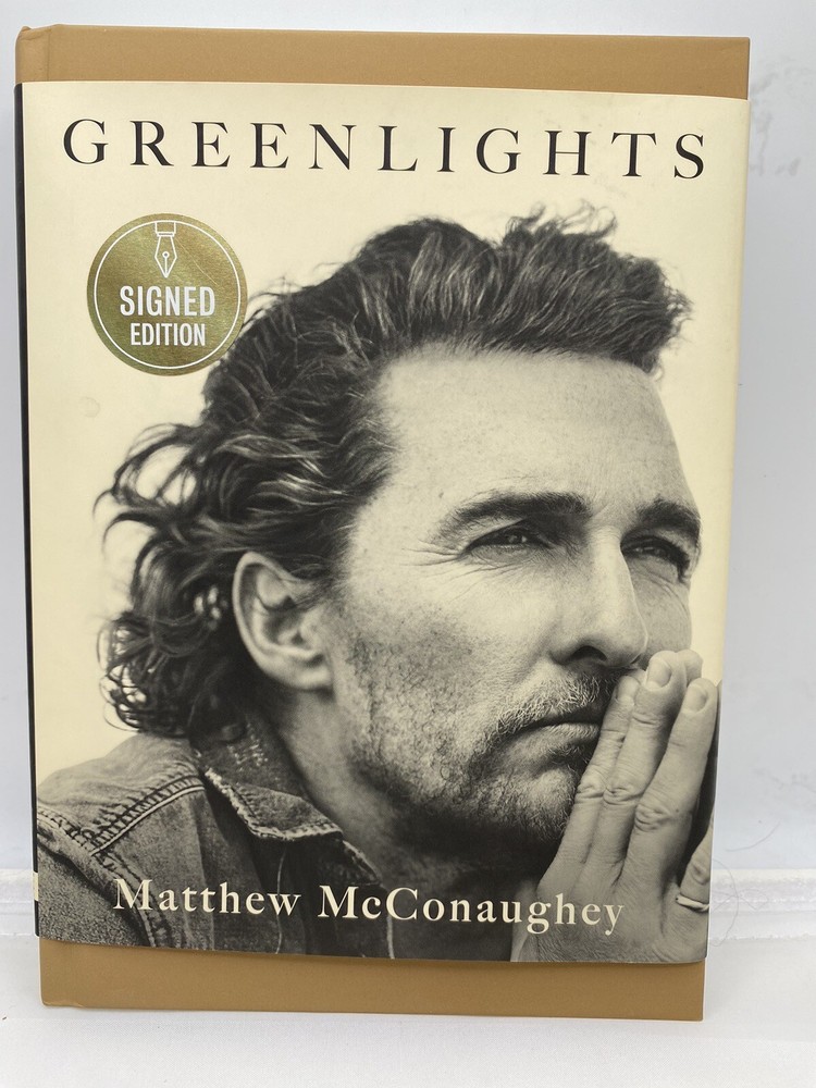 Hardcover. Condition: Near Fine. Dust Jacket Condition: Very Good Condition. 1st Edition. Hardcover Signed by the Author with no personalization on flyleaf. Tan laminated boards with pictorial endpapers. Includes numerous color and b/w photographs, 289 pages. "Signed Copy" sticker affixed. Signed by Author. SIGNED BY THE AUTHOR, MATTHEW MCCONAUGHEY! From the Academy Award–winning actor, an unconventional memoir filled with raucous stories, outlaw wisdom, and lessons learned the hard way about living with greater satisfaction “Unflinchingly honest and remarkably candid, Matthew McConaughey’s book invites us to grapple with the lessons of his life as he did—and to see that the point was never to win, but to understand.”—Mark Manson, author of The Subtle Art of Not Giving a F*ck I’ve been in this life for fifty years, been trying to work out its riddle for forty-two, and been keeping diaries of clues to that riddle for the last thirty-five. Notes about successes and failures, joys and sorrows, things that made me marvel, and things that made me laugh out loud. How to be fair. How to have less stress. How to have fun. How to hurt people less. How to get hurt less. How to be a good man. How to have meaning in life. How to be more me. Recently, I worked up the courage to sit down with those diaries. I found stories I experienced, lessons I learned and forgot, poems, prayers, prescriptions, beliefs about what matters, some great photographs, and a whole bunch of bumper stickers. I found a reliable theme, an approach to living that gave me more satisfaction, at the time, and still: If you know how, and when, to deal with life’s challenges—how to get relative with the inevitable—you can enjoy a state of success I call “catching greenlights.” . So I took a one-way ticket to the desert and wrote this book: an album, a record, a story of my life so far. This is fifty years of my sights and seens, felts and figured-outs, cools and shamefuls. Graces, truths, and beauties of brutality. Getting away withs, getting caughts, and getting wets while trying to dance between the raindrops. . Hopefully, it’s medicine that tastes good, a couple of aspirin instead of the infirmary, a spaceship to Mars without needing your pilot’s license, going to church without having to be born again, Publisher : Crown Publishing Group (NY); First Edition (January 1, 2020) Language : English ISBN-10 : 0593239113 ISBN-13 : 978-0593239117 Item Weight : 1.2 pounds