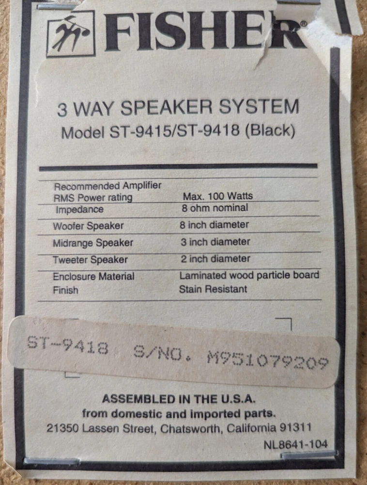 8' Fisher Speaker,ST-9415, ST-9418, Woofer Original, Tested The sound is good, the last picture shows the cabinet it came from