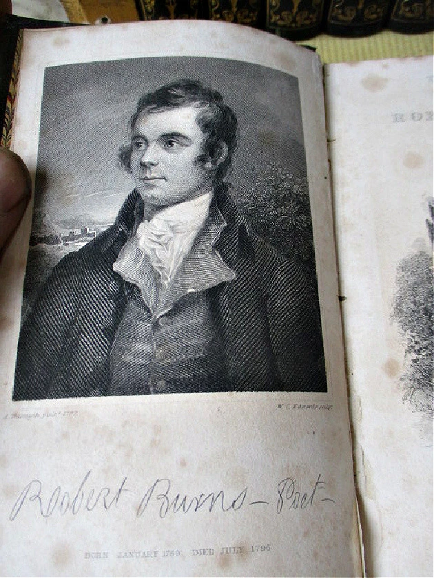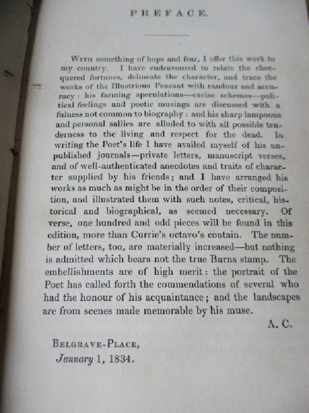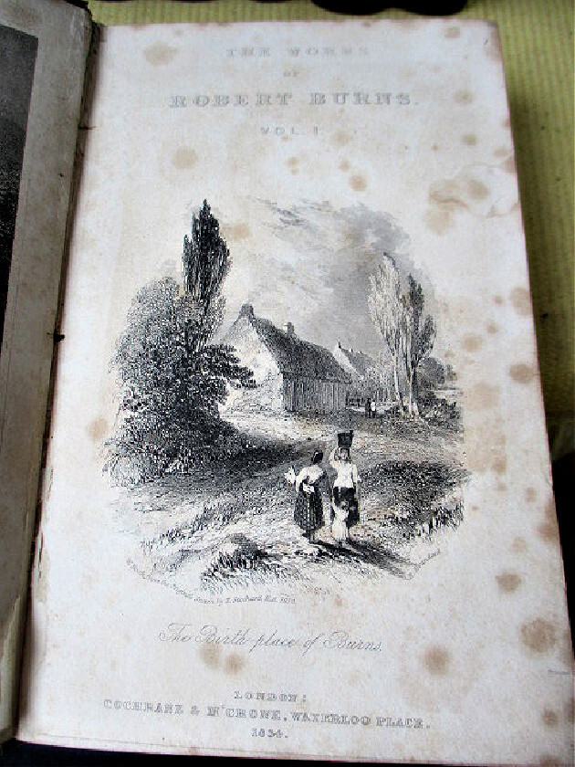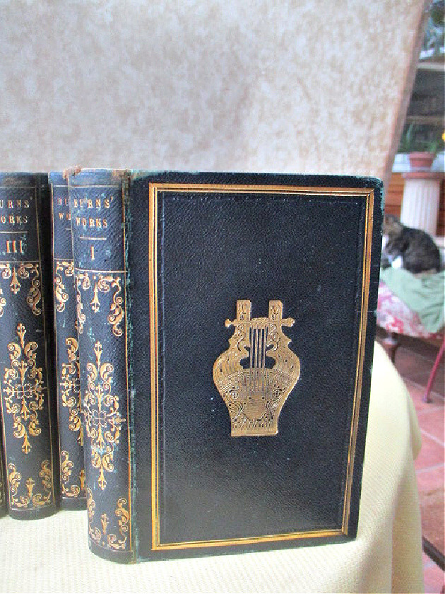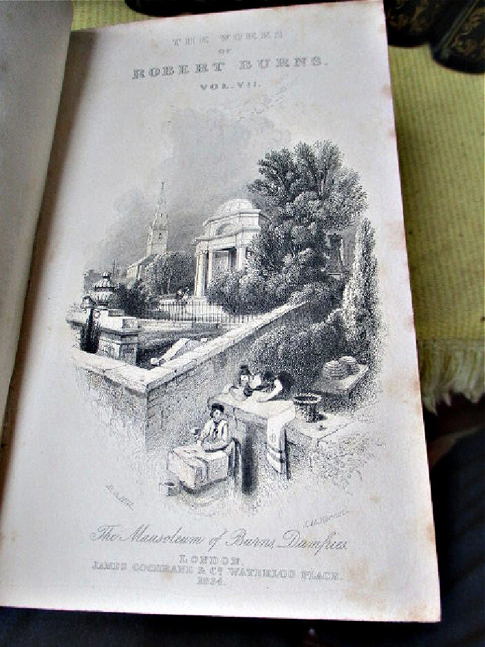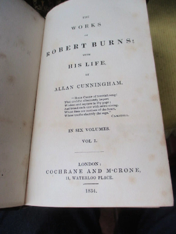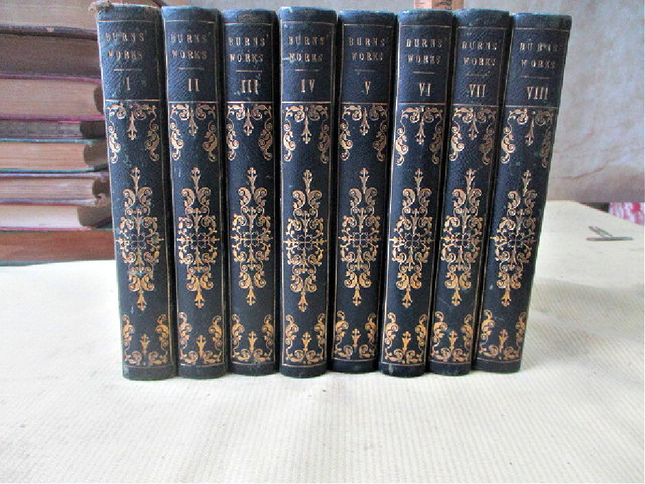 KA1246. 8 Volumes complete, "The Works of Robert Burns with His Life". By Allan Cunningham, 1834, First Cunningham Edition, First Issue. Pub'd Cochane & M'crone, London. 6 1/2" tall, approx. 350 pages each volume. Full black leather covers with pictorial gilt harp device on front and back of all volumes and ornate gilt decorated spines. All edges marbled, as are the end papers. Each volume with frontispiece (Vol. 1 with Burns portrait) and pictorial engraved title page. This is a tight, bright and clean set with very minimal wear. 8 1/2" wide on shelf. Very Good+ condition. Do not hesitate to e-mail with any questions. As Always, Satisfaction Guaranteed! I expect to receive payment within 10 days, unless we have made other arrangements. Shipping will be USPS Media mail or Priority, if requested. I'm glad to combine multiple purchases in order to minimize shipping costs. I WILL SHIP INTERNATIONALLY, and I try to be as economical as possible with the shipping costs. RETURN POLICY: Satisfaction Guaranteed! Track Page Views With Auctiva's FREE Counter