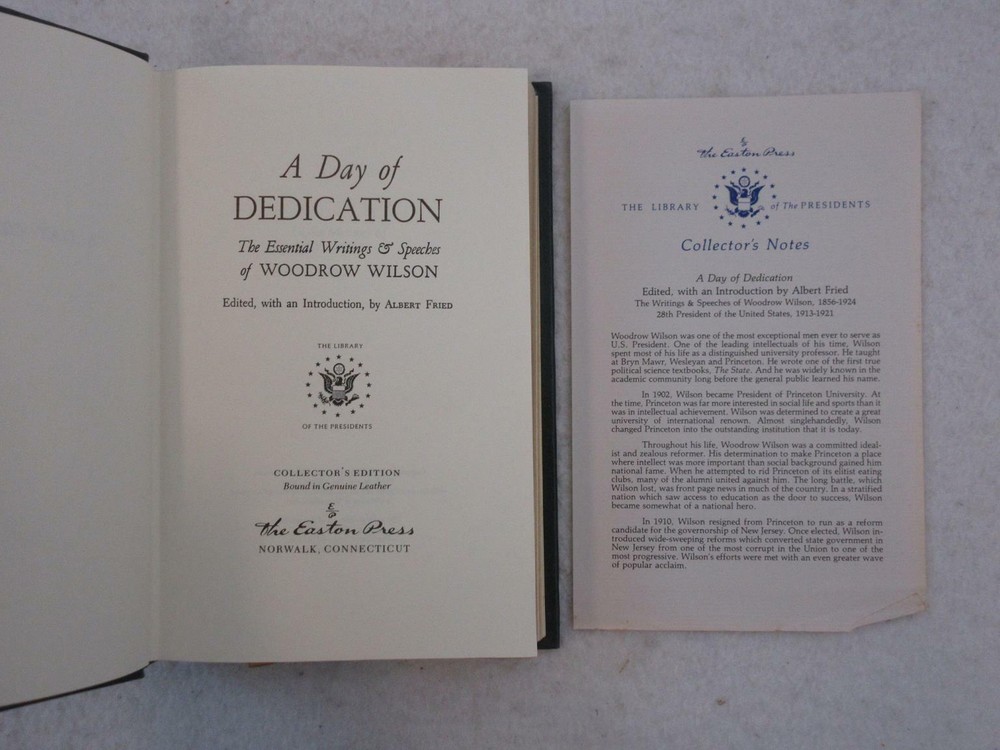 A DAY OF DEDICATION Woodrow Wilson Writings Speeches Easton Press Presidents In near fine condition. Includes Notes. Please examine photos for details. Condition: We strive to describe and photograph the condition of every item as accurately as possible. Photos are of the actual item that is being sold. Please examine the photos carefully for any condition details and possible flaws. Best Offers: Items are available for offers only after being listed for 30 days. We consider all offers in relation to current market values. We try to respond almost immediately to most offers. Most of our counteroffers are firm but we are open to bargaining. Shipping for US Customers: We combine shipping. When ordering multiple items from us please request a total before paying. We charge postage based on weight plus $1 for each eBay listing. All of our orders are packed carefully to prevent damage during shipment. We ship most of our items within 24 hours. Shipping for International Customers: All international orders are shipped via Ebay's Global Shipping Program. IF AN INTERNATIONAL CUSTOMER IS INTERESTED IN ORDERING MORE THAN ONE ITEM please do not Buy It Now or use the Make An Offer option on the listing. Rather message us first with a list of the items desired along with any offers. After we agree on prices we will combine all the orders into a single listing at the agreed upon total price. This will save you significantly on the cost of shipping. Contact Us: We are available 7 days a week and are happy to answer any questions you may have. The complete eBay Selling Solution.