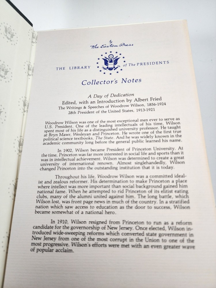 A Day of Dedication: The Essential Writings & Speeches of Woodrow Wilson Wilson, Woodrow and edited by Fried, Albert Norwalk, Connecticut: The Easton Press, 1988. Bound in rich full leather - extensive gilt decoration on spine and both boards - raised bands on the spine - archival quality paper and satin ribbon bookmark. 8vo - 6 ½ x 9 ½”. 473 pp. Includes “Collector’s Notes” laid-in. Good. Damp-stains to the lower tips of the last several pages. Otherwise the interior is unmarked. The binding is solid. Be sure to take a look at my store for similar items. Please feel free to ask any questions. Payment is requested as soon as possible. Shipment is made when payment has cleared. We will gladly combine shipping on multiple items to save on shipping costs. 100% Satisfaction Guaranteed - If you are not satisfied with your purchase, please contact us within 30 days of receiving the item. We consider a sale final after 30 days. All items must be returned with their original materials to receive a refund. Shipping is non-refundable.