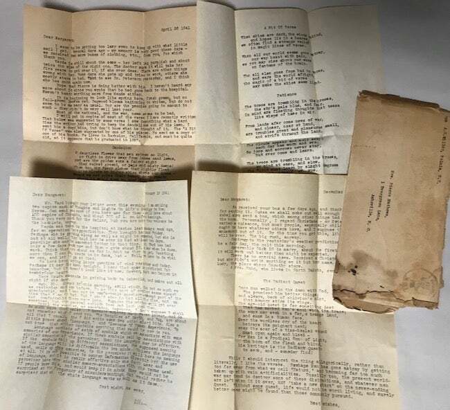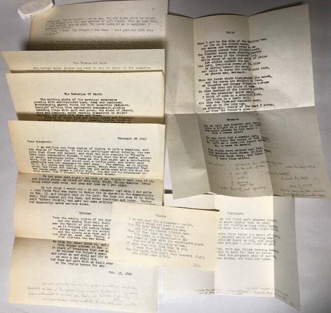 Lyrics of Life Slight or Serious Author: Miller, A.G. (Spruce Pine, North Carolina) Title: Lyrics of Life Slight or Serious Publication: Boston: The Meador Press, n.d. Description: Includes an additional 12 separate typed manuscript pages and clipped paper poems from the author sent to Mrs. Pierce Mathews (Matthews), 1 Evergreen Lane, Asheville, N.C.. Booklet is inscribed and signed by the author. Wraps. Stitched, gray wraps with title on the front cover. 47 pages. Inscribed and signed by the author - "To Margaret with best wishes from Allen" on the verso of the front cover. Wraps are in very good condition. The outer leatherette covers are worn around the edges. This published poetry has the original covers plus added plain white covers for inserting into a leather folder. Laid inside the the leather covers are 10 additional typed poems with most signed or initialed with pencil notes. Another typed poem is tipped in on the verso of the front wrap. These poems are signed or inscribed to Margaret and are dated 1937-1941. Included with the poems is an addressed envelope from the author in Kalmia, N. C. to Mrs. Pierce Mathews (Matthews) of Asheville, North Carolina. Very good. Seller ID: 32420 Subject: Literature David A. Hamilton Americana Books Tucker, Georgia Americana Books has been in business since 1993. We are active members of the Antiquarian Booksellers’ Association of America (ABAA), Independent Online Booksellers Association (IOBA), the International League of Antiquarian Booksellers (ILAB), and the Georgia Antiquarian Booksellers Association (GABA). We sell books in all fields but specialize in the subject of "Americana." We offer an assortment of books, ephemera and material relating to the exploration and expansion of America, Native Americans, pioneer narratives, personal memoirs and reminiscences, political movements, law, genealogy and local histories, innovations, conflicts, scandals, oppression, inspiration and many other related topics. We hope our customers will share our enthusiasm and passion for history and will enjoy doing business with Americana Books. Dave Hamilton, Americana Books ABAA Guarantee All books are guaranteed as described. We accept returns if mailed back with 30 days and in same condition as sold. Return postage is buyer's responsibility. Shipping All books will be shipped in the U.S. by USPS Priority Mail and Media Mail. UPS quotes for shipping are also available upon request. We are happy to combine shipping on multiple purchases and provide the best possible shipping cost to the customer . Feedback We leave feedback after receiving buyer's feedback. If you are unhappy with your order for any reason, please contact us before leaving feedback, and we will resolve the problem! This listing was created by Bibliopolis.