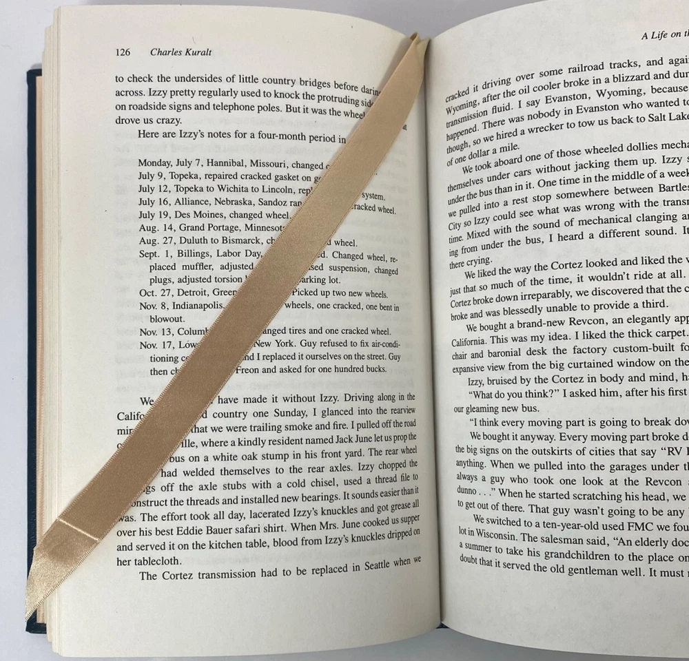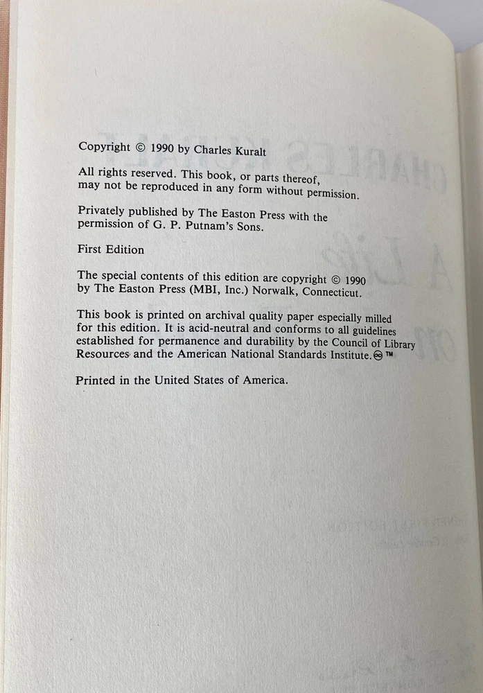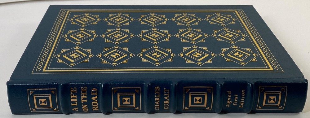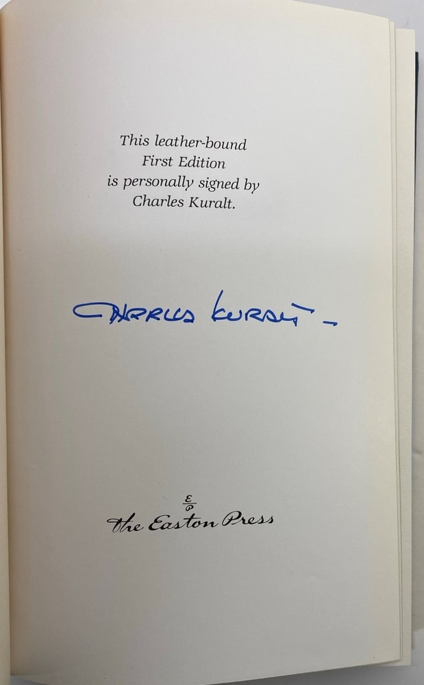 A Life on the Road by Charles Kuralt, Easton Press Signed 1st Edition, 1990 A Life on the Road by Charles Kuralt, Easton Press Signed 1st Edition, 1990 A Life on the Road by Charles Kuralt, Easton Press , 1990 Part of the Signed First Edition collection of The Easton Press, Norwalk, Connecticut, 1990. This book is in excellent, unread condition. There is a slight sunning on the top and bottom of the silk ribbon. Includes a note "A Life on the Road" and Charles Kuralt. The Easton Press books are bound in genuine leather binding, with 22kt gold accents and hubbed spines, gilded page ends, acid-neutral paper, Moire fabric endsheets, and evocative illustrations and decorations. We will be happy to combine shipping, wherever possible. Some items cannot be combined because of their size, weight or because they are fragile. Please ask if you have any questions. Your order will ship by the next business day after receiving payment. All items are from a smoke-free environment. Thank you, and Happy Reading!