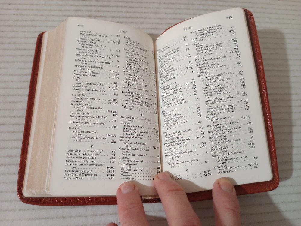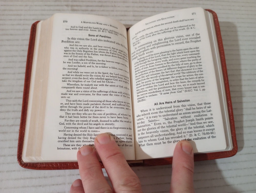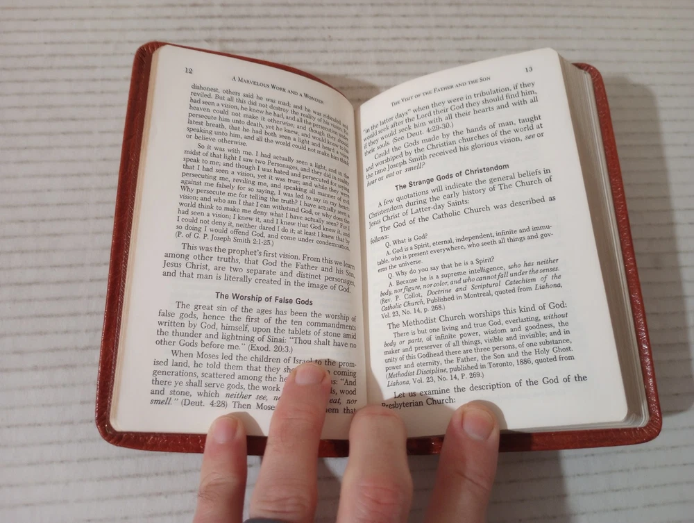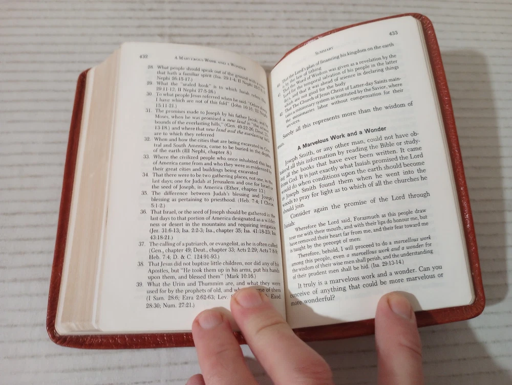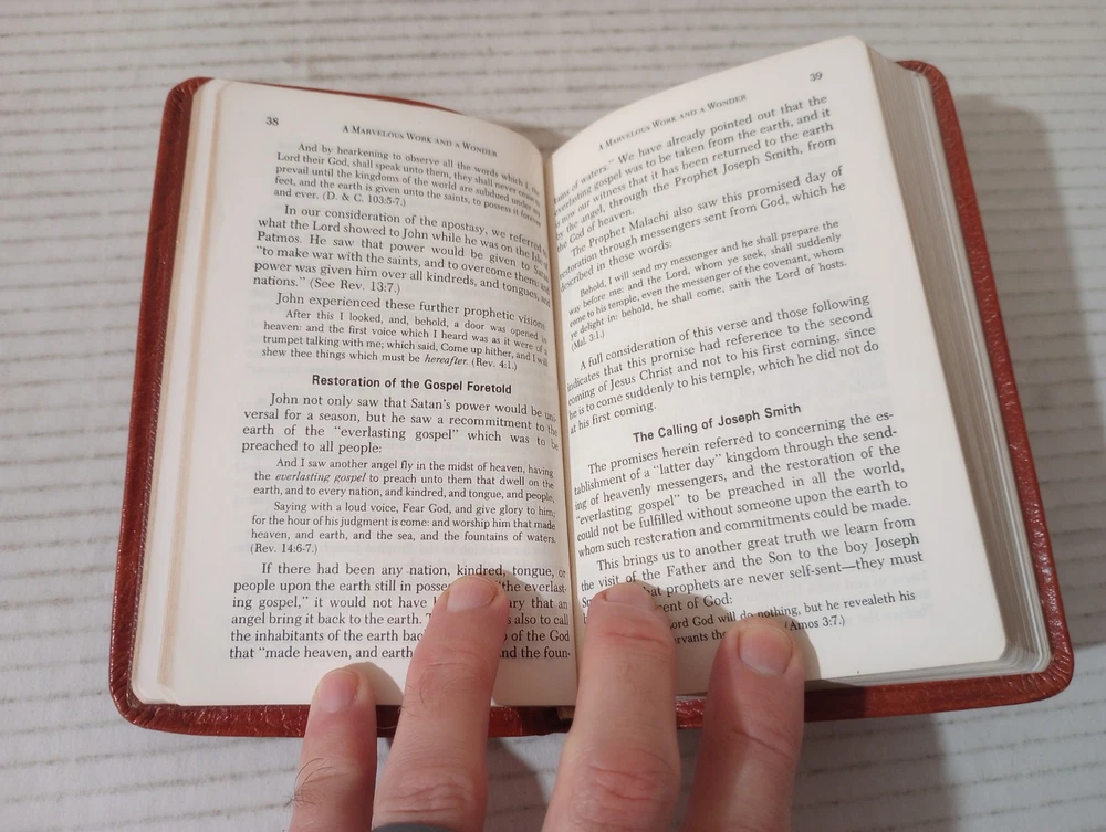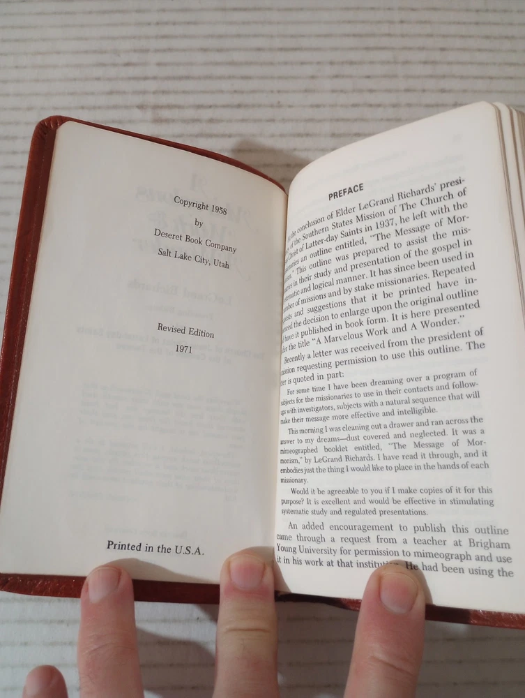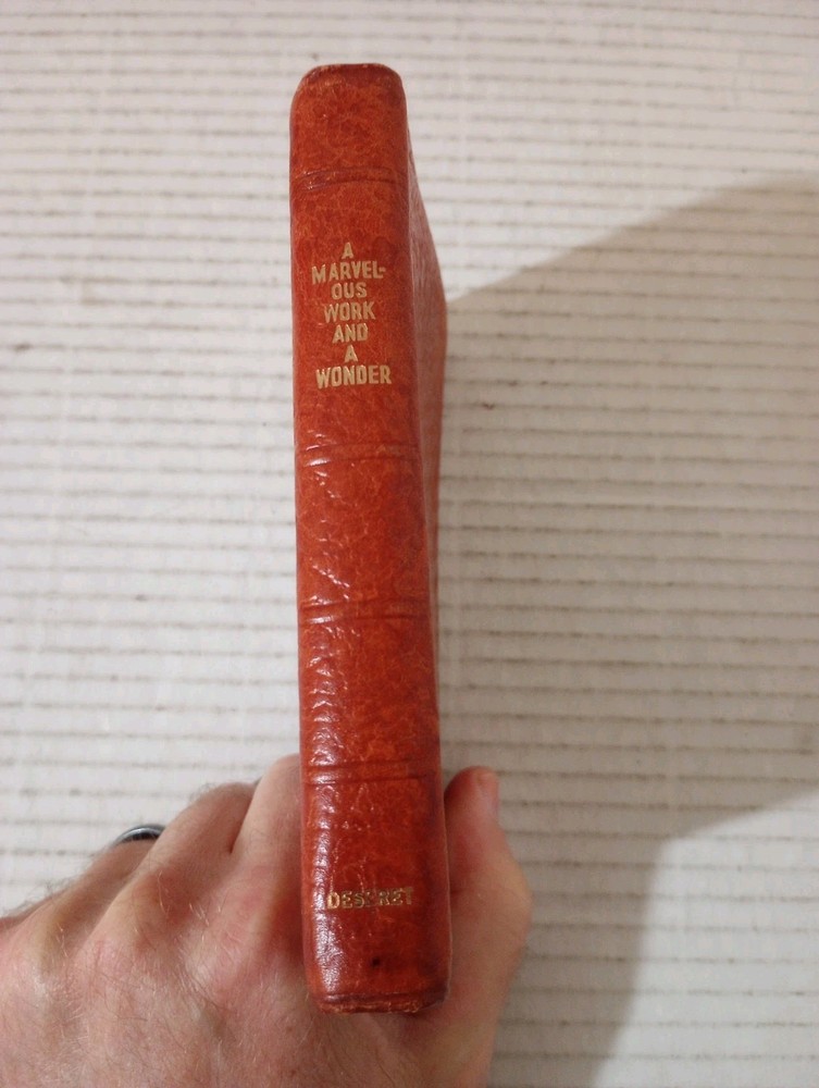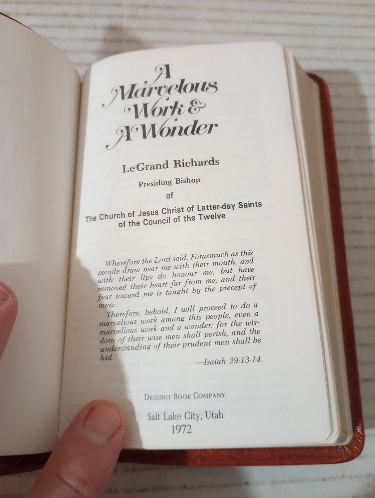 A Marvelous Work And A Wonder By LeGrand Richards Pocket Leather 1972 LDS Mormon. -Cover shows moderate wear. -Name of previous owner on cover. -No writing on pages. -No missing pages. -Please review all photos for details of condition and content. -Shipped with USPS Media Mail or Priority Mail. -Also available for local pickup. We welcome offers counter offers and negotiation. We do not work Sundays. Thank you for your time!