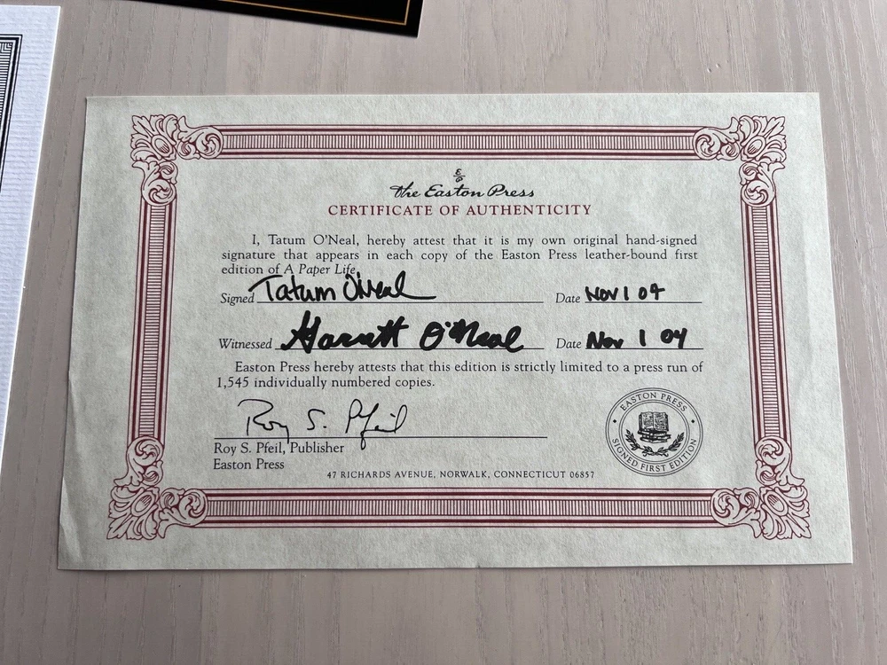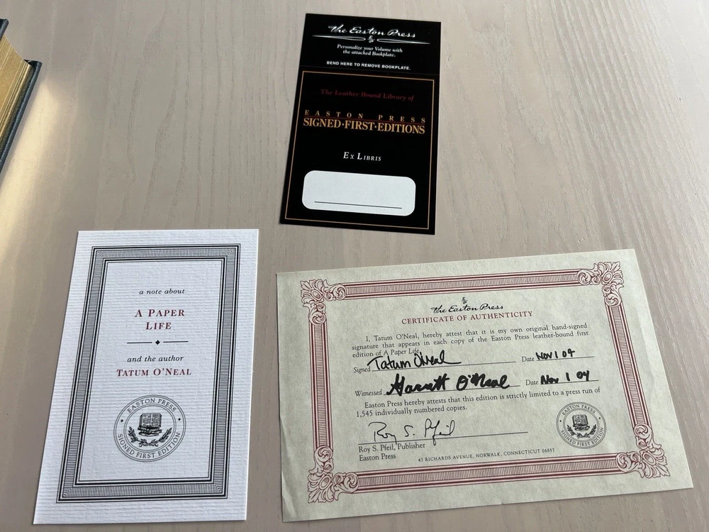 A Paper Life by Tatum O’Neal. Easton Press, Signed First Edition. Leather Sealed. #318 of 1,545 Never read. Comes complete with certificate of authenticity, library sticker and Easton Press card detai...