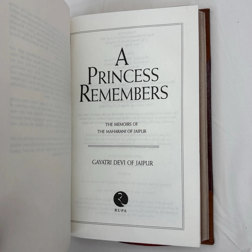 A Princess Remembers: the Memoirs of the Maharani of Jaipur, by Gayatri Devi, Leather Bound Hardcover book. Spine and corners are leather bound with Golden Leaf Printing on spine. See Photos