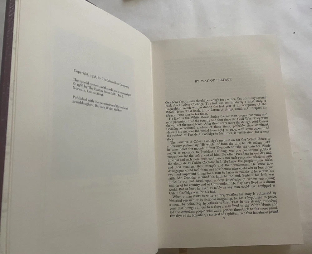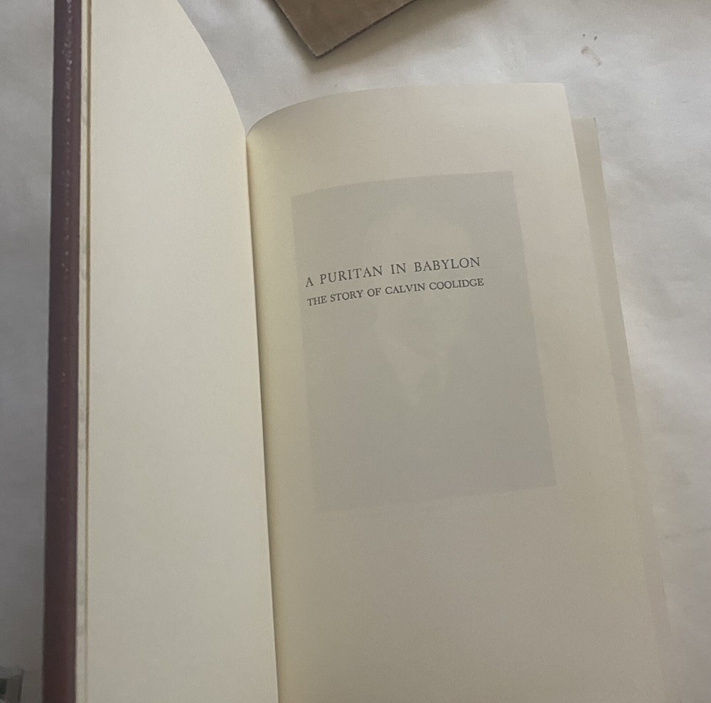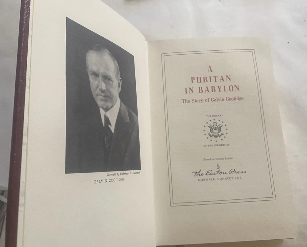 A Puritan in Babylon Calvin Coolidge Easton Press (1986, HB) Leather Bound. The book has a partially shifted spine from improper storage. Otherwise nice book with light corner wear. Clean interior pages. Shipped with USPS Media Mail and packaged carefully and securely (custom boxed) for safe delivery!