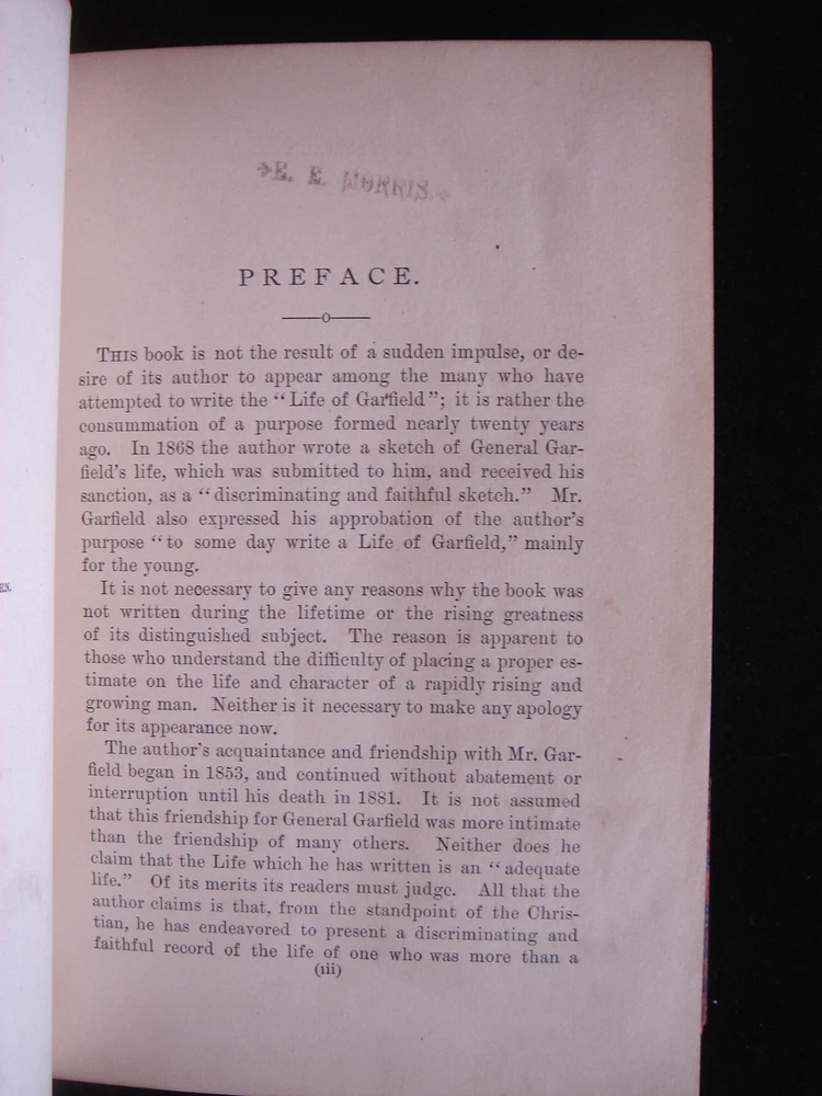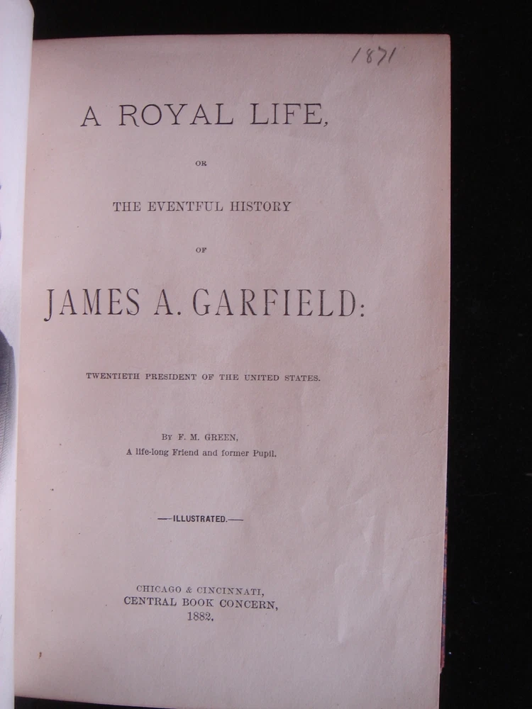 A Royal Life or The Eventful History of James A. Garfield 1882 F. M. Green Product Description A Royal Life or The Eventful History of James A. Garfield by F. M. Green 452 pages. 5.5 x 7.75 inches. Publishing Info: Central Book Concern. Chicago, IL. 1882. Overall in VERY GOOD condition. Half bound leather binding with black buckram, decorative gilt on cover and back boards. Spine is separated into five sections by raised gilted separators. Two of the sections contain title, author, respectively. Illustrated frontis. Leather corners of back and cover boards are moderately worn with rubbing down to the boards. Front joint of board is separated from spine. Open tear at spine head. Small chipping at spine foot. Cracking to spine leather. Front paste down is torn. Pencil mark on front end paper. Textblock exterior is tan with one small water drop on top. Interior is tan and clean. "E.E. Morris" Stamp on title page, last two pages. Binding is secure. AS IS! Please see photos. More photos available upon request. Books over $250 will ship insured, which will incur additional shipping charges. When you buy from us, we would greatly appreciate positive feedback to add to our ratings! Thank you in advance! We encourage you to contact us with any questions! We also welcome additional information on any of our listings. Other shipping options may be available. Please contact us for more details and information. Pickup is also welcome! Orders ship within 2 business days of receipt of payment, unless otherwise notified. Payment is due within 2 days of auction end to guarantee availability and price. International Buyers: Import duties, taxes and charges are not included in the item price or shipping charges; these charges are the BUYER's responsibility. FULL VALUE will be declared on all overseas items. If your order hasn't arrived, or isn't as described, please contact us and we'll work with you to find a satisfactory resolution! Thank you for your interest in this listing! Launched from Highwire.com