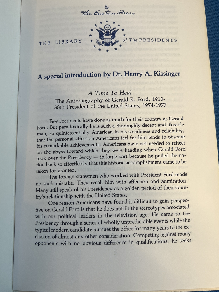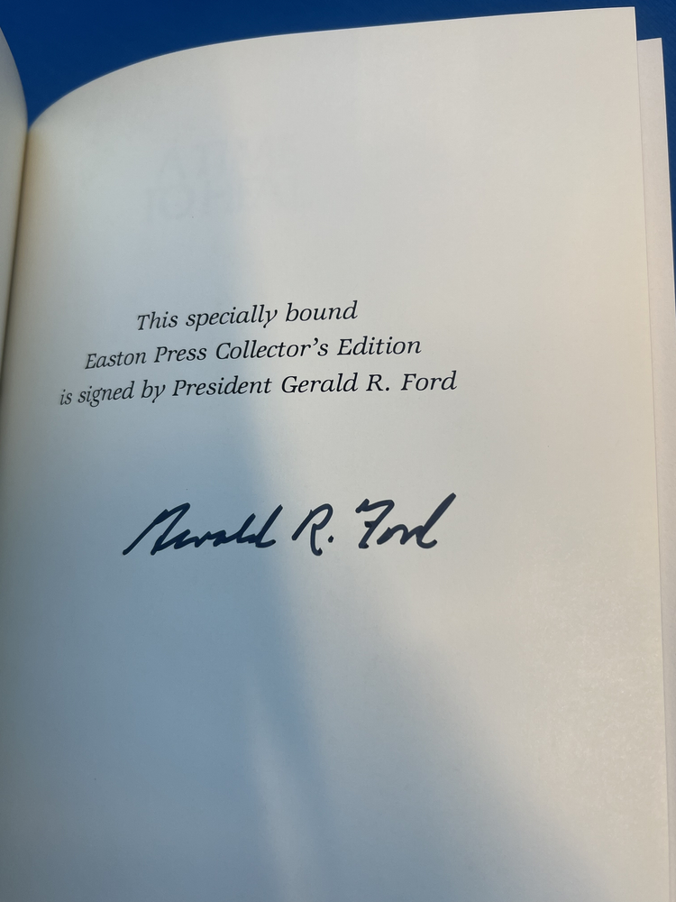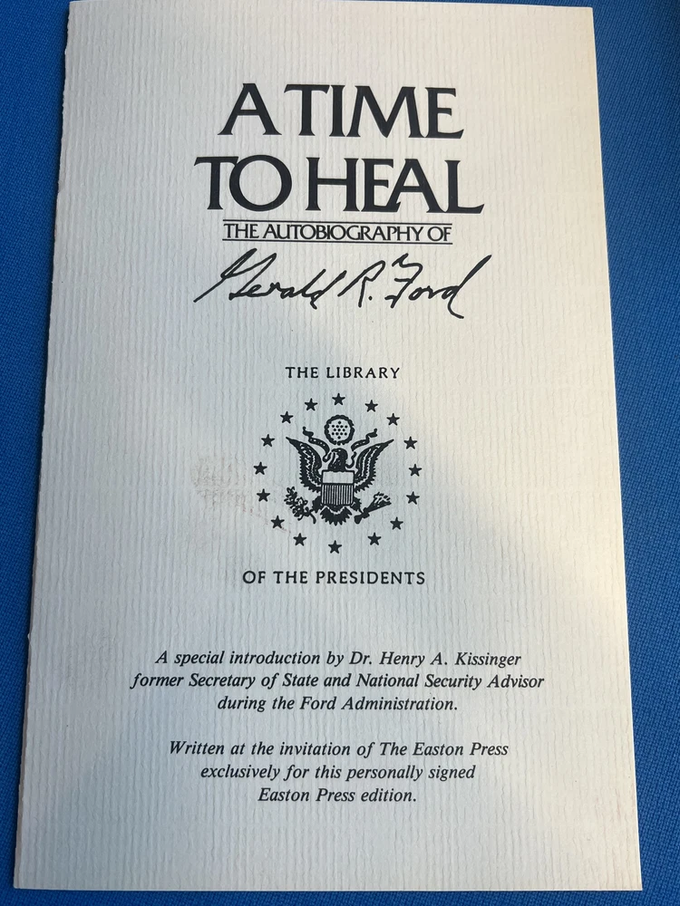 This product is a signed first edition of "A Time to Heal" by Gerald Ford, published by Easton Press in 1987. It is a nonfiction book intended for adult readers, focusing on American history and memoir. The book is leather-bound and includes original certification of authenticity. As a valuable collector's item, this signed copy offers a unique insight into the life and perspectives of Gerald Ford, a significant figure in American politics and society.