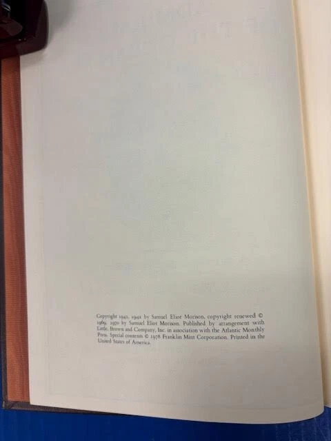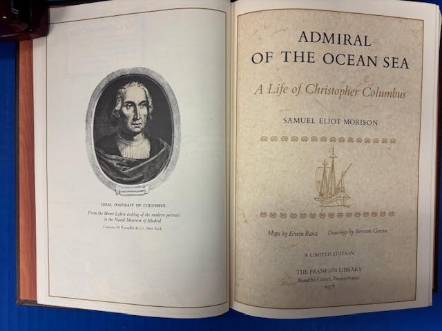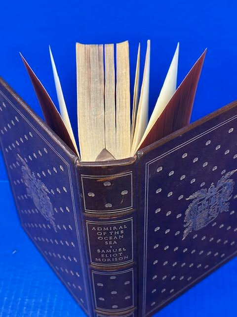 1978. Leather bound. Franklin Mint Library. Limited Edition. Admiral of the Ocean Sea is Samuel Eliot Morison's biography of the greatest sailor of them all, Christopher Columbus. It is written with the insight, energy, and authority that only someone who had himself sailed in Columbus's path to the New World could muster. Morison undertook this expedition in a 147-foot schooner and a 47-foot ketch, the dimensions of these craft roughly matching those of Columbus's Santa Maria and Niña. The result is this biography, detailing the voyages that, for better or worse, changed the world.