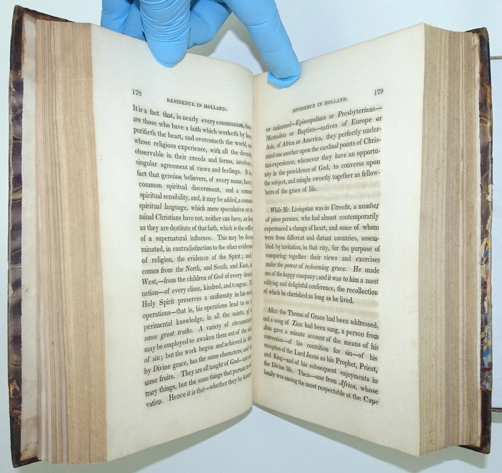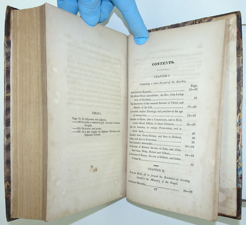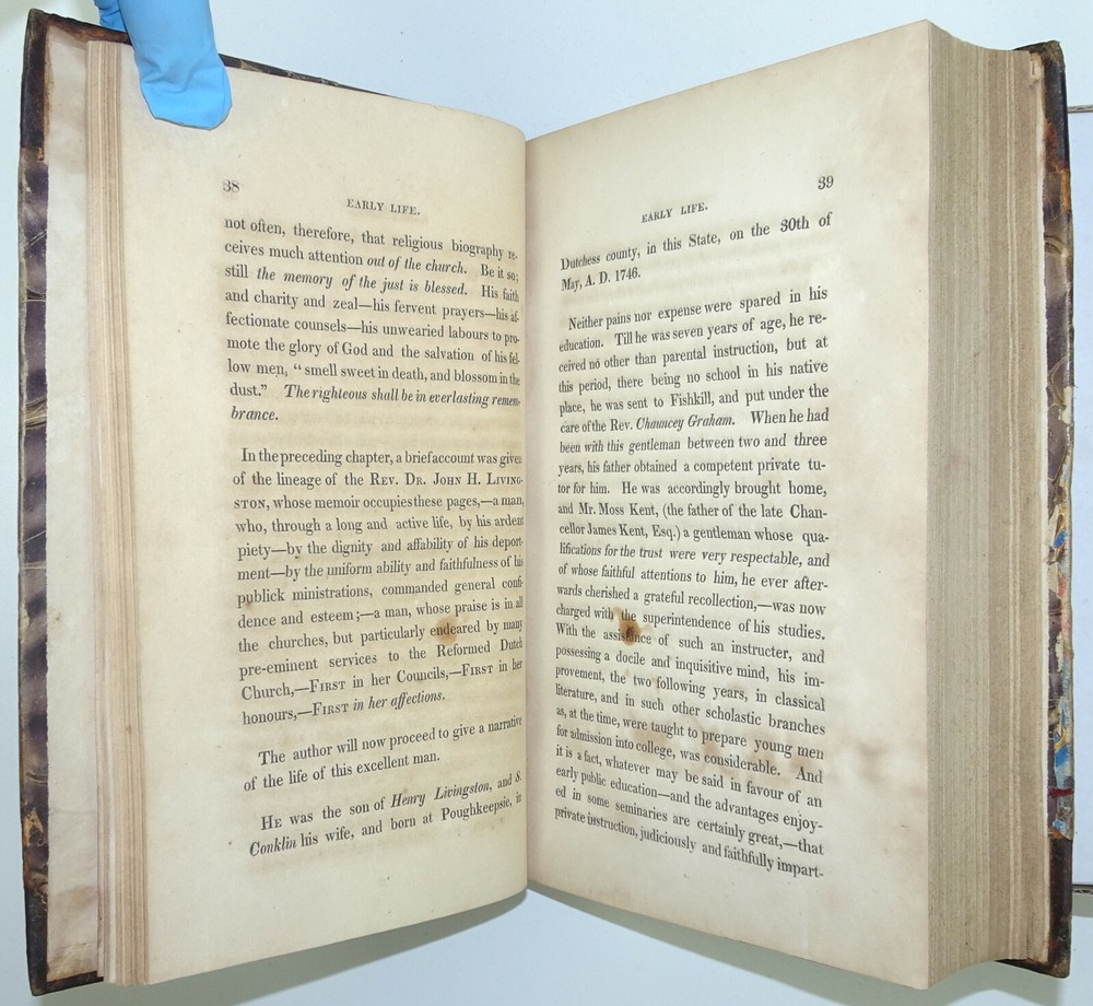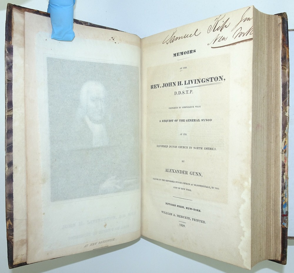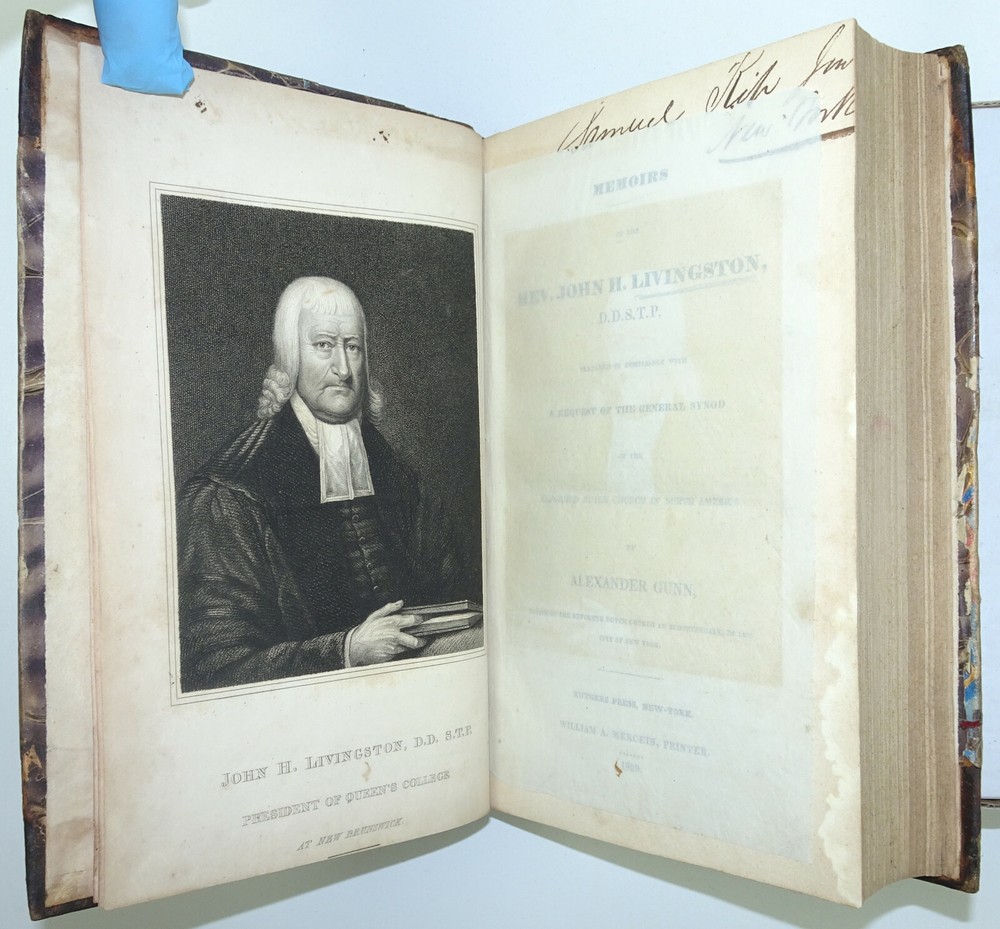 DETAILS: Title: Memoirs Of The Rev. John H. Livingston.... Author : Rev. John H. Livingston / Alexander Gunn . Date Published: 1829. Place Published: New York . Published By: William A. Mercein . Description: First Edition, (not stated)! Size: Approx 8 1/2" x 5 3/4" x 1 3/4". CONDITION: Overall: Good. Early, (probably original) 1/2 leather boards. Neatly rebacked, spine label replaced! Pages: Good with some occasional soiling and or discoloration, Previous owner's names to front pastedown and title page, (please see pictures) . Binding: Excellent . Hinges: Excellent / replaced . Hardcovers: Good with some wear, (please see pictures). Spine: Very good with some discoloration / loss of gilt to top , (please see picture s) .