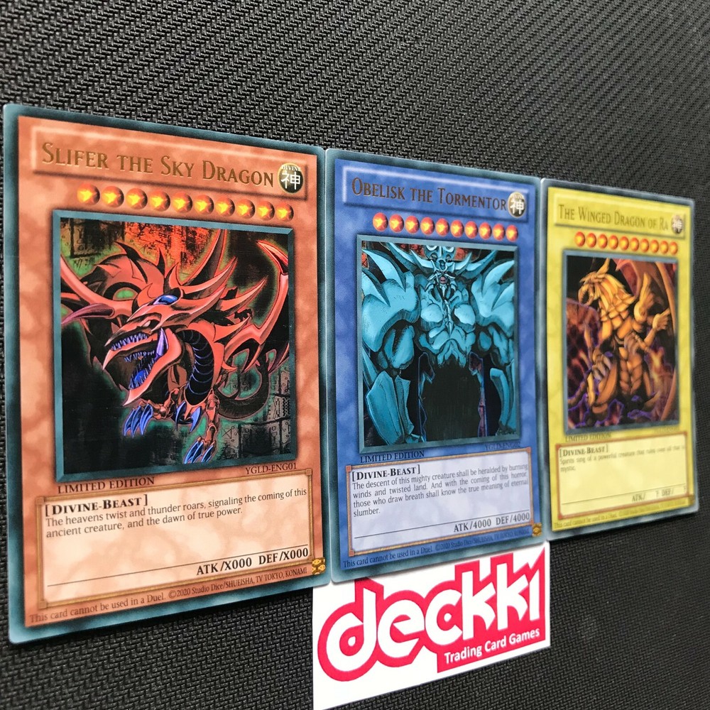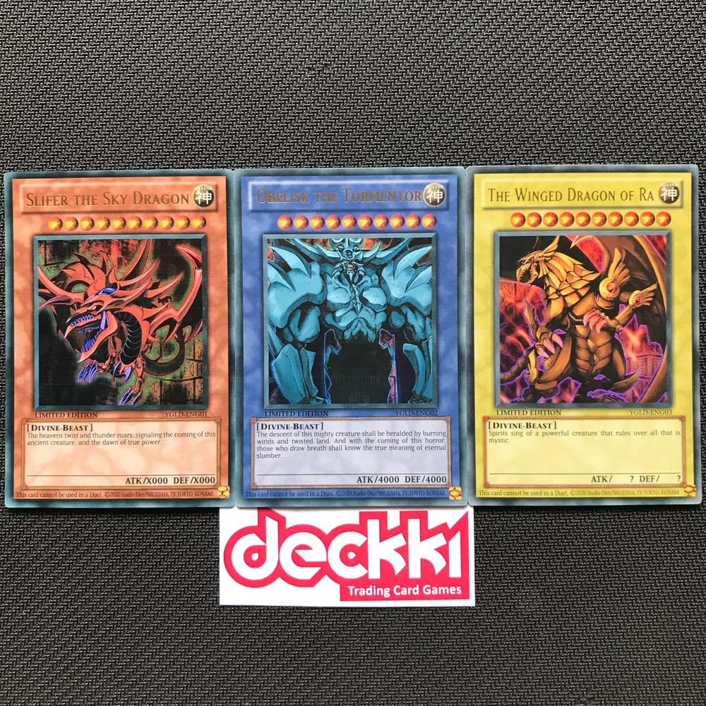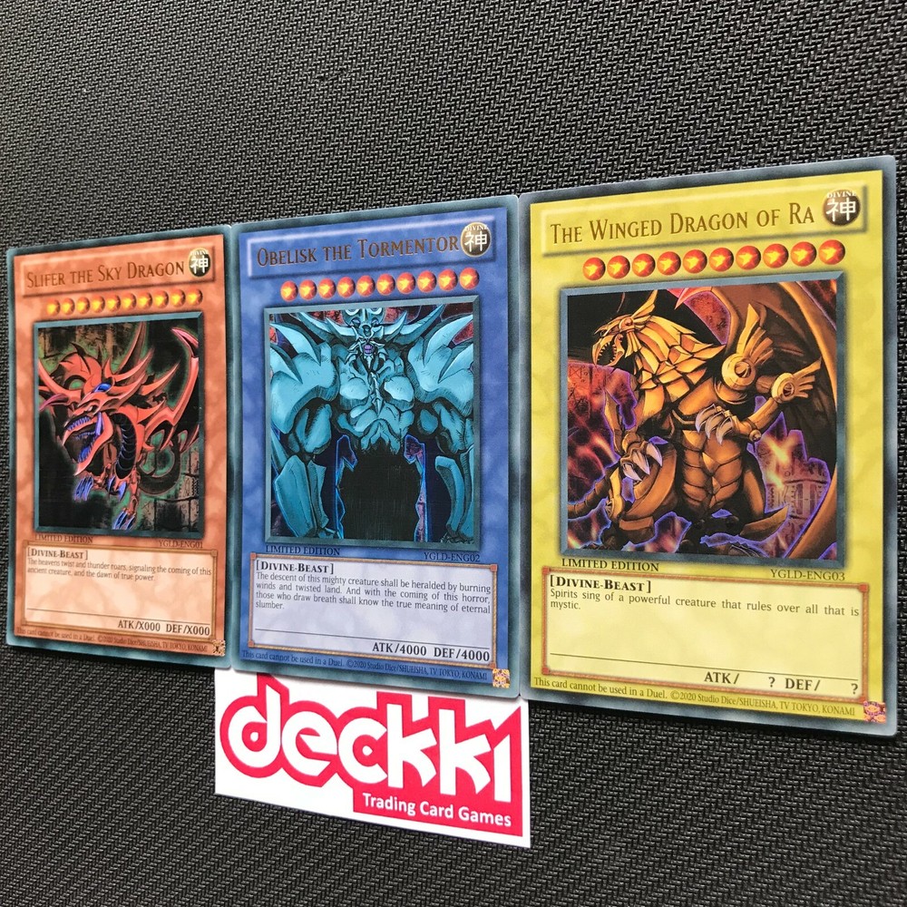 YuGiOh! Trading Card Game ALL 3 GOD CARDS - Ultra Rare, LIMITED EDITION: YGLD-ENG01 Slifer the Sky Dragon YGLD-ENG02 Obelisk the Tormentor YGLD-ENG03 The Winged Dragon of Ra Shipped Doubled Sleeved for safety. Grading Scale (M) : Mint: New Condition, with virtually no damages. **Please be aware that New Cards can have minor factory marks and imperfections. Opened straight from Yugi's Legendary Decks (2021 Reprint). Language: English Deckki-TCG Established in 2010, Deck ki is a supplier of YuGiOh! and Pokemon Trading Cards, and Trading Card Accessories. Trusted seller with over 5000 reviews, selling collectibles for over 10 years, buy with confidence. Based in the United Kingdom and ships worldwide. Postage FREE Delivery in the UK. Same-day dispatch aim. Worldwide shipping available. Returns 30 day returns for faulty/incorrect orders. Returns only accepted in original condition.