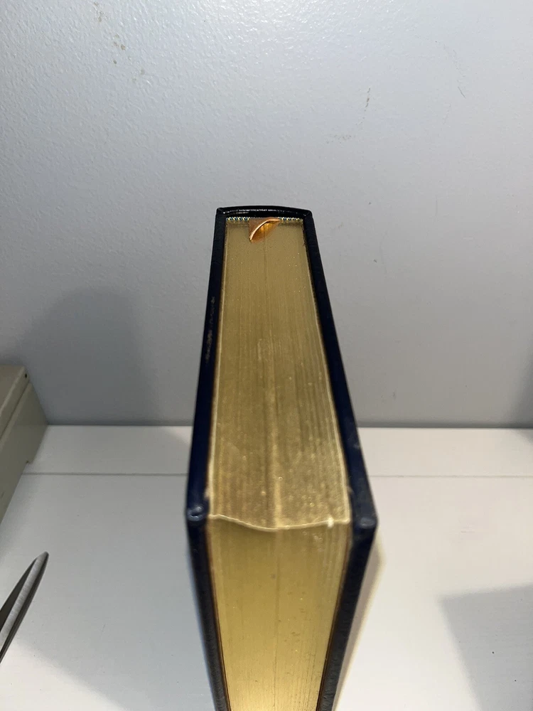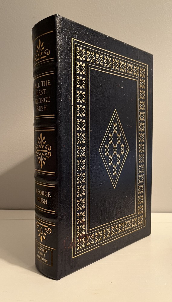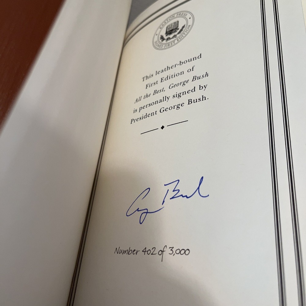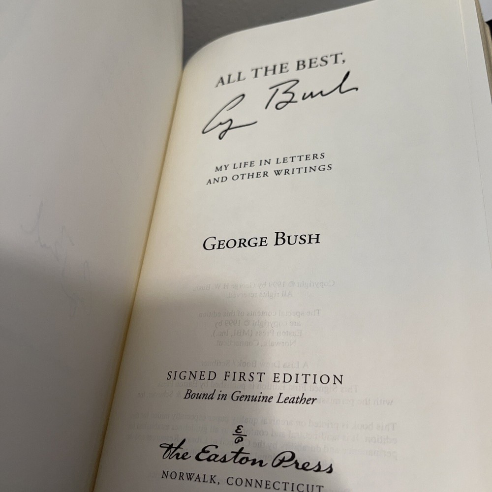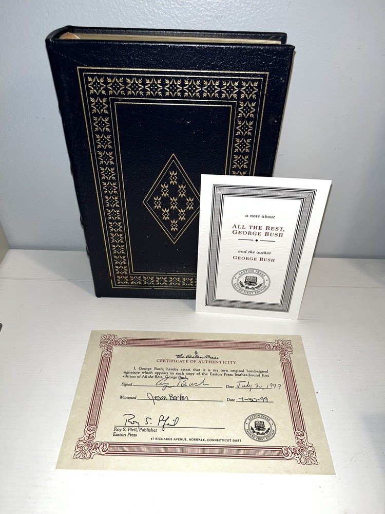 ALL THE BEST BY GEORGE BUSH EASTON PRESS 1999 1ST EDITION SIGNED. ALL THE BEST MY LIFE IN LETTERS AND OTHER WRITINGS BY GEORGE BUSH SIGNED FIRST EDITION BOUND IN FULL LEATHER 1999 EASTON PRESS Full leather, cover and spine decorations in gilt, faux raised bands, all edges gilt, satin moire endpapers, ribbon bookmark. Book has a tiny scratch on the gilt.Signed by George Bush. The book is in outstanding condition with the exception of the damage on the front cover. Unfortunately it was up against another book for an extremely long time. When the books were taken down from the bookshelf the red book that was up against this book left some residue. The red book also had silver lettering and there are tiny flecks of silver. I am not an experienced person in the art of book restoration so I will leave that project to this book’s next owner. There are also spots where the gold detail at the bottom of the front cover and one spot on the back cover have “oxidized”. The price reflects the condition the book is in. It definitely appears that this book has never been opened or read except in order to take photos.