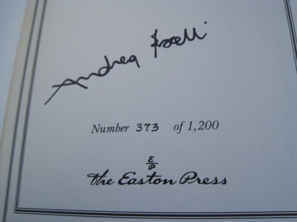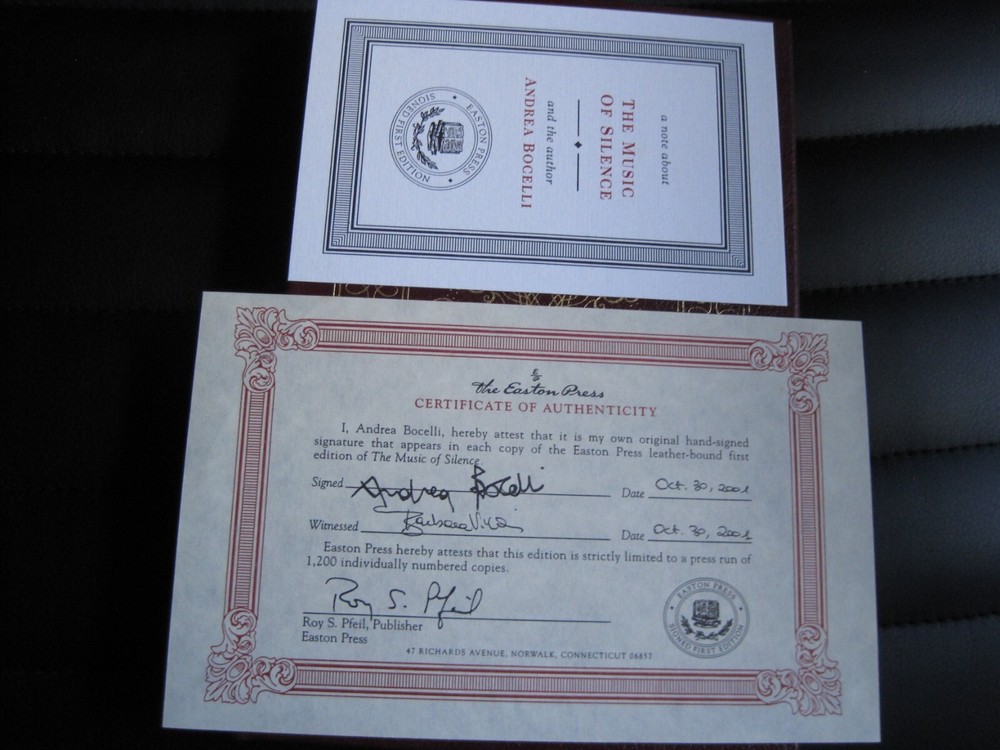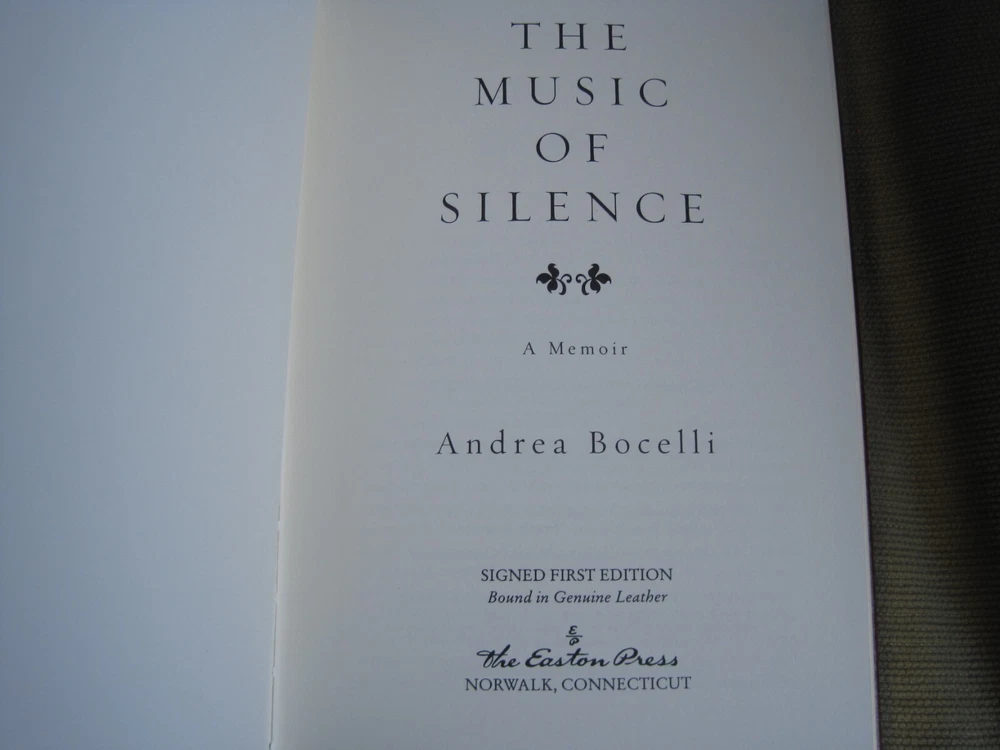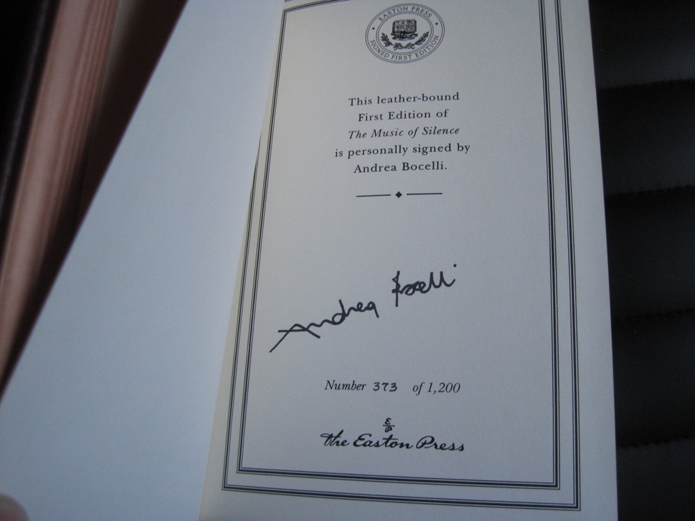 This is a leather bound signed numbered first edition of Andrea Bocelli's best-selling autobiography - "The Music of Silence", a fascinating book written by the famous Italian music legend. A very exciting reading, describing both his successful music career and his dramatic personal life. The book is unread and in great condition, with just a little rubbing of the gold on the cover (see images). Signed by the famous music legend on the limitation page, this is copy number 373 of only 1200 ever printed. The book has the signed and dated certificate of authenticity and the publisher's note card included. Easton Press books are the golden standard in the publishing industry, highly collectible and lasting generations. Easton Press Full Genuine Leather Dubbed Spine Accented Wit 22 kt. Real Gold Satin Ribbon Page Marker Distinctive Cover Design Gilded Page Edges To Protect Against Humidity High Quality Acid - Free paper Smyth-Sewn Pages Silk-Moire Endleaves I combine multiple items for savings on shipping charges. I ship worldwide. Please ask about international shipping charges and/or different shipping options. Please check out my other auctions for several rare signed books for sale. Thank you!
