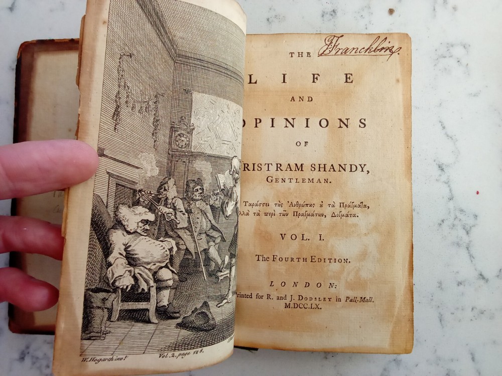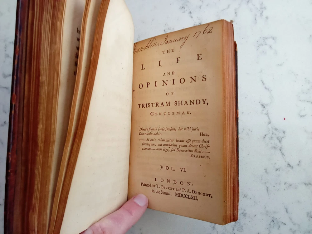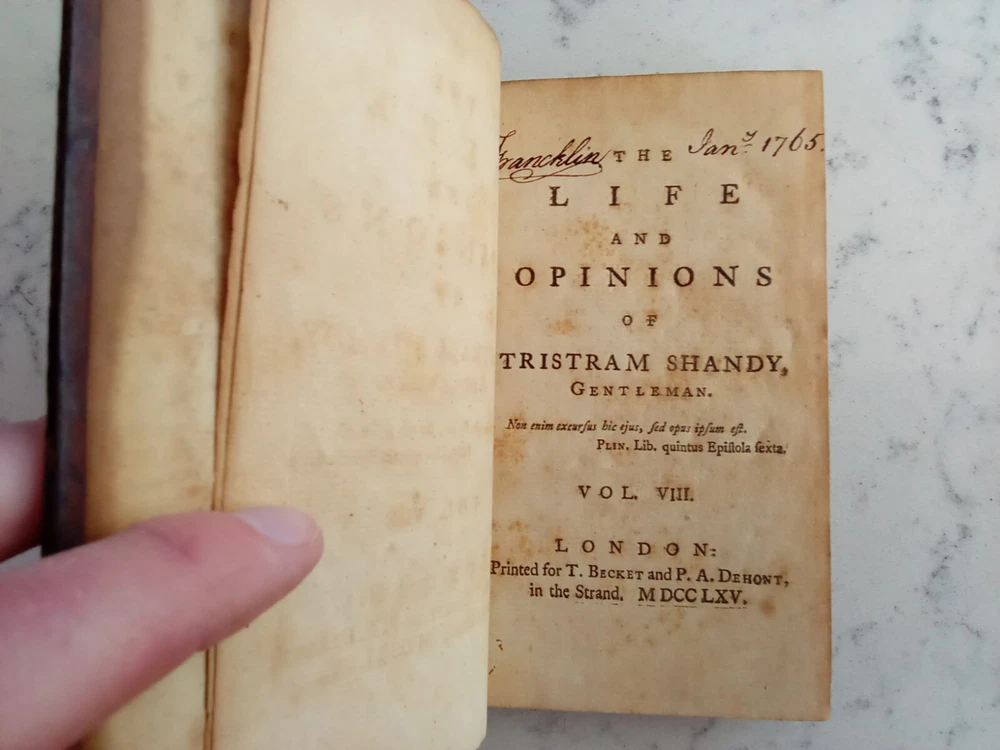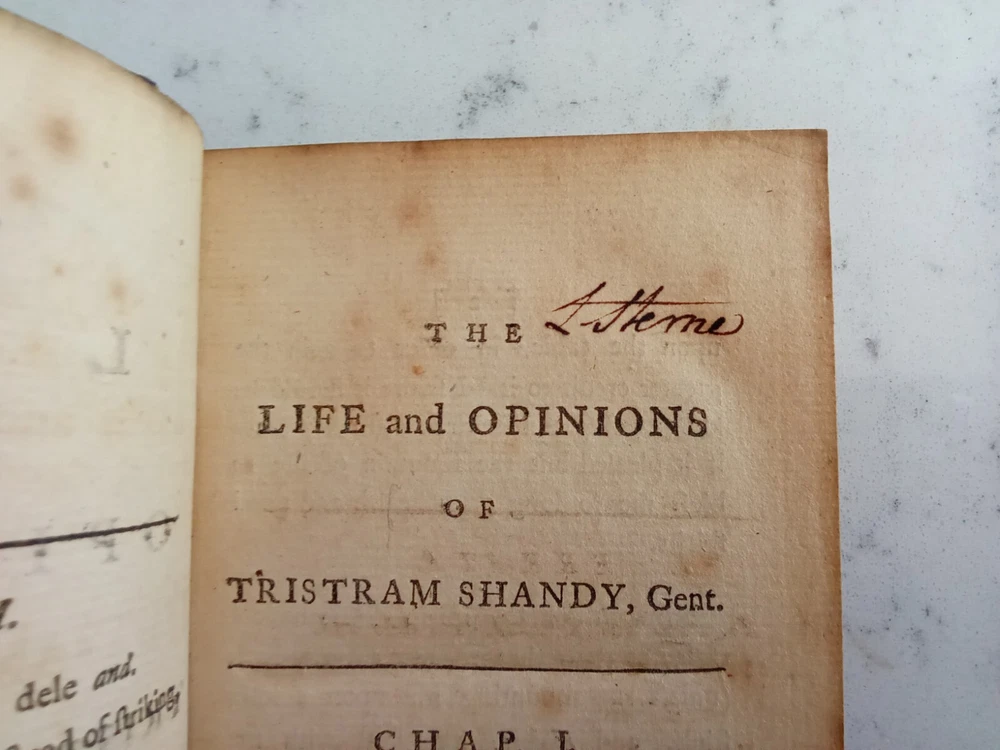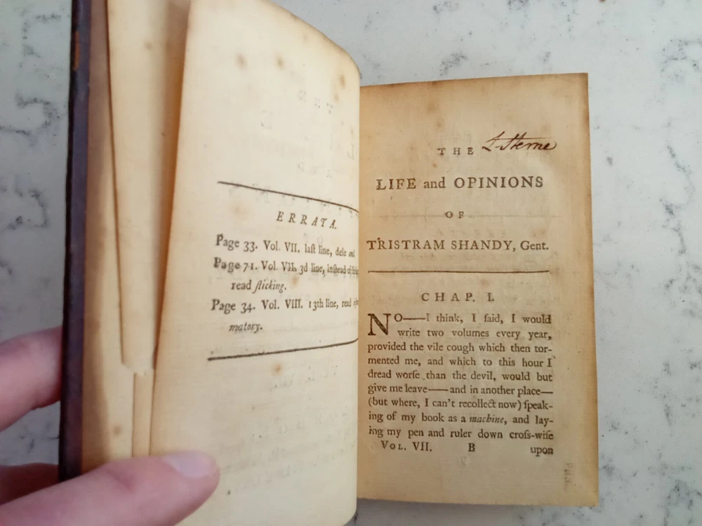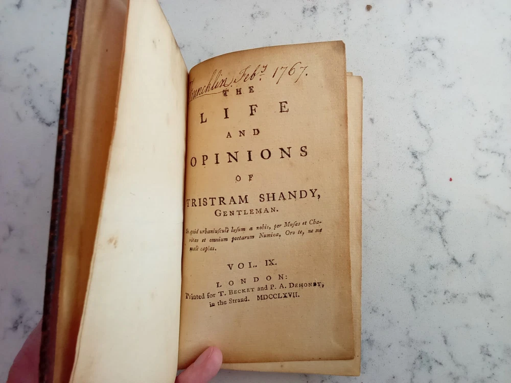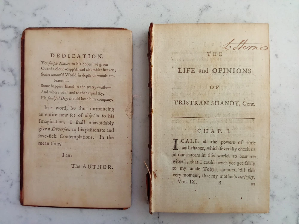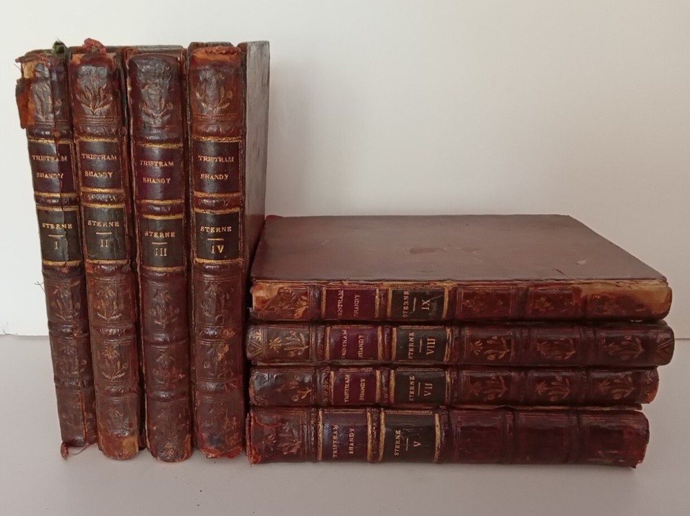 Laurence Sterne, The Life and Opinions of Tristram Shandy, Gentleman (1 760-1767) 9 volumes 8 book (volume 5 and 6 are bound together) Volumes 5, 7, and 9 all signed by the author 6.1/4 inches high