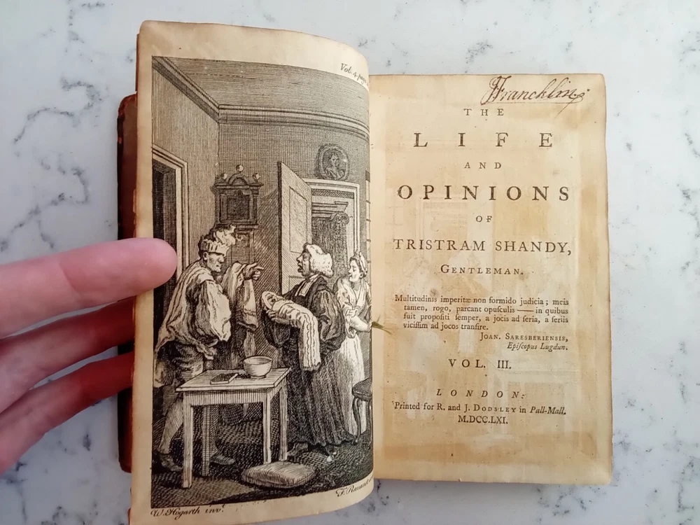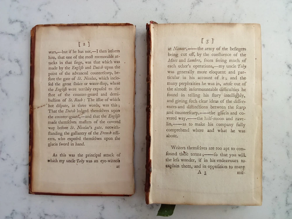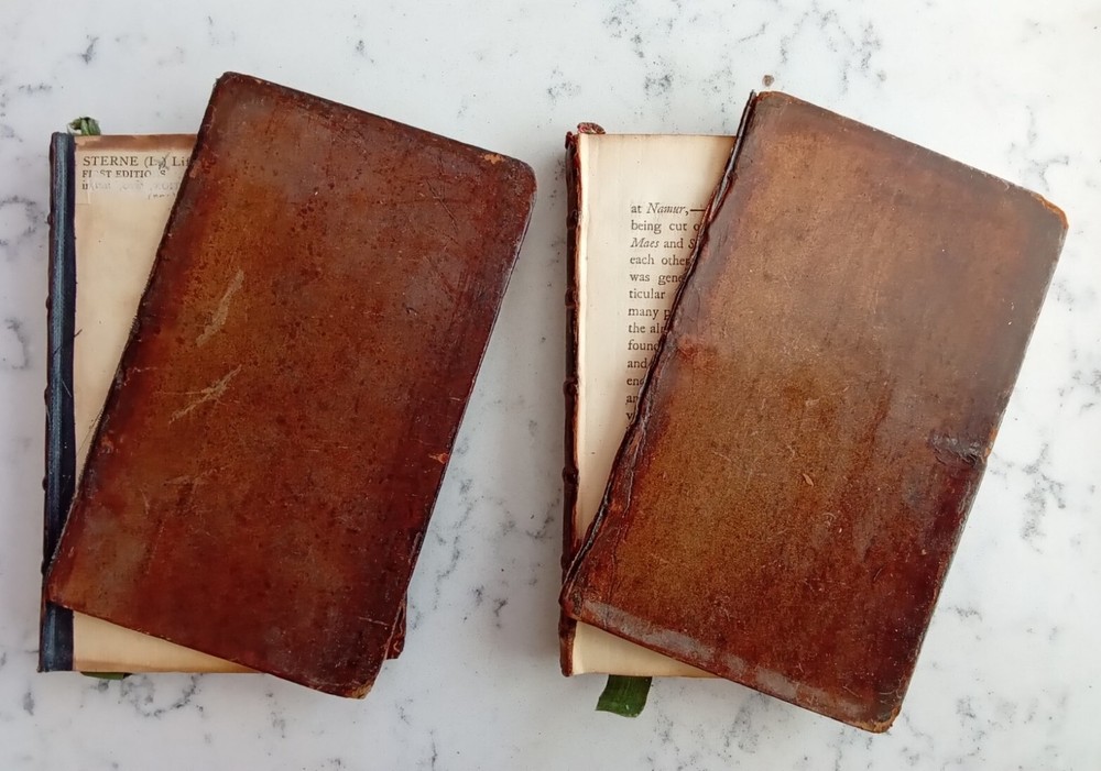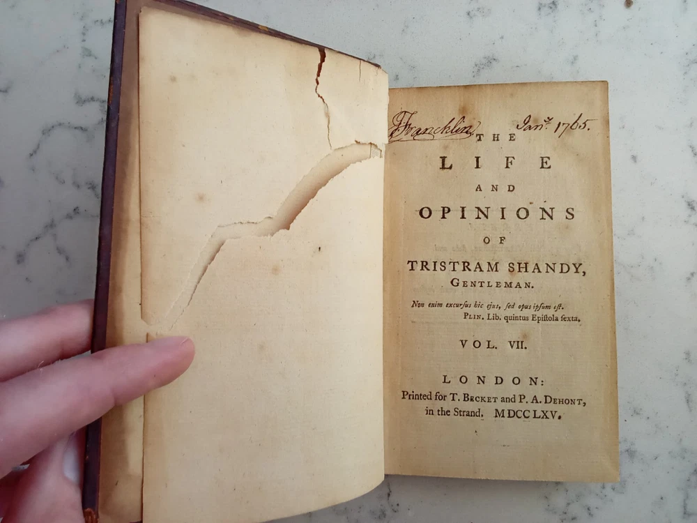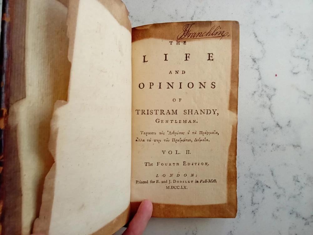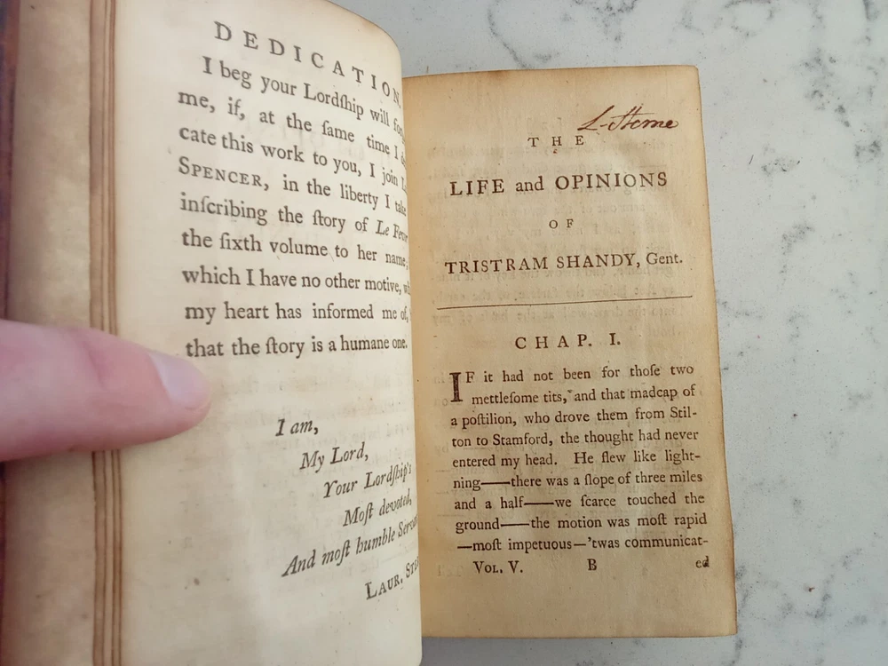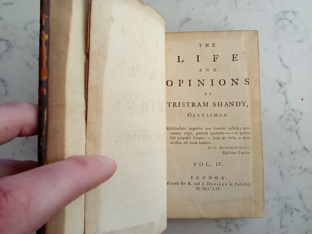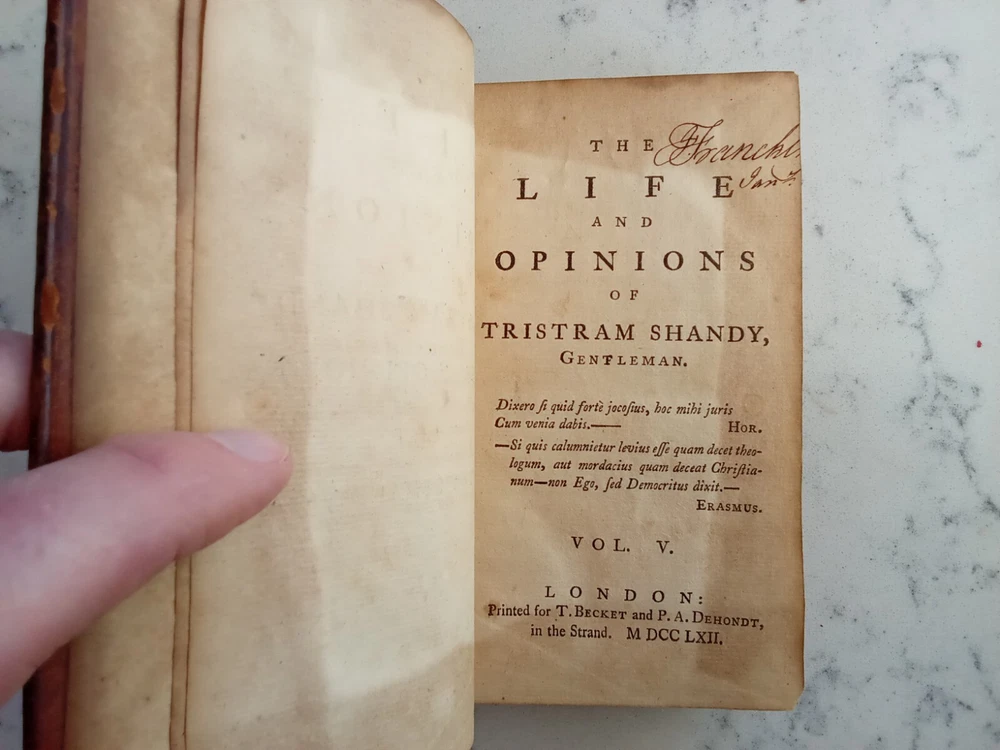 Laurence Sterne, The Life and Opinions of Tristram Shandy, Gentleman (1 760-1767) 9 volumes 8 book (volume 5 and 6 are bound together) Volumes 5, 7, and 9 all signed by the author 6.1/4 inches high