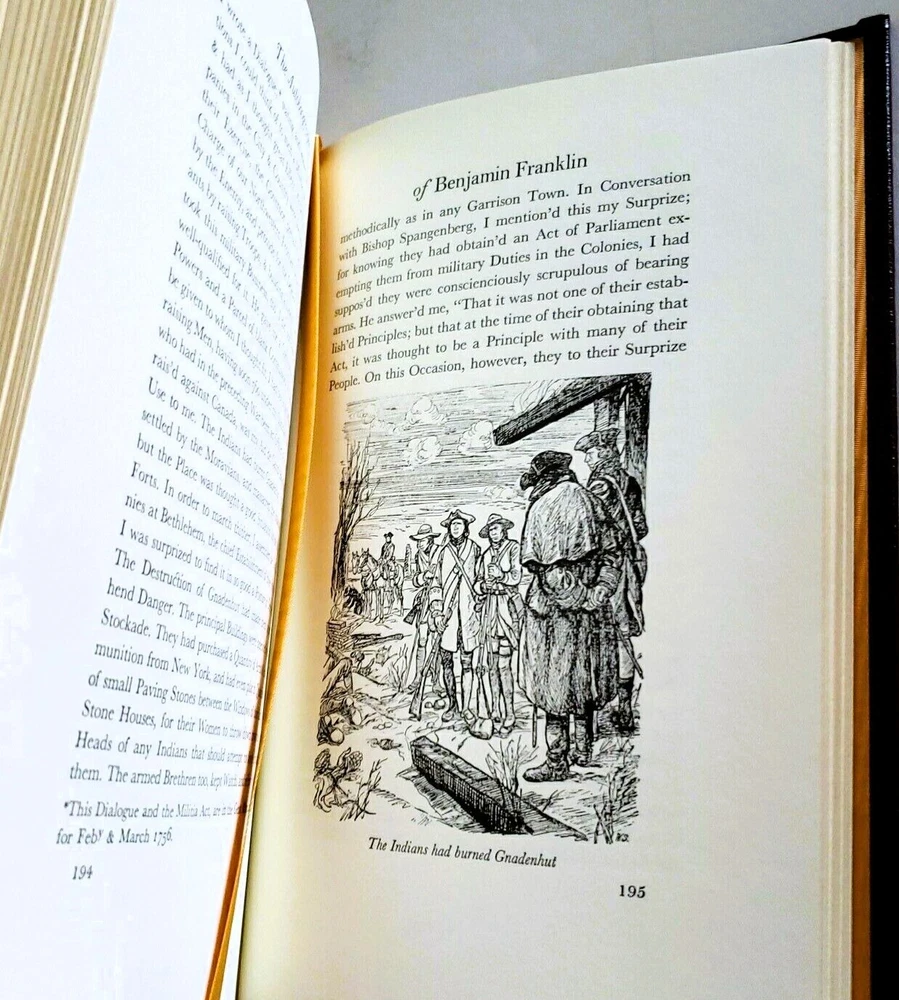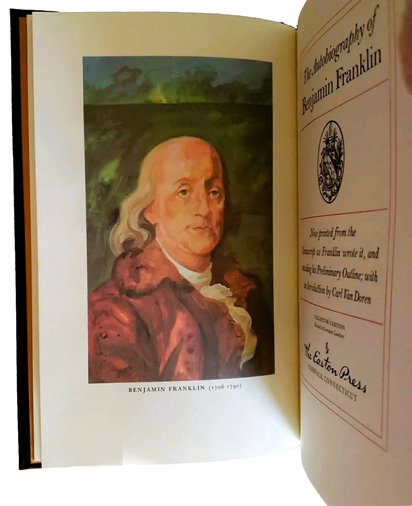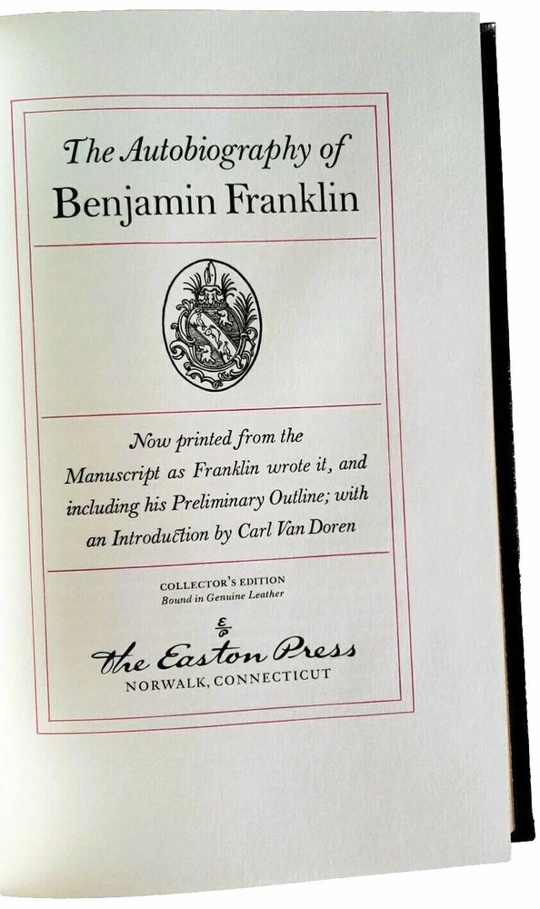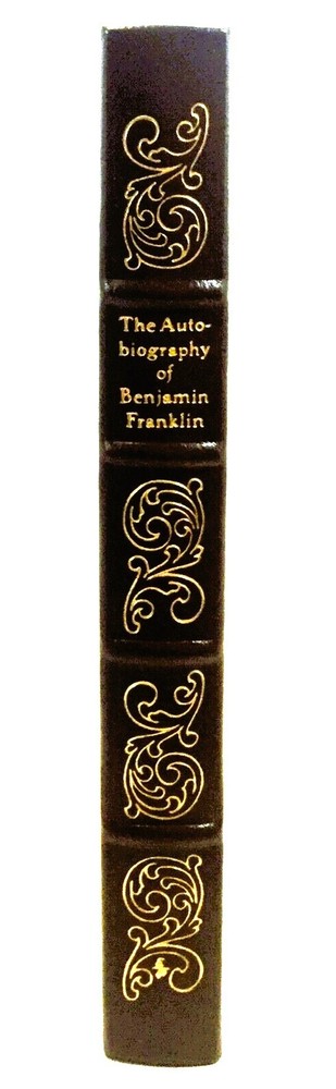 Beautiful Leather-bound Collector's Edition of *** The Autobiography of Benjamin Franklin *** *************************************************************** Condition: LIKE NEW / FINE Published by Easton Press in 1976 Part of the 100 Greatest Books Ever Written series Bound in Genuine Leather Hubbed Spine with Smyth-sewn Binding Accented in 22 kt GOLD Beautiful Illustrations by William Sharp Printed on Acid-neutral, archival quality paper to last generations Printed & Bound in the U.S.A. *************************************************************** ** BOOK GRADING ( CONDITION ) STANDARDS ** BRAND NEW / FACTORY SEALED · Self-explanatory. AS NEW / FINE / MINT · Virtually new, without faults or defects. · The highest grade given to books, aside from BRAND NEW. NEAR FINE (NF) · Excellent condition with few VERY minor “defects” such as faint signs of wear and/or rubbing. · No markings of any sort. (i.e. ownership (“Ex Libris”) markings, underlining, notes, highlighting, book plates, etc… · The binding should still be firm. VERY GOOD PLUS (VG+) · Approaching NEAR FINE with the exception of a few more signs of wear or rubbing. · No markings of any sort. (i.e. ownership (“Ex Libris”) markings, underlining, notes, highlighting, book plates, etc… · The binding should still be firm. VERY GOOD (VG) · A typical used book which is no longer fresh and crisp, but it is still complete and will have no major defects. · Potential Defects Present: o Book plates or other ownership (“Ex Libris”) marks. o Few small scuff marks and/or scratches on cover, corners and/or edges may have a bit more wear. o Cloth on boards slightly faded. o Dust covers may have a few minor flaws such as a closed tear or minor chip or chipping or a price clipped front flap. · The binding should still be fairly firm. · If any major defects are present, they will be noted. GOOD (G) · A well-worn, used book which still has all of its pages. · The lowest grade given to collectable books. · Potential Defects Present: o Should have no more than one major defect such as a cracked hinge, or damp staining. o If the cloth binding is torn or heavily faded it would cause the book to be graded as "good". o If a dust jacket has major tears, heavy chipping, or tape repairs it should be graded as good. · Any major defects will be noted. FAIR · A heavily worn, used book. · Several defects present. · I will not normally buy or sell books in this condition, with the exception of VERY rare books. ** GENERAL EXAMPLES OF DEFECTS ** VERY MAJOR Water damage, binding breaks, underlining in text, large tears, pages missing, ex-library copies, mold or mildew damage. MAJOR Small tears, spine slant (roll), rip to the cloth or paper binding, hinge or joint of binding starting to separate. MINOR Fading of the cloth or paper binding, dust jacket scuffed or rubbed, light soiling, minor chipping on any edges. ALTERATIONS Book plates or other ownership (“Ex Libris”) markings book plates, gift inscriptions or a remainder mark on one of the edges of the text block, front flap of dust jacket is price clipped. If a different shipping method is preferred, please message me prior to purchase & I will let you know as soon as I update the listing with the new shipping method .