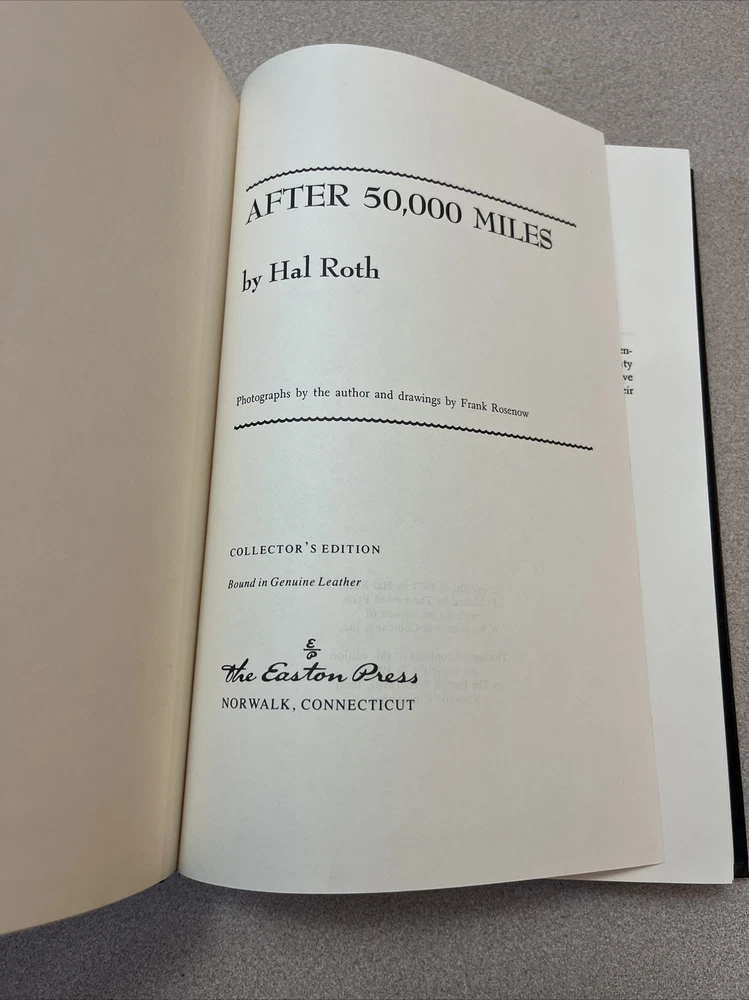 This is a rare and exquisite collector's edition book titled "After 50,000 Miles" by Hal Roth. The book is published by Easton Press in 1990, in English language, and has special attributes that make it a valuable addition to any collection. The topic of the book is nautical and it is a biography & autobiography of the author who sailed over 50,000 miles. The book has a leather binding and is in excellent condition, making it a great buy for any book lover or collector.