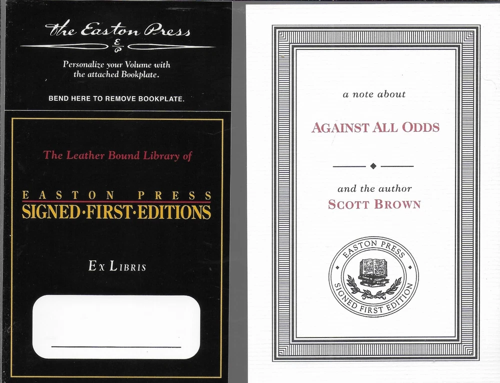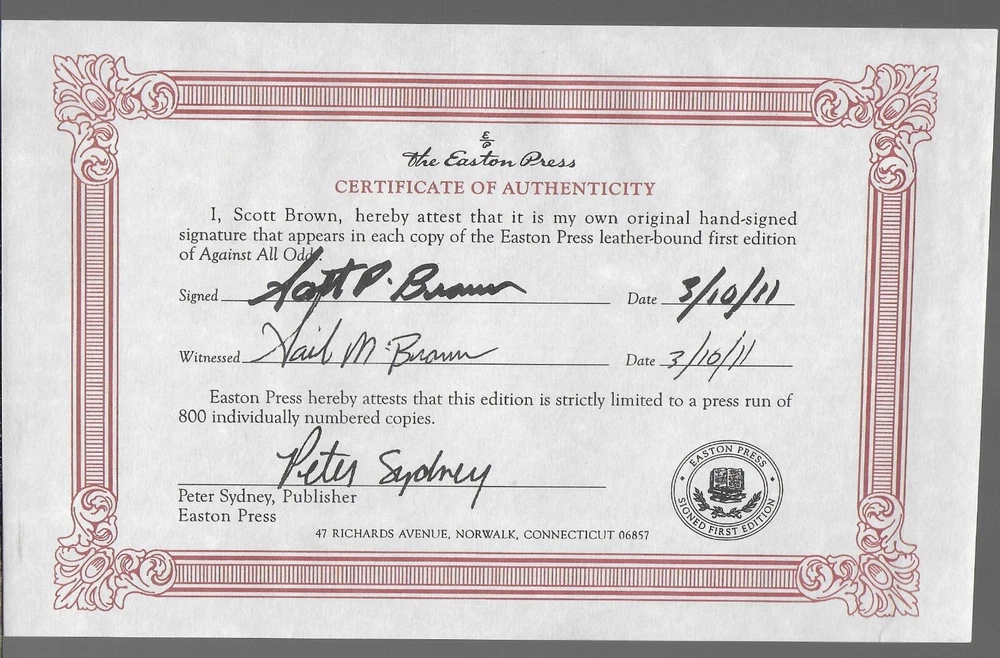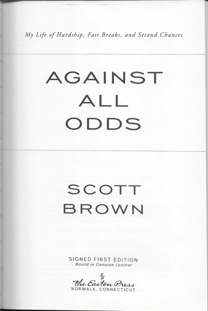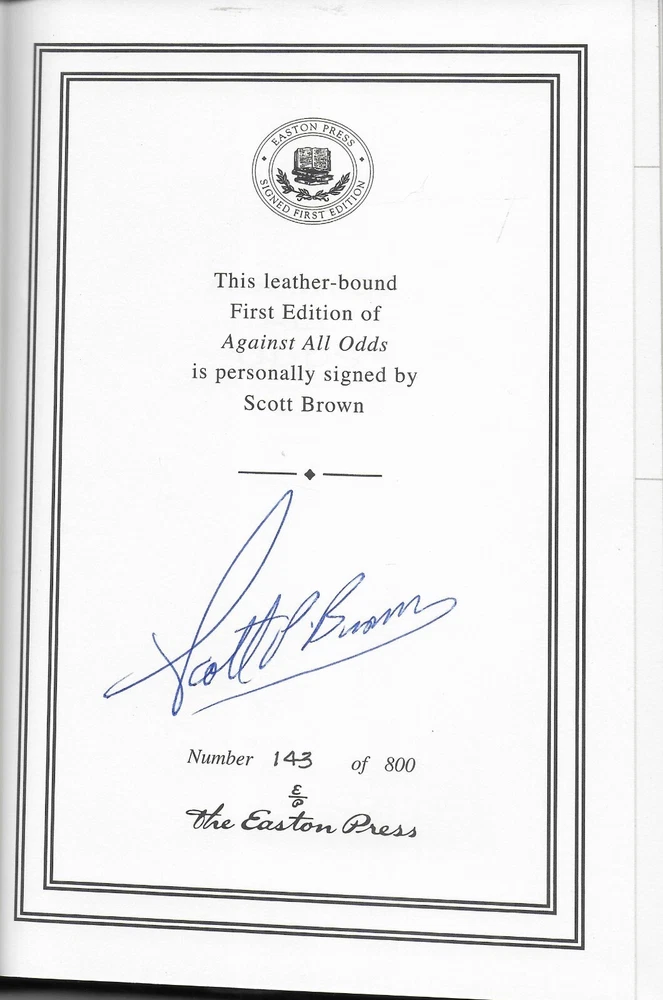 Against All Odds by Scott Brown, Easton Press, Signed COA, #143/800 You are buying Against All Odds by Scott Brown. The Easton Press, Norwalk, CT published the book special contents copyright 2011. The book is a signed limited first edition. It is copy # 143 of an edition of 800 copies. Scott Brown signed the limitation page. The interior, attached bookmark, and leather-bound cover are in fine condition. The book is 6 1/4” x 9 1/4” tall and 325 pages. There are 49 photographs.. Laid in the front is the signed Easton Press Certificate of Authenticity, Easton Press Note, and an unattached blank Easton Press Signed bookplate . Please if you need any additional information and photos, eBay message me immediately. Combine Shipping Discount!!!!! Save money when you buy more than one item (lot) from us! Except in rare cases, s & h to a U. S. address via media mail in the same box is $1.25 for each additional book. eBay may automatically send a combine invoice with the wrong s & h. Please wait to pay until you receive my combine invoice with the correct s & h. PLEASE CHECK OUT MY eBAY STORE AND OTHER AUCTIONS!!! 7172024 102023