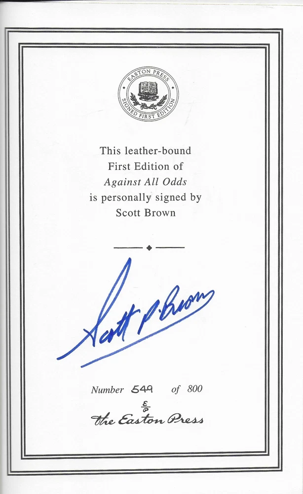 Against All Odds by Scott Brown, Easton Press, Signed COA & Easton Press Note You are b uying Against All Odds by Scott Brown . The Easton Press, Norwalk, CT published the book special contents copyright 2011 . The book is a signed limited first edition. It is copy # 549 of an edition of 800 copies. Scott Brown signed the limitation page. He also signed the page facing the title page with inscription “keep the faith!” and the number 41 under his signature. I assume this was given to a supporter in his failed Senate reelection. The interior, attached bookmark, and leather bound cover are in fine condition. The book is 6 1/ 4 ” x 9 1/ 4 ” tall and 32 5 pages. There are 49 photographs.. Laid in the front is the signed Easton Press Certificate of Authenticity, Easton Press Note brochure, and an Easton Press Library of the Presidents brochure . Please if you need any additional information and photos, eBay message me immediately. Combine Shipping Discount!!!!! Save money when you buy more than one item (lot) from us! Except in rare cases, s & h to a U. S. address via media mail in the same box is $1.25 for each additional book. eBay may automatically send a combine invoice with the wrong s & h. Please wait to pay until you receive my combine invoice with the correct s & h. PLEASE CHECK OUT MY eBAY STORE AND OTHER AUCTIONS!!! 1232023102023