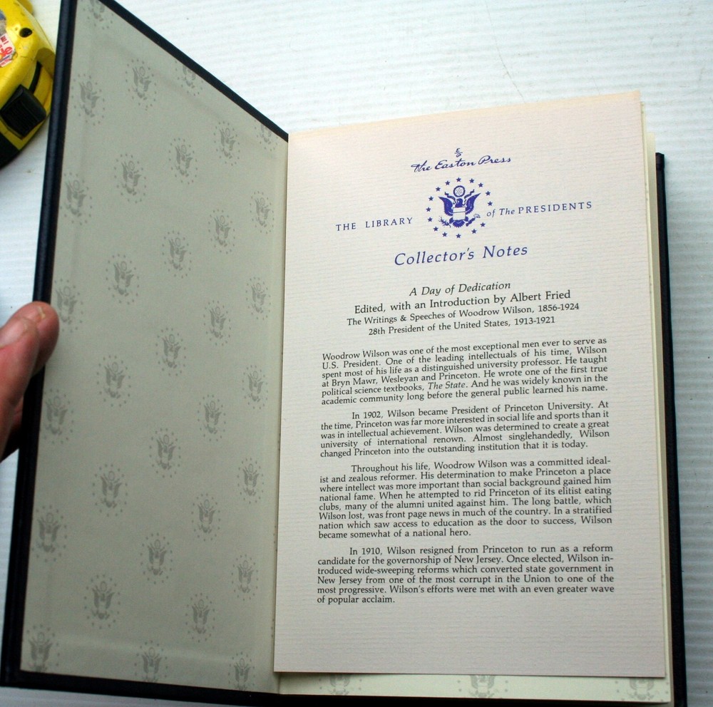 Tight, flat, square, sharp books with 22K gold inlay and edge treatment with very minor blemishes. Satin marker ribbon is without fraying. Silk moire end pages with the Presidential Seal, which were dropped in later printings. Collectors' notes are laid in. Shelf transfer on the bottom edge. We have cleaned and conditioned these books. From the Ivy League to the oval office, Woodrow Wilson was the only professional scholar to become a U.S. president. A professor of history and political science, Wilson became the dynamic president of Princeton University in 1902 and was one of its most prolific scholars before entering active politics. Through his labors as student, scholar, and statesman, he left a legacy of elegant writings on everything from educational reform to religion to history and politics. Woodrow Wilson: Essential Writings and Speeches of the Scholar-President collects Wilson’s most influential work, from early essays on religion to his famous “Fourteen Points” speech, which introduced the idea of the League of Nations. Among the last of the presidents to write his own speeches, Wilson left behind works which offer impressive insights into his mind and his age. Deeply religious, Wilson looked to his faith to guide his life and wrote candidly about the connection. A passionate advocate of liberal learning, he broadcast his ideas on educational reform with missionary intensity. In politics he moved from a traditional nineteenth-century conservative view of government to a progressive, international vision which transformed American politics in the new century. His writings allow us to trace the intellectual struggle that took the nation from a position of neutrality in World War I to its role as a central player on the world stage. Penetrating and eloquent, the works gathered here represent the best and the most important of Wilson’s writings that retain enduring interest. A rich repository of ideas on the American people and America’s purpose in the world, these works reveal the thoughts of one of the most acute analysts and actors in the drama of American politics.