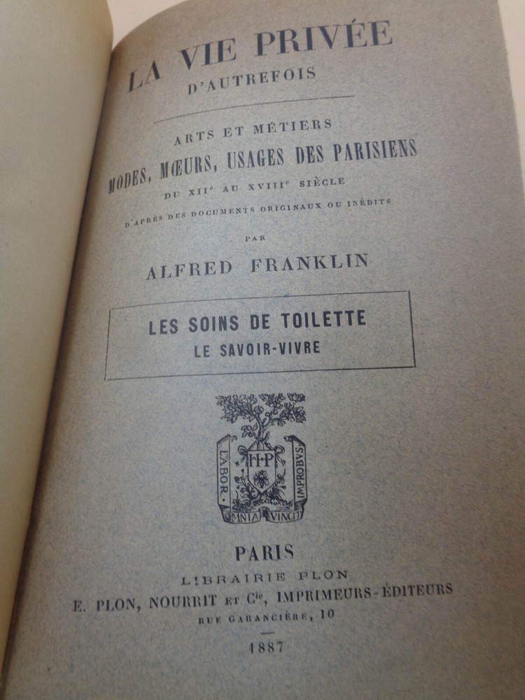 Alfred Franklin The private life of yesteryear Toiletries, etiquette Editions Plon, 1887 Half sheepskin (18x12cm), 223 pages Binding a little rubbed and blackened otherwise good condition Alfred Franklin The private life of yesteryear Toiletries, etiquette Editions Plon, 1887 Half sheepskin (18x12cm), 223 pages Binding a little rubbed and blackened otherwise good condition
