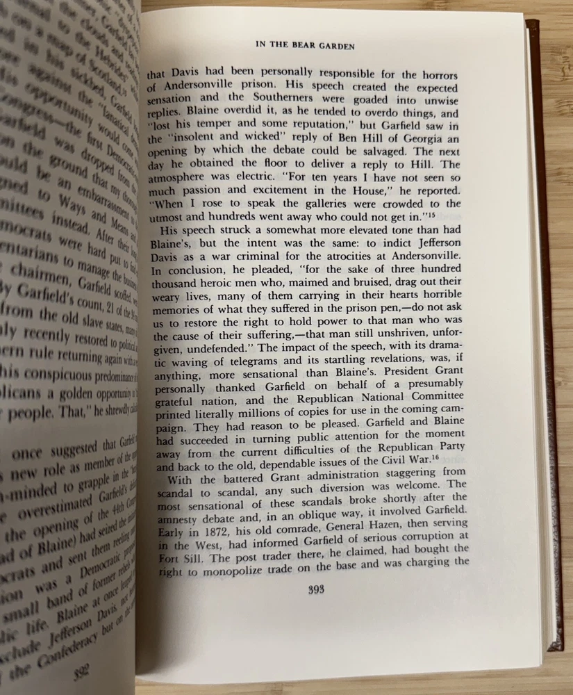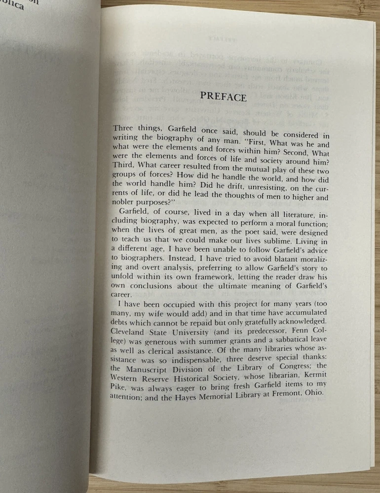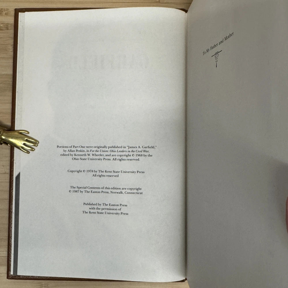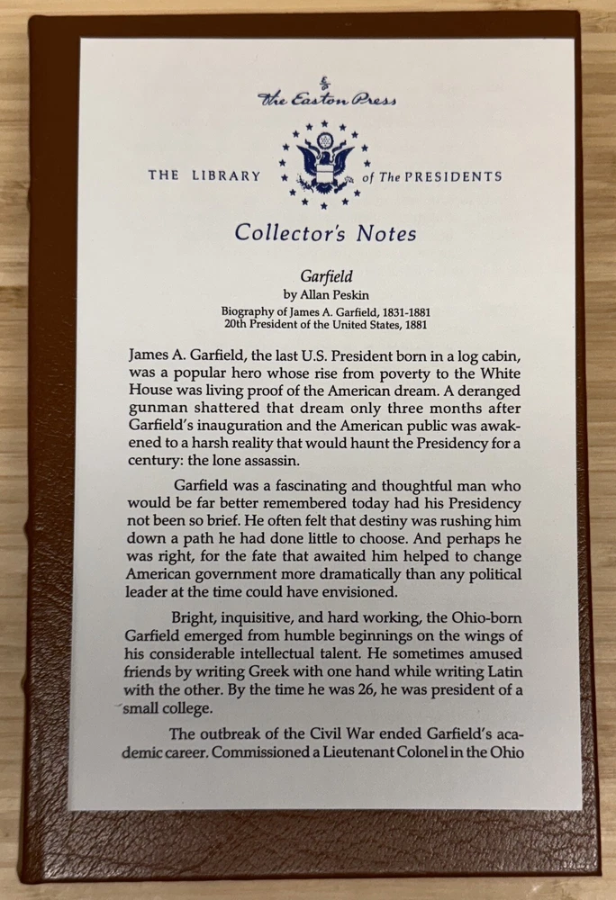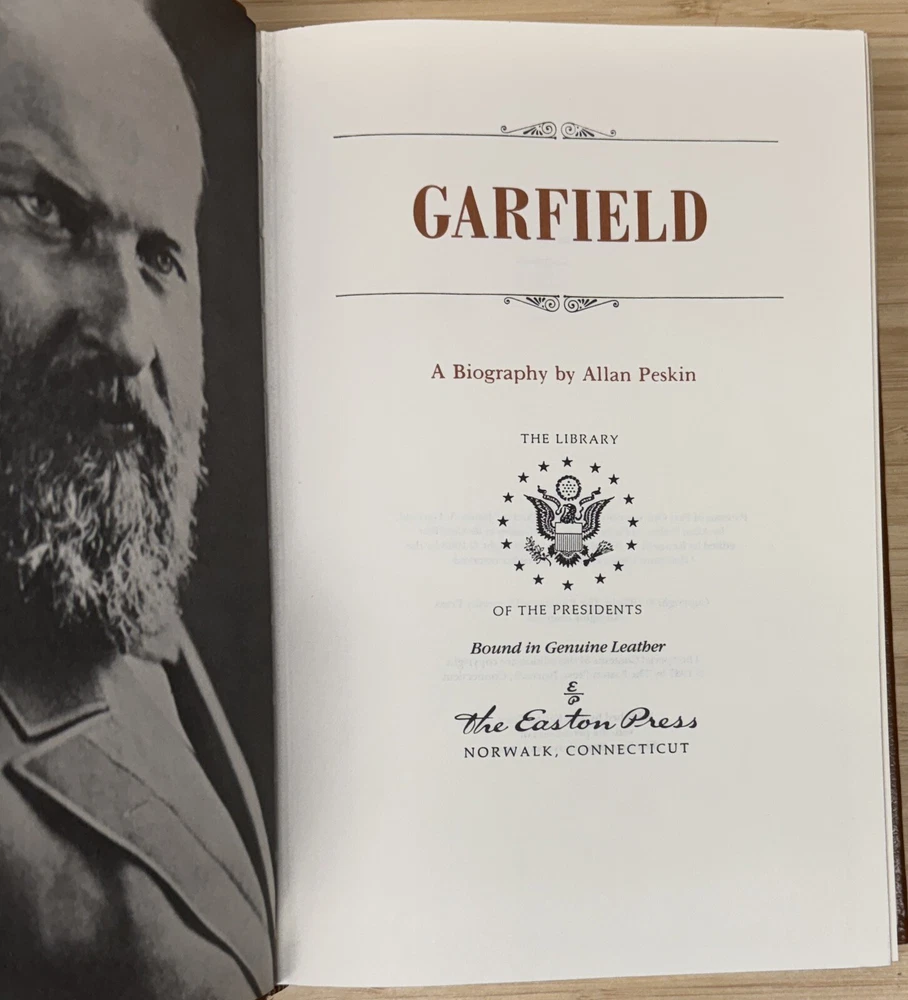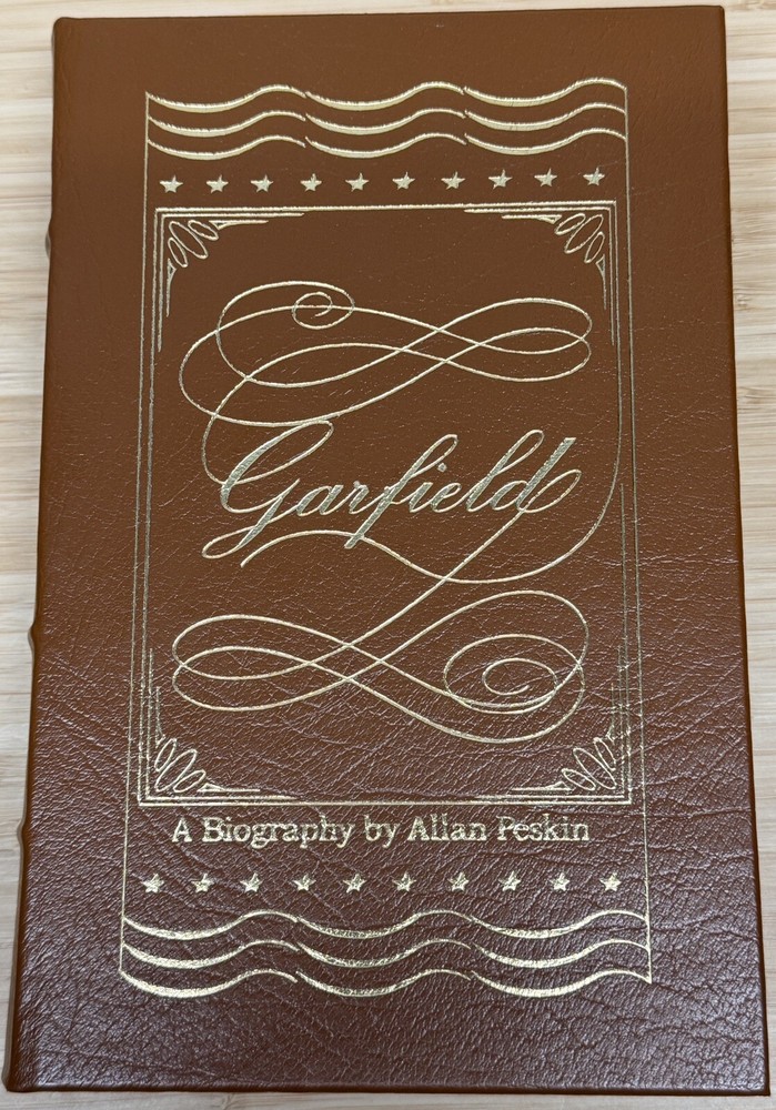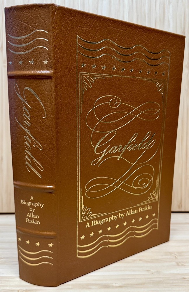 Garfield A Biography By Allan Peskin This is a stunning leather-bound collector's edition of Garfield: A Biography by Allan Peskin, published by Easton Press as part of The Library of the Presidents collection. The book features gilted page edges and is part of the Library of the Presidents series. It focuses on the topic of Presidential Biography and includes the author's collectors notes. The book is in excellent condition with a previous owners bookplate affixed to the inside of the front cover..
