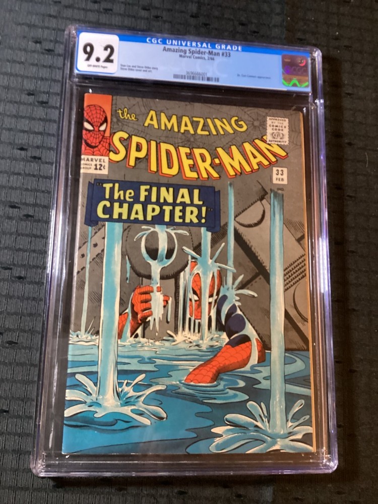 You are bidding on one great Comic Book : Amazing Spider-Man #33 CGC 9.2 NM- Silver Age Classic Ditko Cover 1966 Our shipping policy: We charge $16.95 for the 1st comic and then only add $4.00 for each additional comic shipped at the same time. Feel free to stretch your shipping out over a week or so before you pay. We will update your invoice each day as you go. Please bid with confidence as we have been selling on ebay for over 20 years. Thanks!
