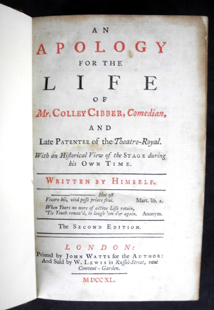 Used - acceptable - cover shows heavy use wear and aging to leather - has scrubbing and a crack full length in the front spine fold - has a piece of clear tape around the upper spine area - the two ribbon markers are fragile and are shortened and frayed - will need to be handled carefully and potentially need work on the front spine fold for consistent use. 1740 Bayntun Binding, as identified at the top edge of the verso of the ffep. About this book : An Apology for the Life of Mr. Colley Cibber, Comedian (1740) is an autobiography by Colley Cibber, an English actor, playwright, and Poet Laureate. The book chronicles Cibber’s life and career in the theater, detailing his rise from humble beginnings to prominence as a comedic actor and manager of Drury Lane Theatre. Written in a lively, conversational style, it offers insights into the 17th- and 18th-century London stage, including vivid anecdotes about performances, rivalries, and theatrical culture. Cibber also defends his controversial reputation, addressing criticisms of his work and personal character. The book is both a personal memoir and a valuable historical account of Restoration and early Georgian theater. S8B - E