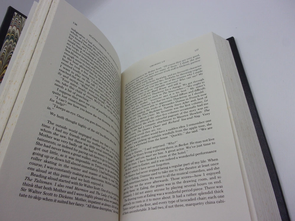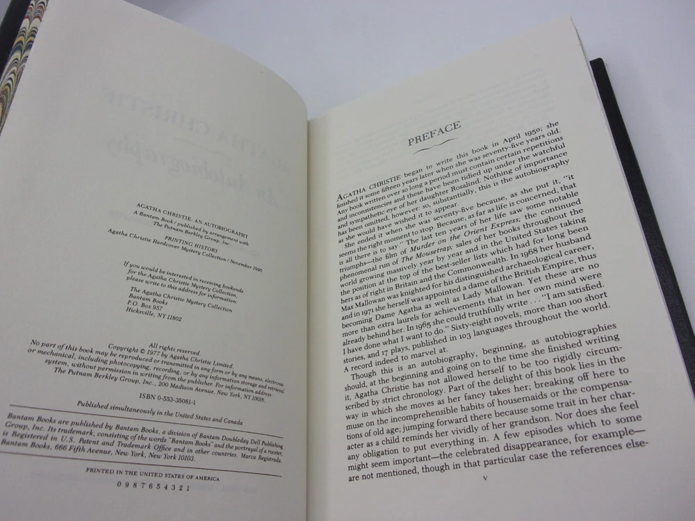 Thank you for looking at my Ebay item. This is a used, hardcover/leatherette book, no dust jacket as issued(8&3/4” by 5&3/4” by 1&5/8”). The Agatha Christie Mystery Collection, 1990, 1 st printing. ISBN 0553350811 The book is in fair condition. There is some cover fading, and heavy damage at the bottom near the binding edge. The binding is tight. No pages are missing, or written in, but there are a couple of orange highlights on the rear index pages. There is also some wear at the bottom edge, near the binding. Some slight exterior page edge discoloration/spotting. Please see pictures for the condition of the book you will receive. USPS Media Mail shipping, which includes tracking. Domestic US shipping only. Combined shipping is available.