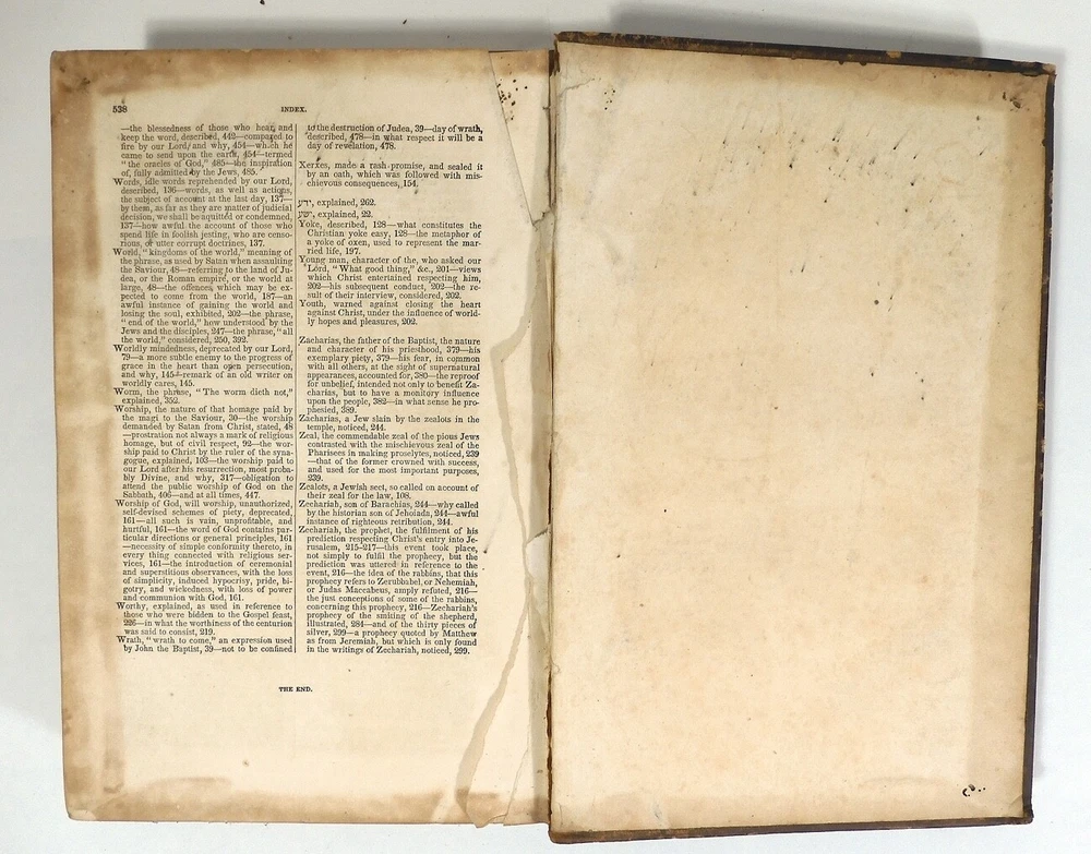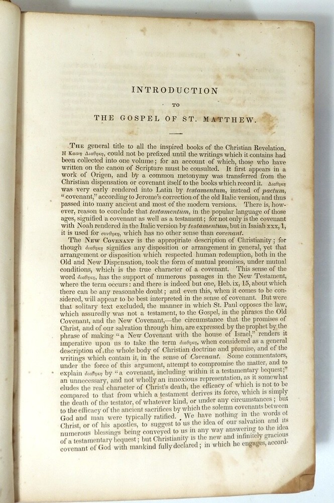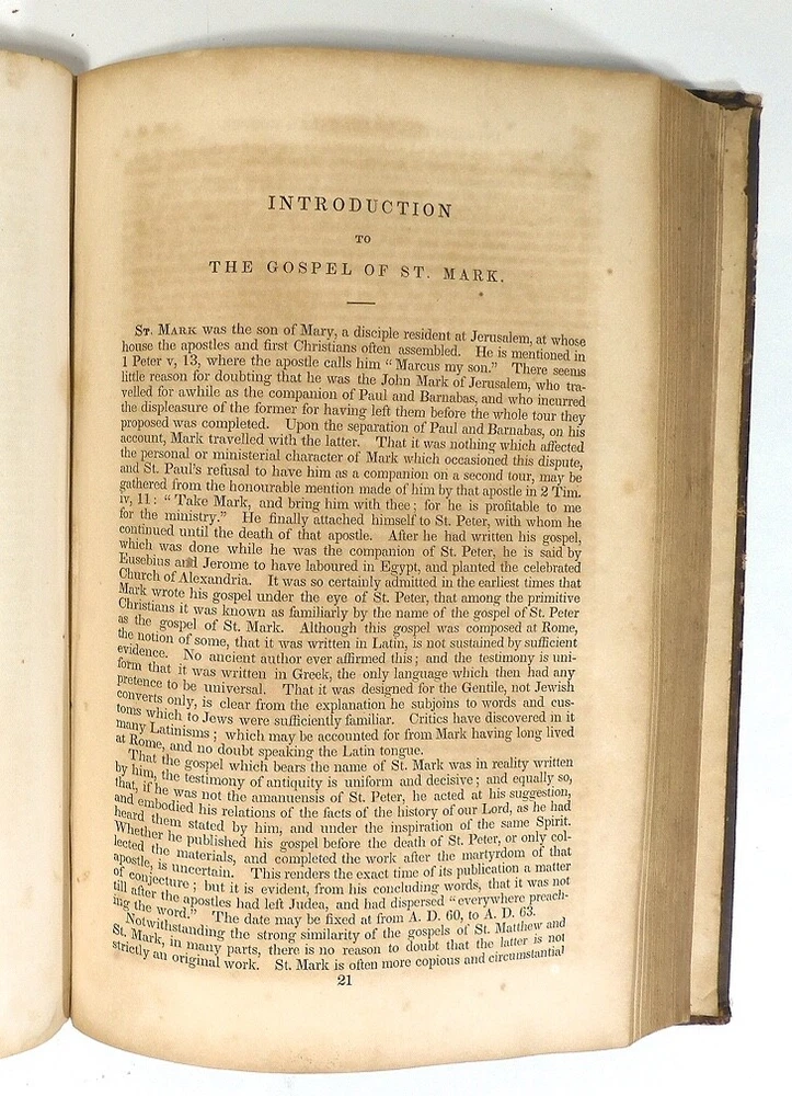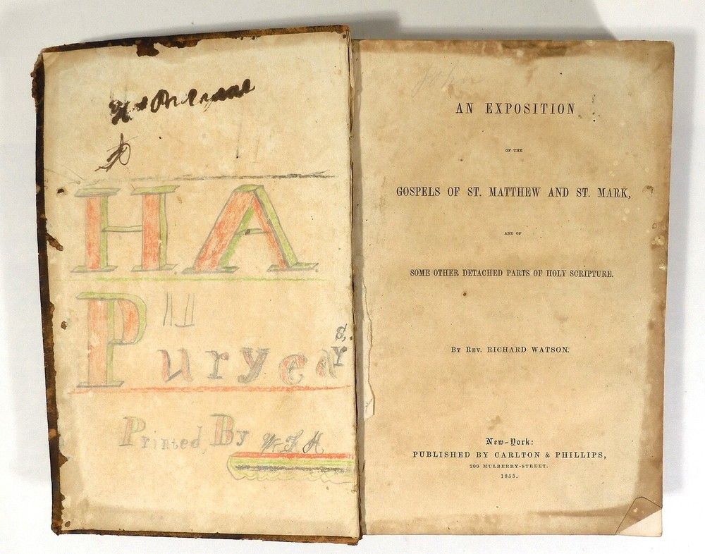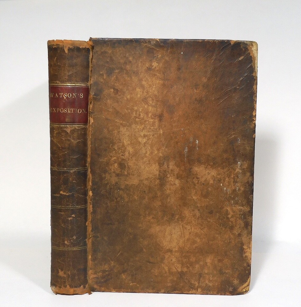 An Exposition of the Gospels of St. Matthew & St. Mark, 1855, by Rev. Richard Watson. The leather bound book has wear commensurate with a pre-civil war era book. The pages have browned from age but it is tightly bound. Front cover is barely attached at the top. Writing inside front cover but I didn’t see any other writing. Missing the blank pages in the front and back.
