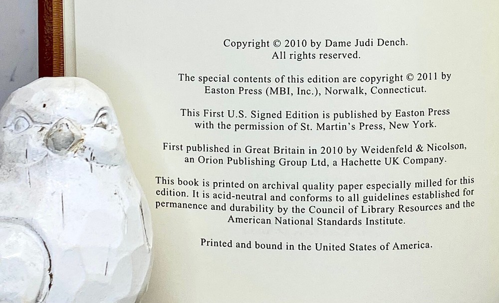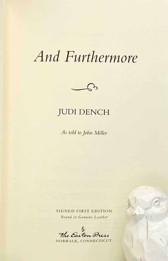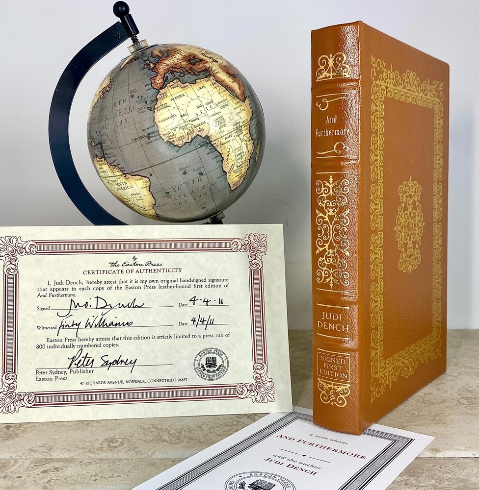 And Furthermore Signed by Judi Dench Easton Press First Edition Condition and Terms This book is in excellent never read, preowned condition. There are no attached bookplates, embossed seals, or other owner-marks to the interior. Sharp corners, no conspicuous scuffs or rubs. There are little to no scratches/marks to the gilded page-edging (see photos). Please see the photographs for best description. Please review all photos carefully before purchasing, and feel free to ask questions if the photos do not suffice. Additional photos can be provided upon request. Returns are only allowed due to shipping damage or item not being as described. Due to USPS insurance claims procedures, partial refunds are not allowed due to shipping damage. Items damaged in shipping must be returned in the original packaging as received. The USPS requires inspection of the packaging and item damaged. Synopsis From the moment Judi Dench appeared as a teenager in the York Mystery Plays it was clear that acting would be her career. Here she tells her story.