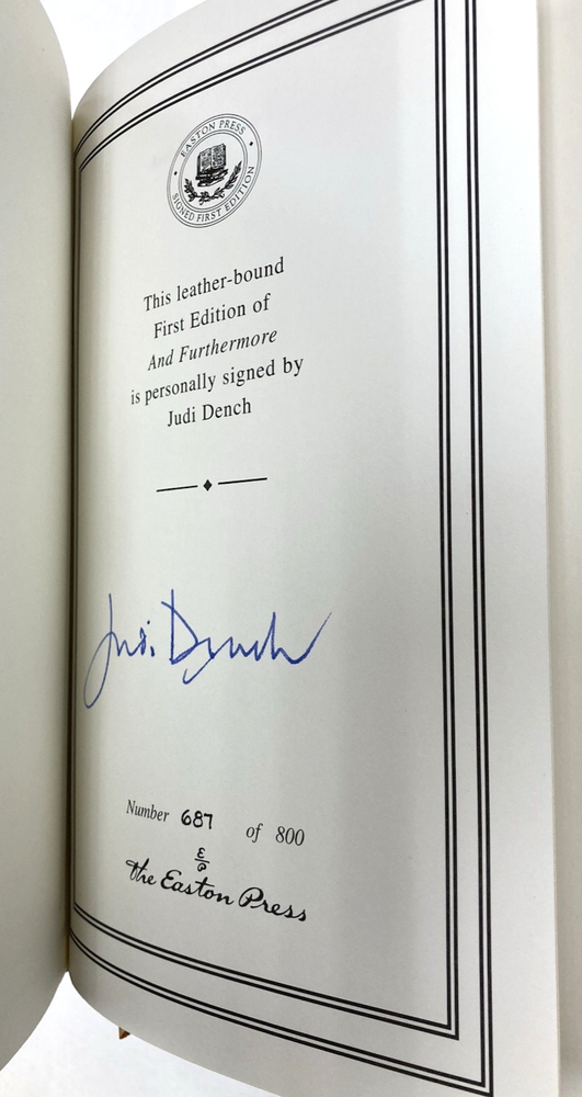 "And Furthermore" by Judi Dench (as told to John Miller). Easton Press, limited edition (#687/800), 2011, signed by Dench. COA, unused bookplate and "Note" laid in. Brown full leather with bright gilt lettering and decoration; trace wear only. Scattered tiny flecks to gilt edges. Binding sound and unread, interior clean. Brown silk moire eps and satin ribbon bookmarker. No prev owner names, stickers or stamps. Not ex-library. Measures 9 1/2'' x 6 3/8". 268 pp. From a smoke free home. Shipping on multiple items is combined whenever possible. Shipping rates are based on final weight and dimensions of packed item(s). Colors may differ slightly from reality due to differences in computer/mobile displays. Please bid with care and examine all photos and read entire description before bidding. Please pay within 3 days of auction's end. If payment is not made in a reasonable amount of time and no response is made to my messages, I will open an unpaid item case and you will be blocked from future bidding on my items.