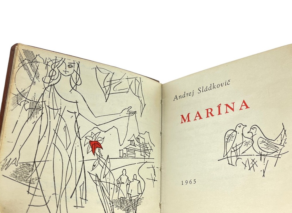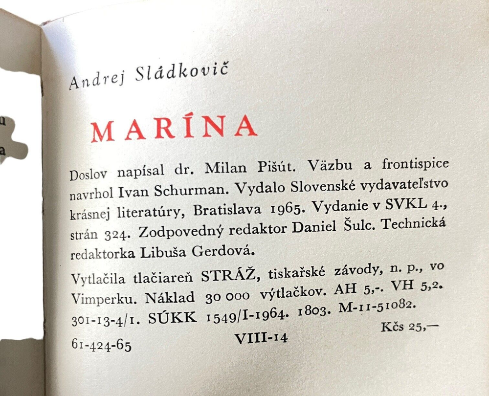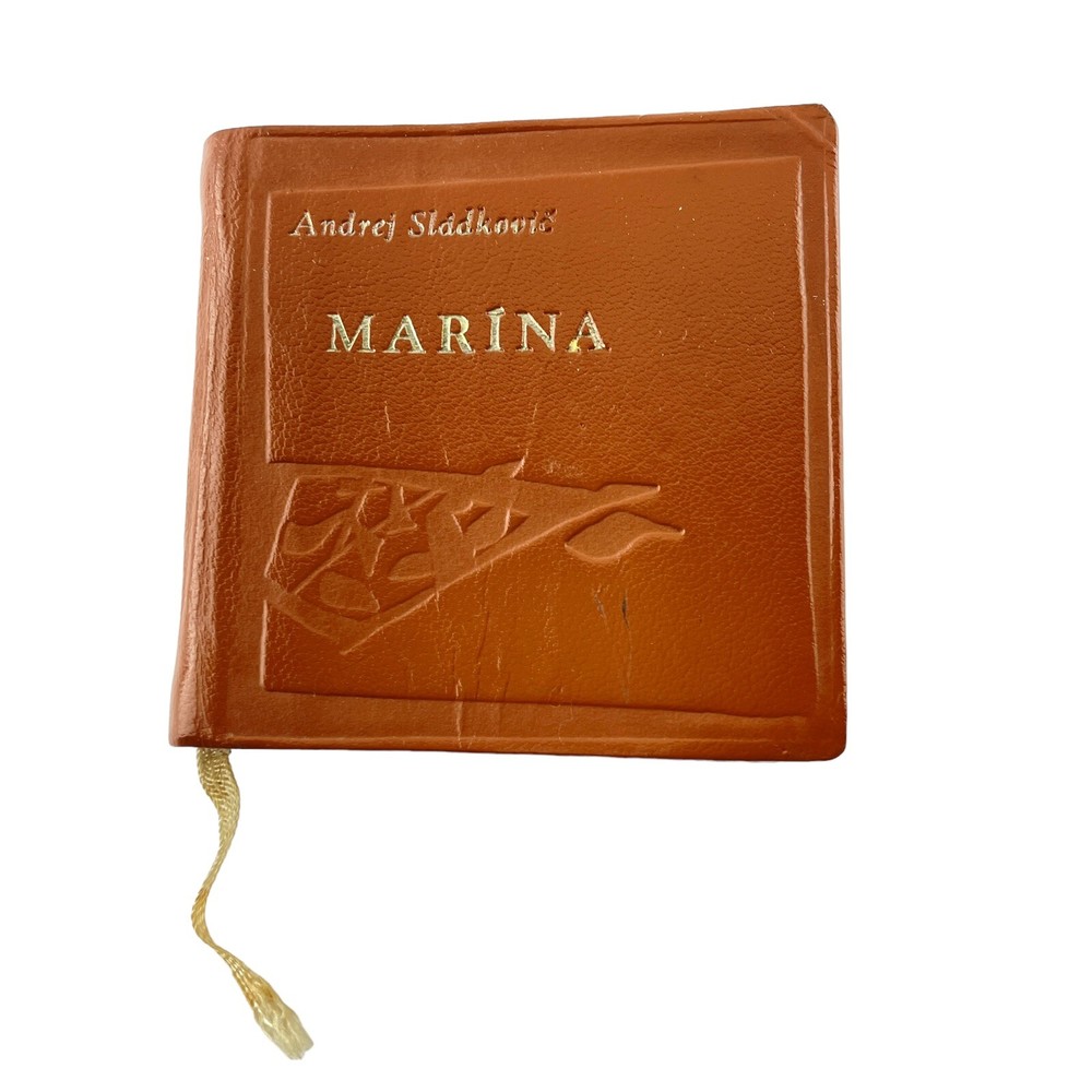 Andrej Sladkovic Marina Poetry Book Features the longing and love the poet has for Marina. Language: Czech Literary genre: Lyric Front piece designed by Ivan Schurman. Slovak Publishing 1965 Leather Bound and Embossed Size: 3.25x3.25" Condition: Good pre-owned condition. Light wear on cover. S hips promptly. Thank you! 202404 B01 1 4o
