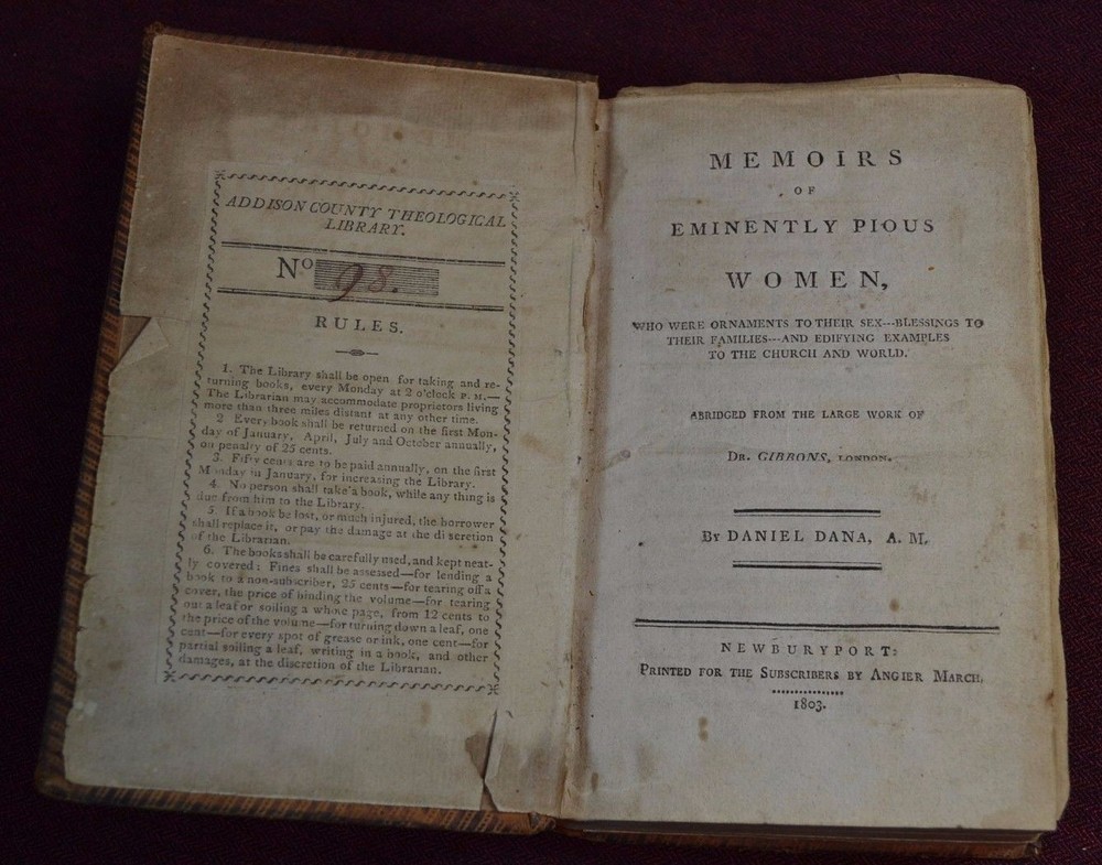 Dana, Daniel. Memoirs of Eminently Pious Women. (Who were ornaments to their sex--blessings to their families and edifying examples to the church and world.) Newburyport: Printed for the subscribers by Angier March, 1803. Abridged from the large work by Dr, Gibbons. Antiquarian leather-bound book. Some wear and scuffs to leather cover. Lovely antiquarian library plate on front pastedown with rules of Addison County Theological Library. Some toning and light foxing to pages. Location: short Satisfaction guaranteed on all items offered. I will gladly combine auctions to save on postage. Custom over-engineered packaging to protect your purchases. I have had an open book store in Knoxville, TN since 1991. I am always interested in purchasing material for stock. Thank you for supporting full-time used book stores. If you are interested in our social media, search The Book Eddy, thebookeddy or bookeddy. John Coleman, Bookseller The Book Eddy P O Box 3832 Knoxville, TN 37927 865 573 9959