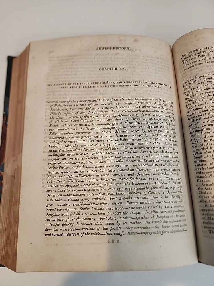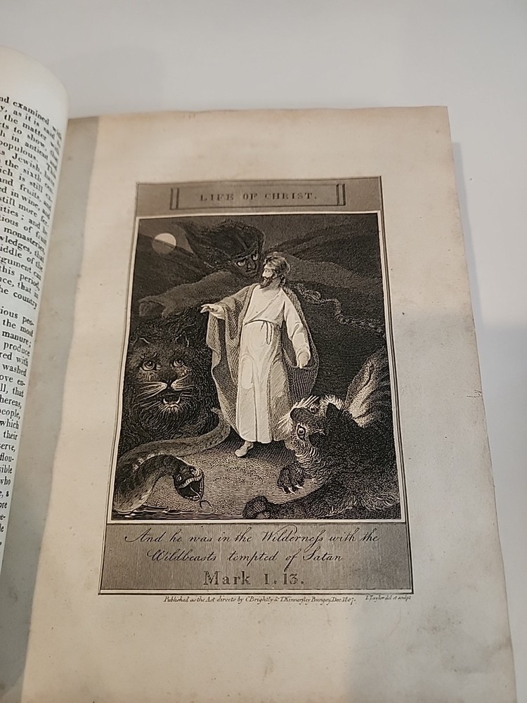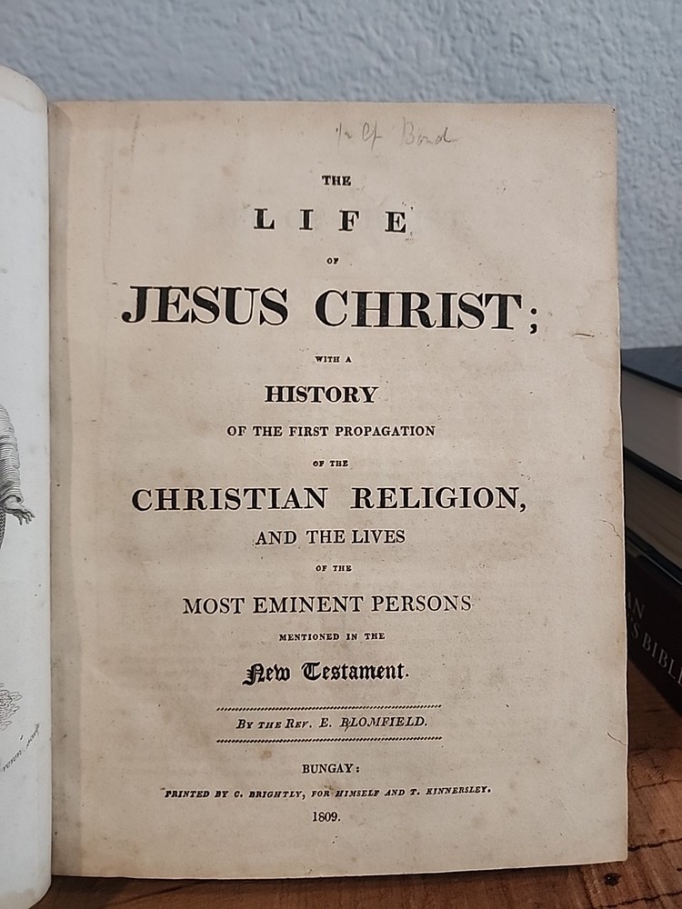 Antique 1809 "The Life of Jesus Christ" by Rev. E. Blomfield – Half Leather, Bungay – Illustrated For sale is a rare and visually striking 1809 edition of "The Life of Jesus Christ; with a History of the First Propagation of the Christian Religion, and the Lives of the Most Eminent Persons Mentioned in the New Testament" by Rev. E. Blomfield. Printed by C. Brightly for himself and T. Kinnersley, Bungay, this substantial volume is a beautiful example of early 19th-century religious publishing and bookbinding. Book Details: Title: The Life of Jesus Christ; with a History of the First Propagation of the Christian Religion, and the Lives of the Most Eminent Persons Mentioned in the New Testament Author: Rev. E. Blomfield Publisher: C. Brightly, for himself and T. Kinnersley, Bungay Year: 1809 Binding: Half leather (spine and corners) with marbled boards Spine: Gilt decoration and red leather title label, "LIFE OF CHRIST" Illustrations: Includes engraved frontispiece ("The Ascension") and additional plates Language: English Condition: Binding is solid and attractive, with minor wear and rubbing to the leather and boards (see photos). Marbled boards are vibrant with some scuffing and edge wear consistent with age. Spine is decorated with gilt tooling and the title is bright and legible. The engraved frontispiece and title page are intact and well-preserved. Interior pages show typical age-related toning, scattered foxing, and minor stains. No major tears or missing pages observed. Sample chapter shown: "Jewish History, Chapter XX" (see photos for content and condition). Please review all provided photos for a complete view of condition. Who Would Be Thrilled to Own This Book? Antiquarian Book Collectors: A genuine piece of early 19th-century Christian literature in its original decorative binding, highly desirable for collectors of rare religious texts and fine bindings. Historians & Theologians: Offers a detailed account of the life of Christ, the early Christian church, and biographical sketches of key New Testament figures, providing valuable insight into early 1800s Christian scholarship. Religious Institutions & Libraries: A distinguished addition to any rare book room or special collection, especially for organizations devoted to Christian heritage, biblical studies, or the history of publishing. Gift for a Pastor, Scholar, or Devout Christian: For those who cherish the roots of their faith, this volume is both a spiritual and historical treasure.