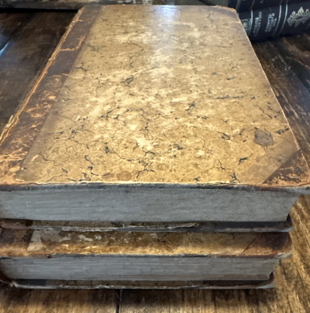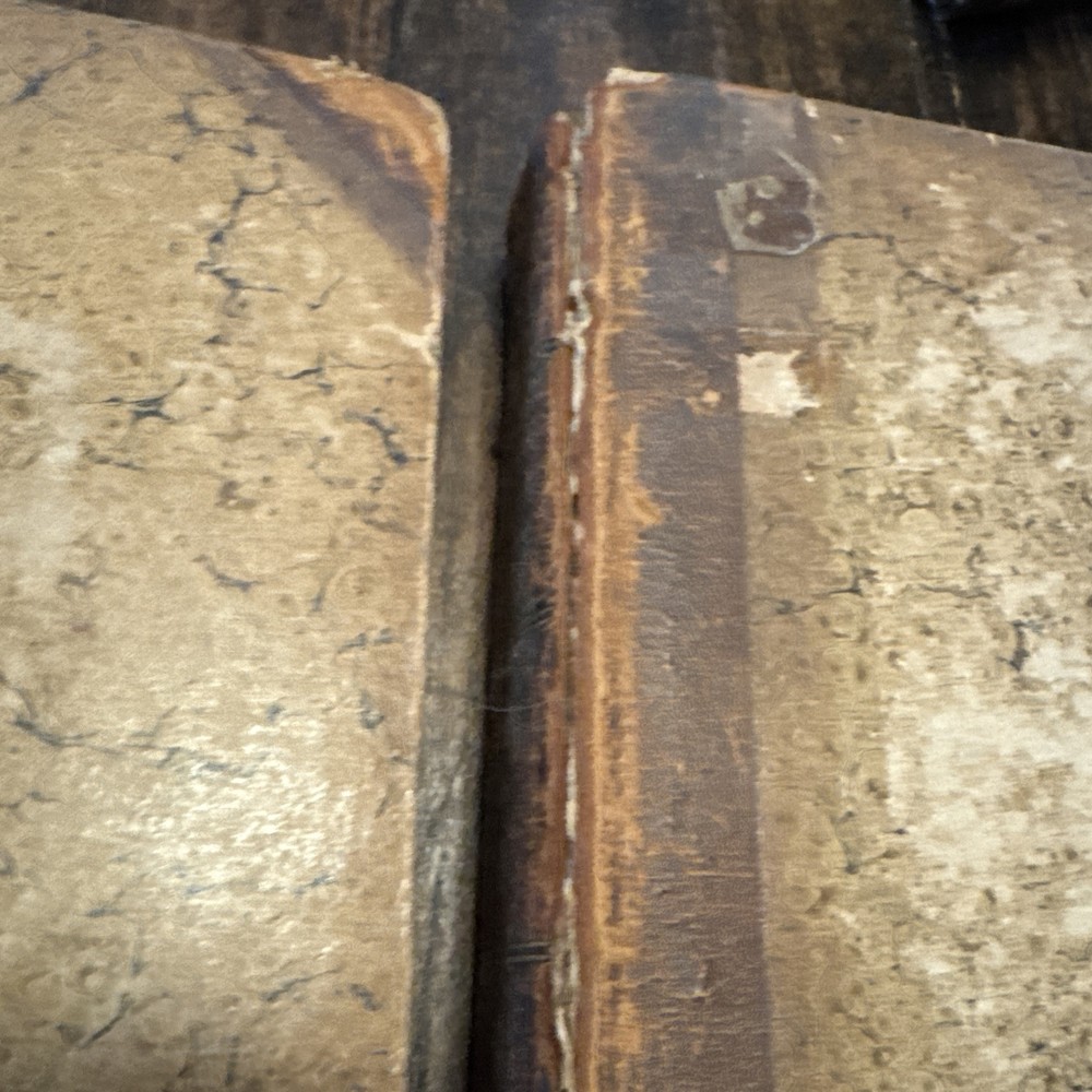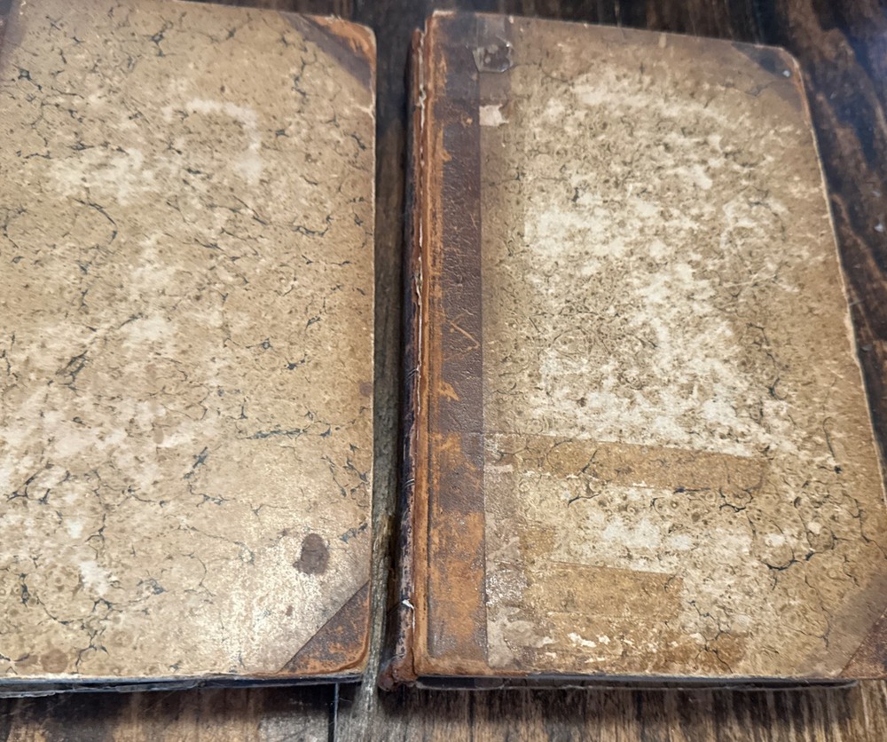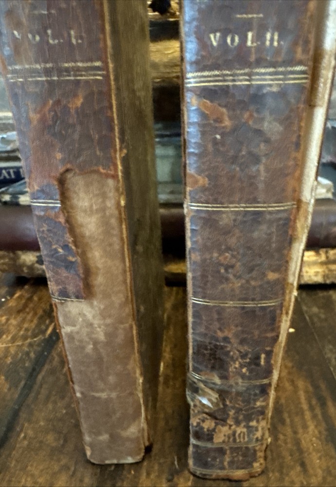 2 Antique 1820 First Edition leather bound books with heavy wear consistent with aging ,spines have gold gilt titling, volume 1 has heave leather wear and missing pieces of leather , heavy discolored pages with heavy age stains , cracked hinges, detached boards, title pages and pictorial frontispieces have a piece cutout, inscribed to the previous owner , earmarked pages, some rips and tears to the pages ,etc please see pictures for more details. SOLD AS IS Both Measure 8.5” x5.5 “ and are 205 years old - We have hundreds of books listed and combine shipping on multiple purchases (K)