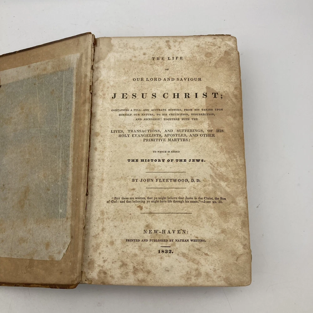 This is a rare and lovely Antique 1832 "The Life of Our Lord and Savior Jesus Christ" by John Fleetwood, Leather. Pre-owned in good antique condition. Noticeable wear is consistent with the item's age and use. Please see all of the photos for details. Cover: Hard cover Page count: 608 Weight: 2 lbs., 2 oz. Measurements: 9'' x 5.5'' x 2'' We do combine shipping whenever possible; check out the other listings at our eBay store. Our items come from a smoke-free, pet-free home. Please message me with any questions. THANK YOU FOR LOOKING!
